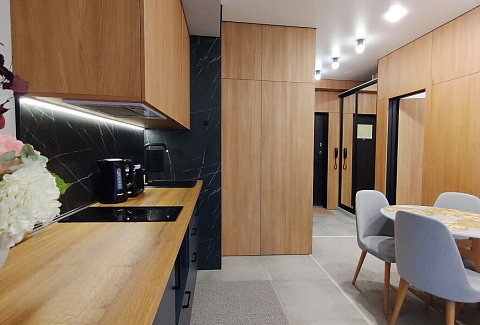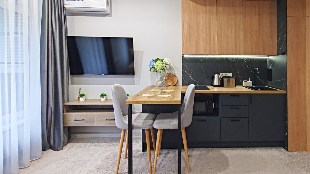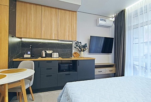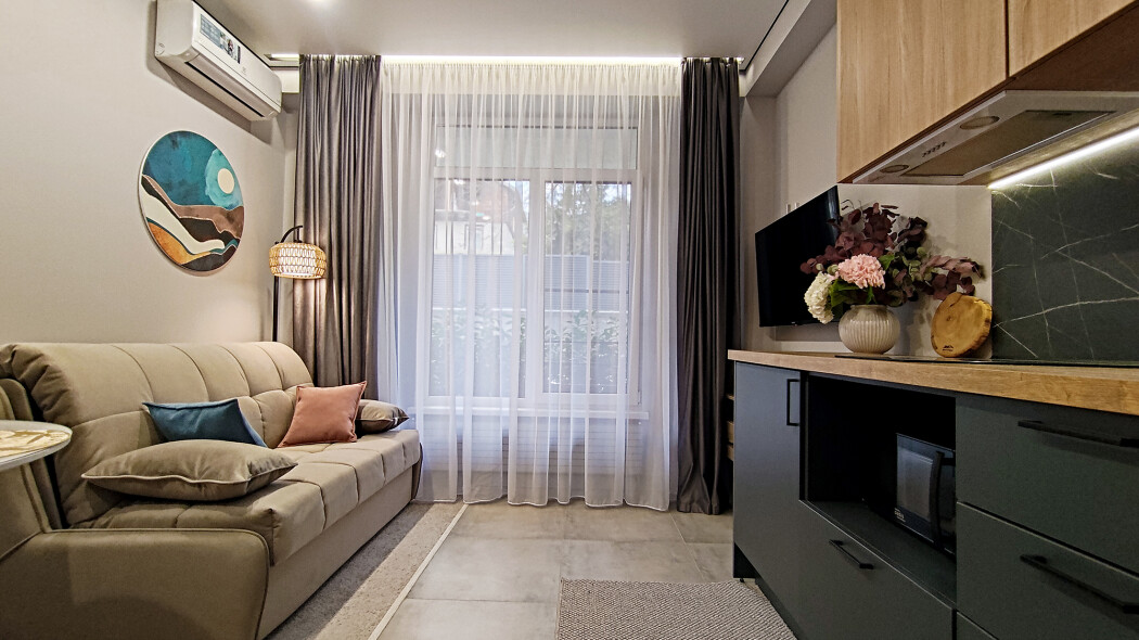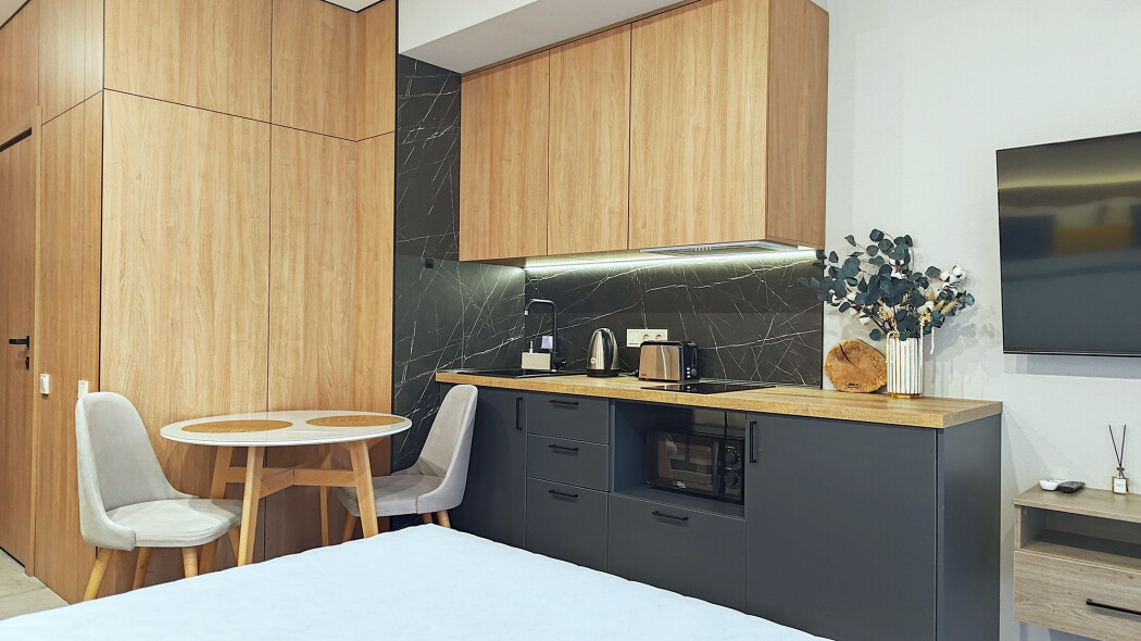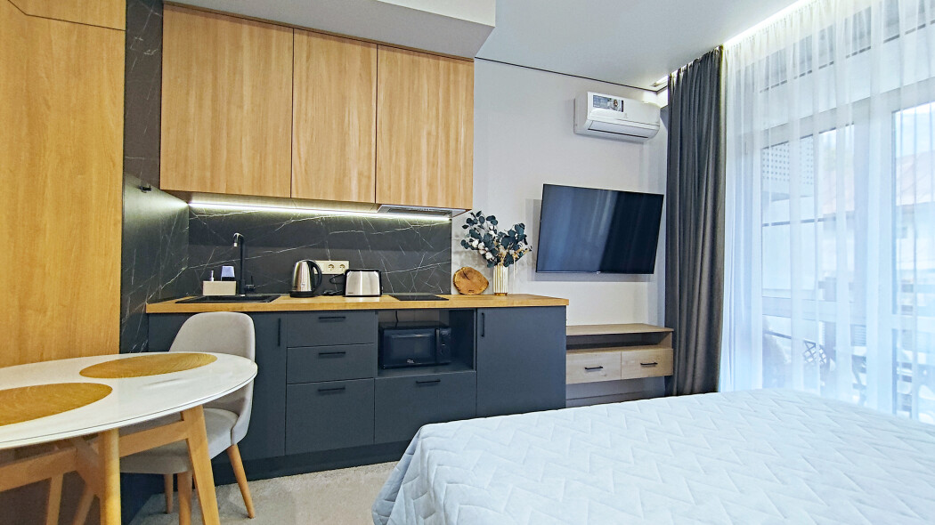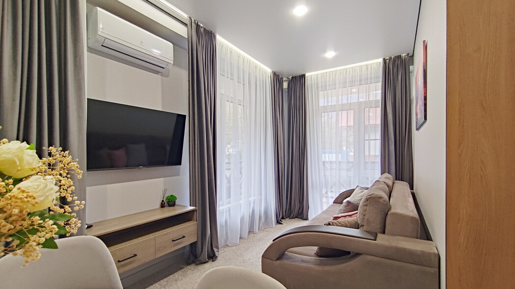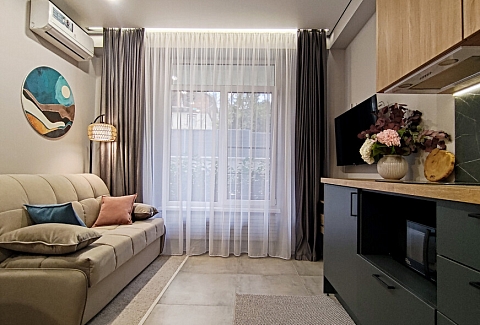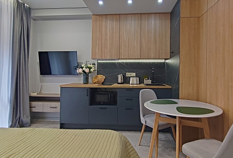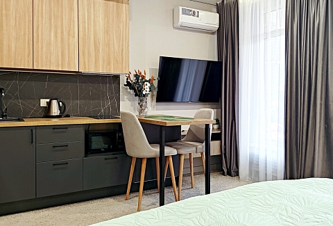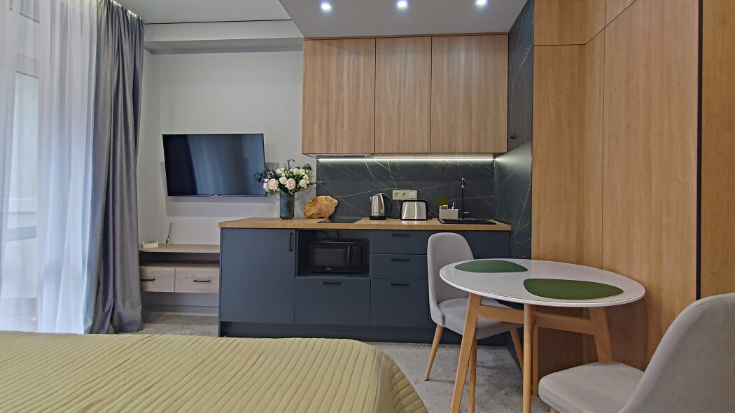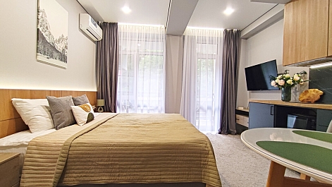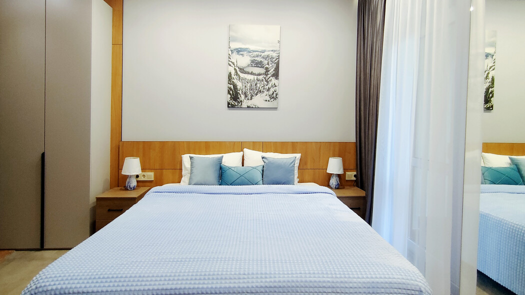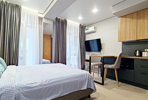 В номере: зеркало, кровать двуспальная, прикроватные тумбочки, стол, стулья, шкаф, кондиционер, кофемашина, микроволновая печь, набор посуды, плита электрическая, стиральная машина, телевизор ЖК, утюг, холодильник, электрочайник