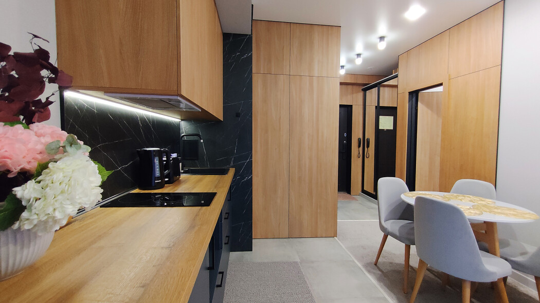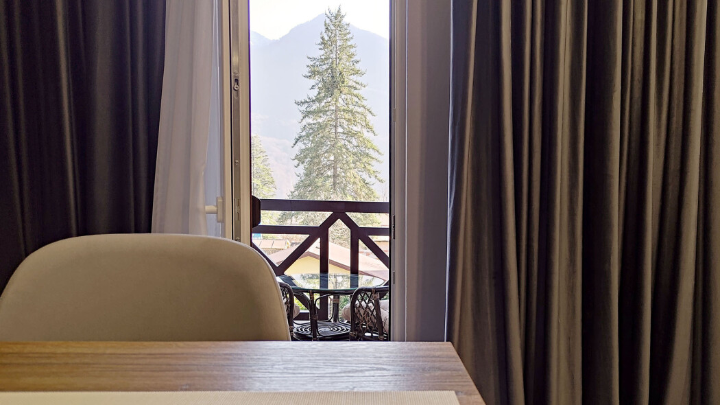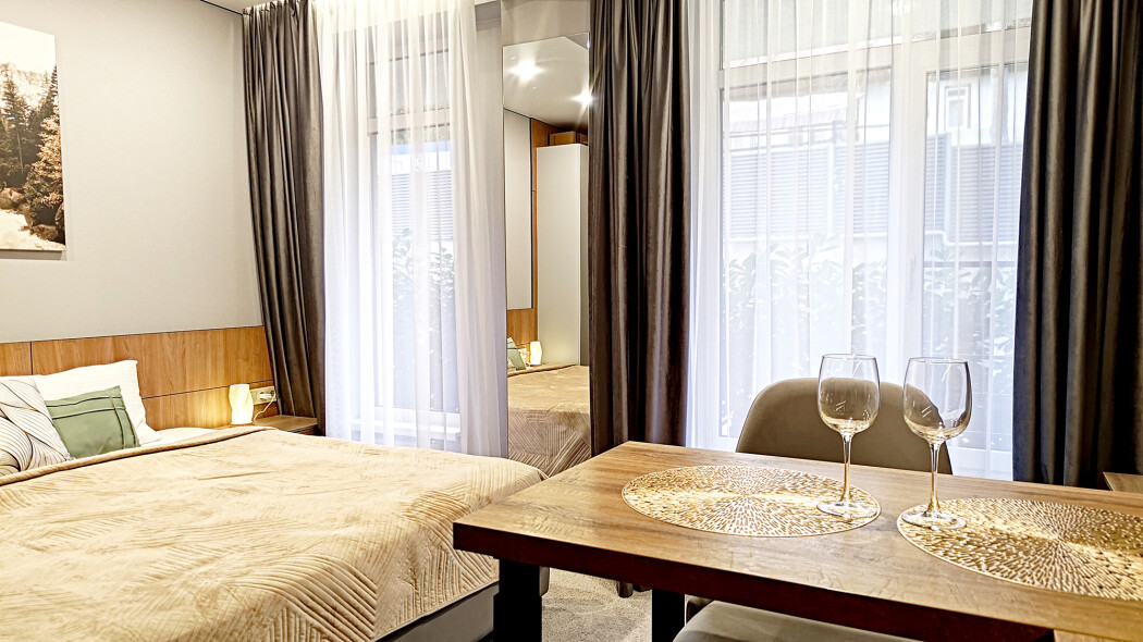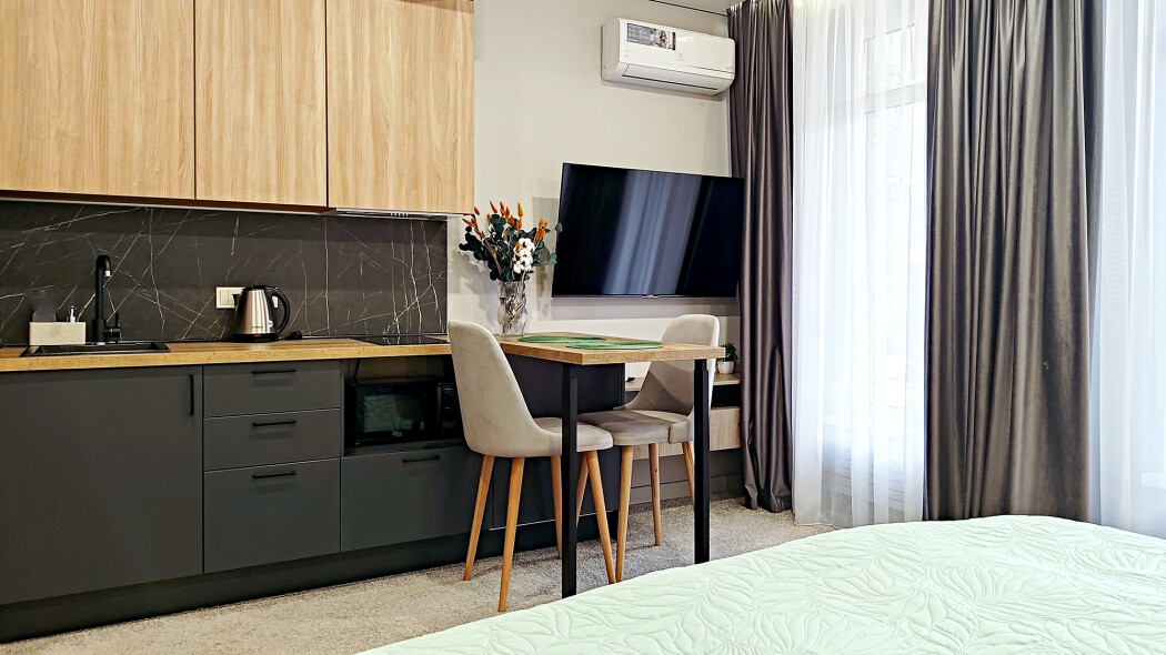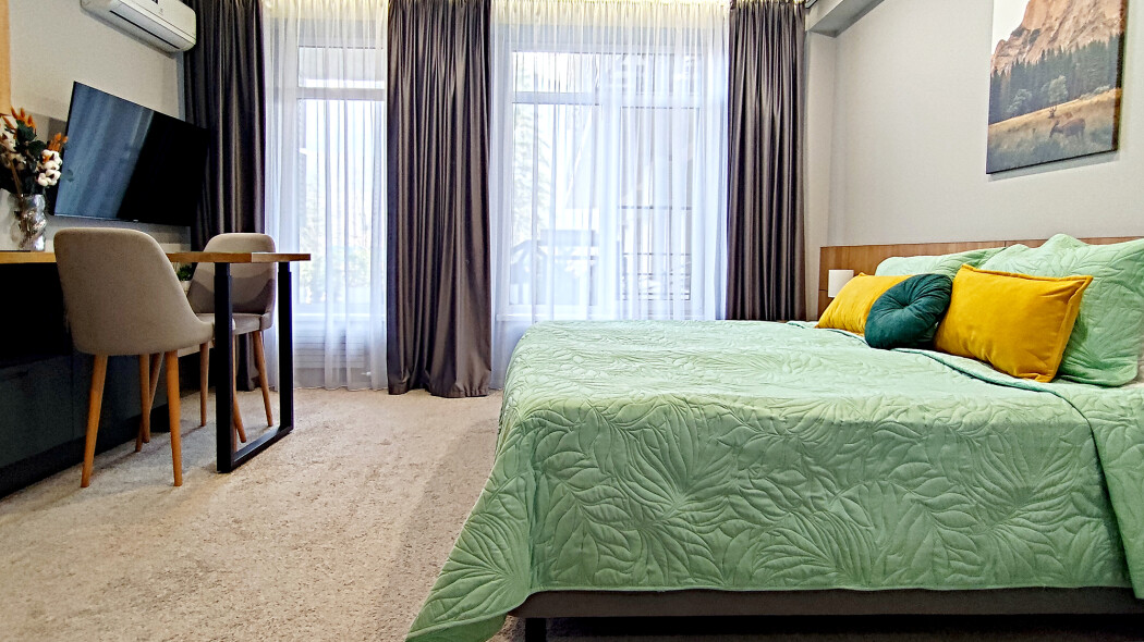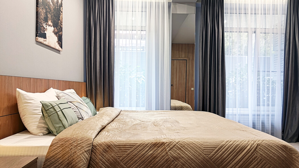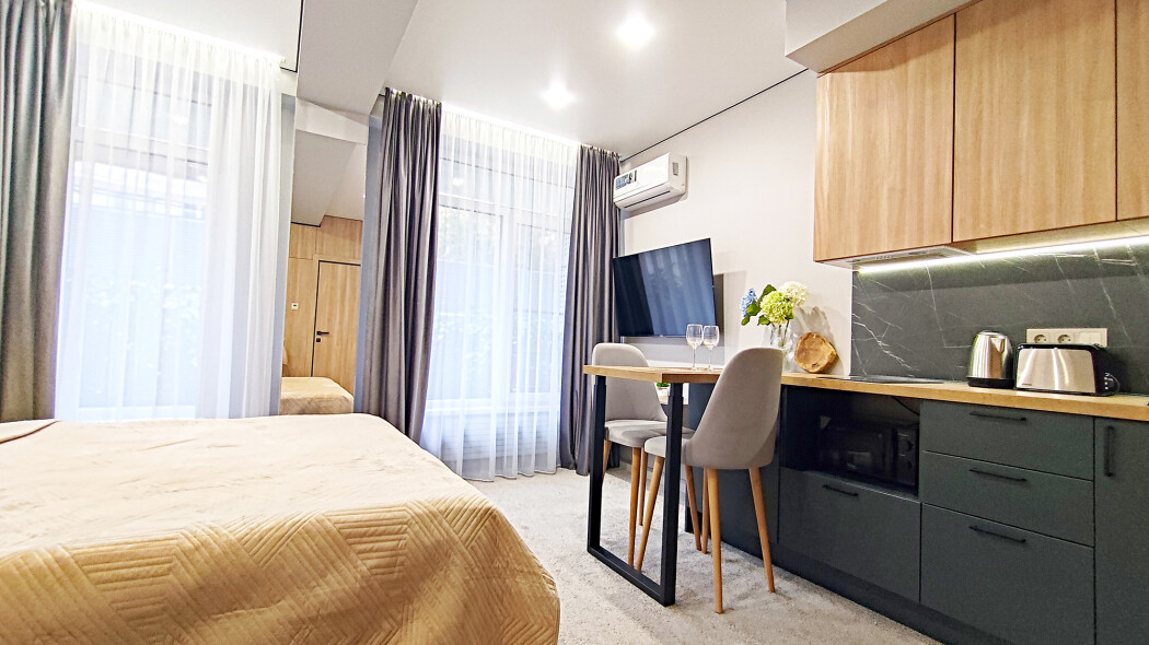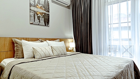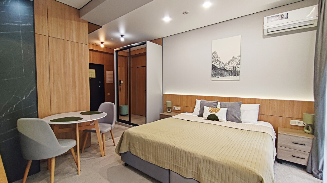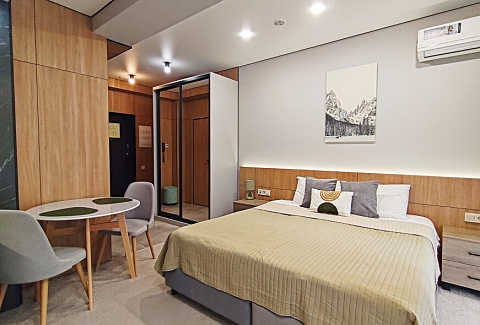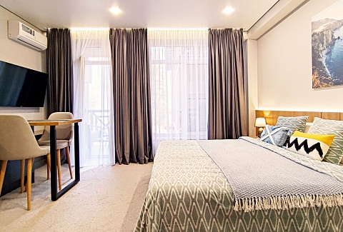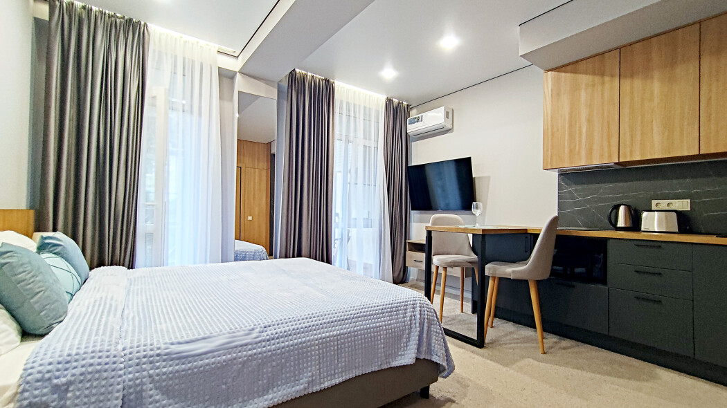 В номере: вешалка, зеркало, кровать двуспальная, стол, стулья, шкаф, кондиционер, кофемашина, набор посуды, плита электрическая, сейф, стиральная машина, телевизор ЖК, утюг, холодильник, электрочайник