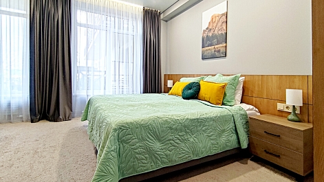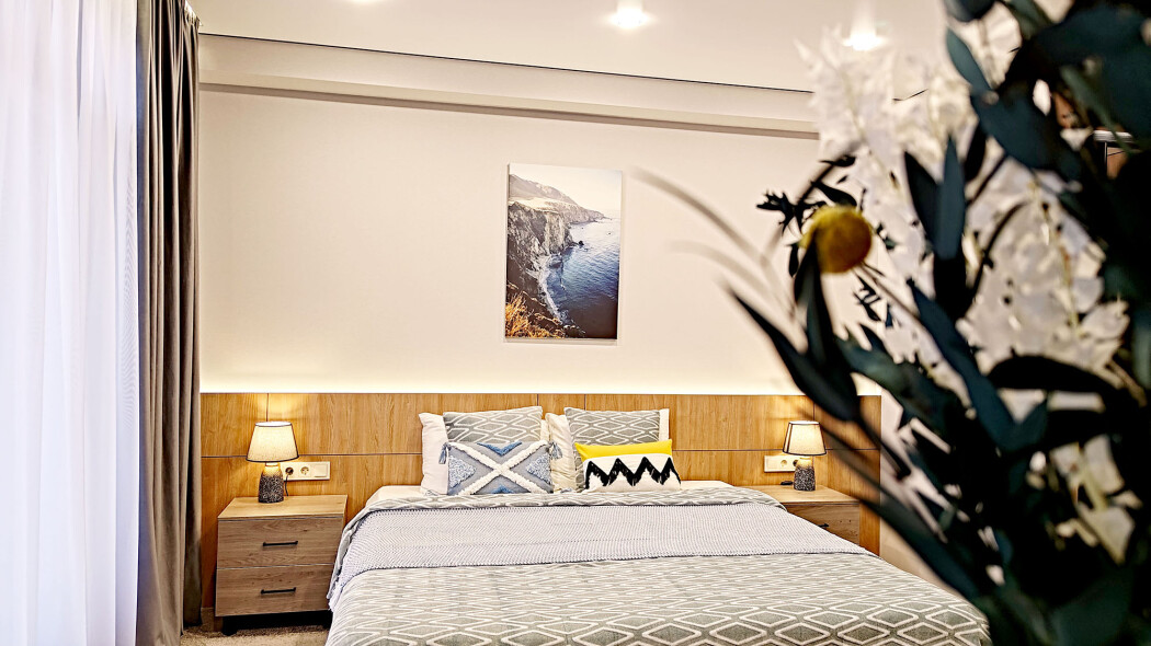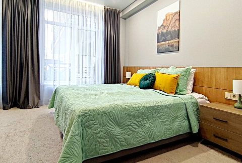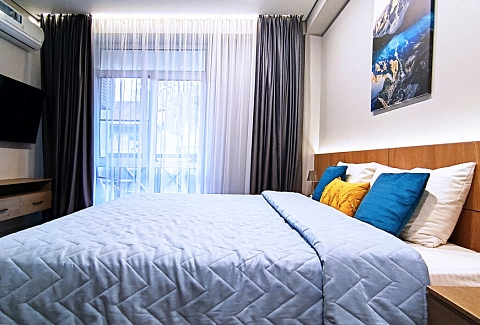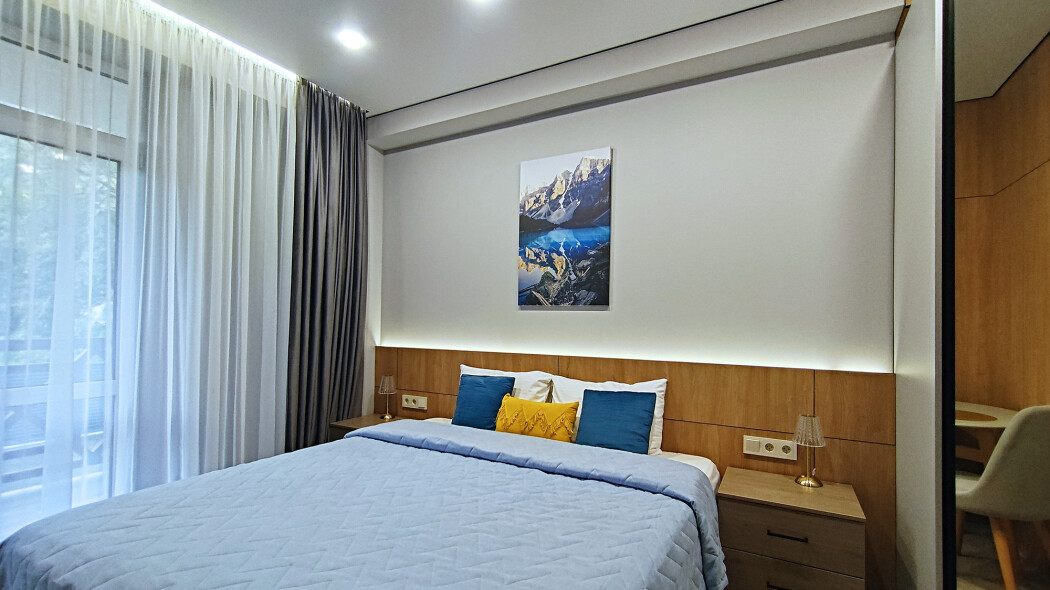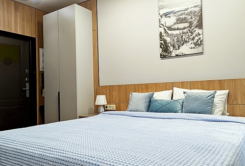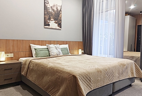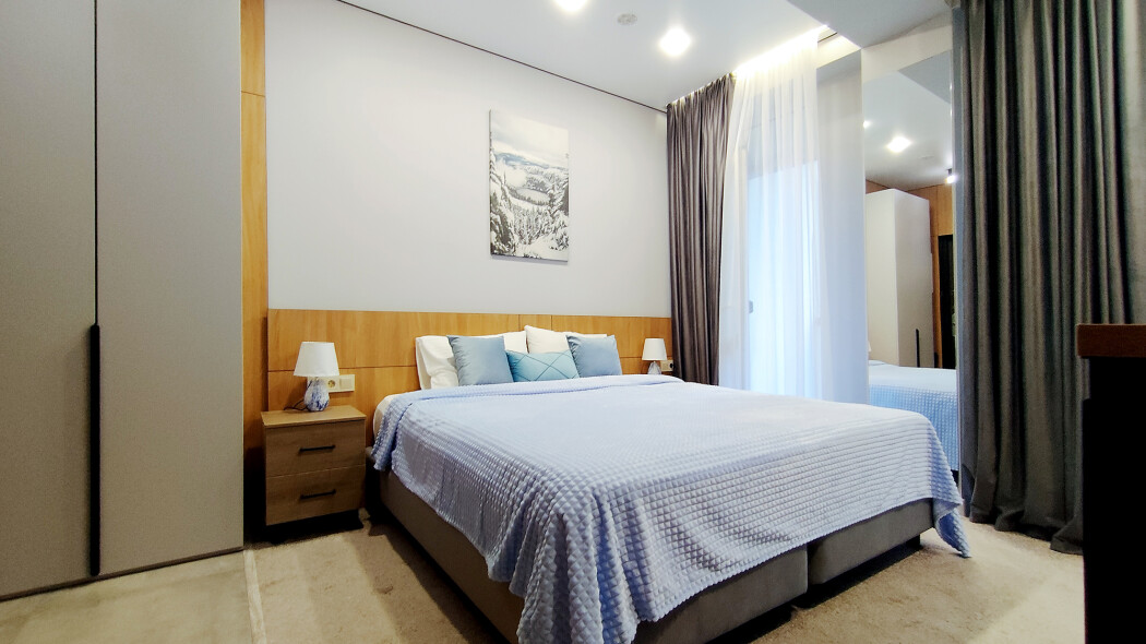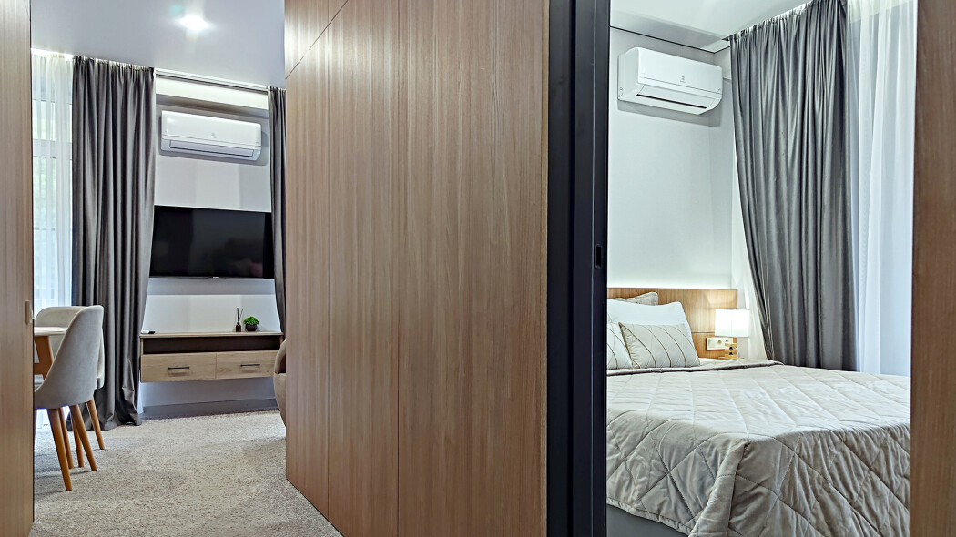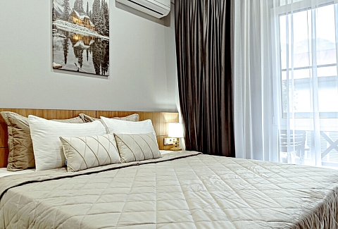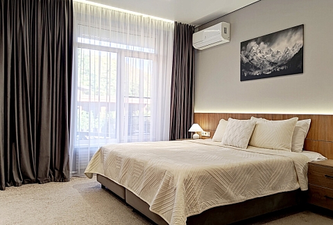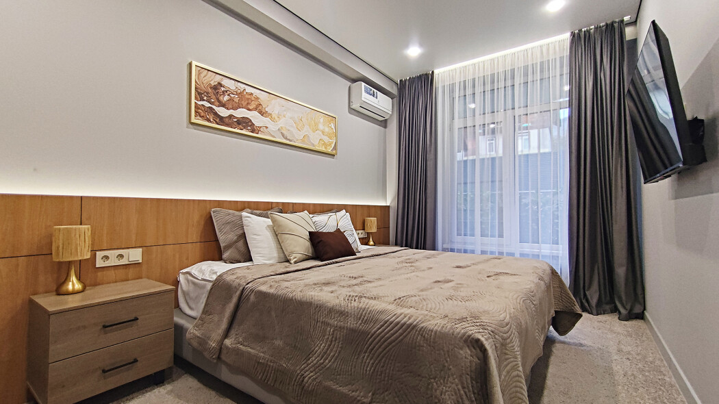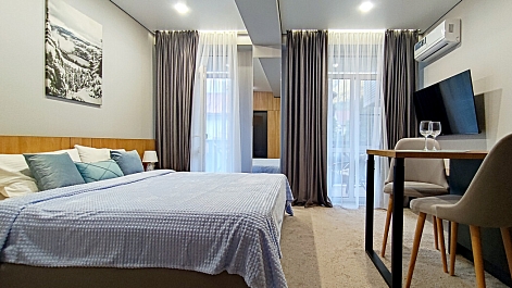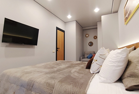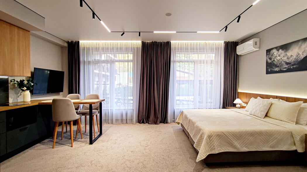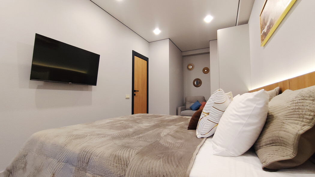 В номере: вешалка, зеркало, кресло-кровать, кровать двуспальная, прикроватные тумбочки, стол, стулья, шкаф, кондиционер, кофемашина, микроволновая печь, набор посуды, плита электрическая, сейф, стиральная машина, телевизор ЖК, утюг, холодильник, электрочайник