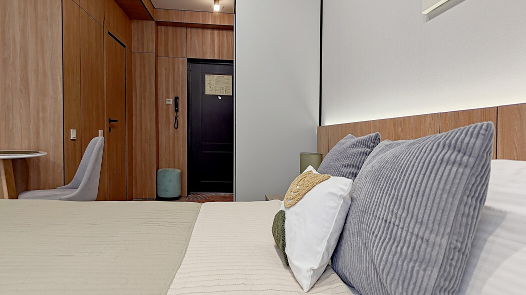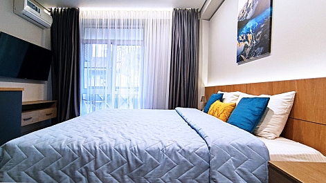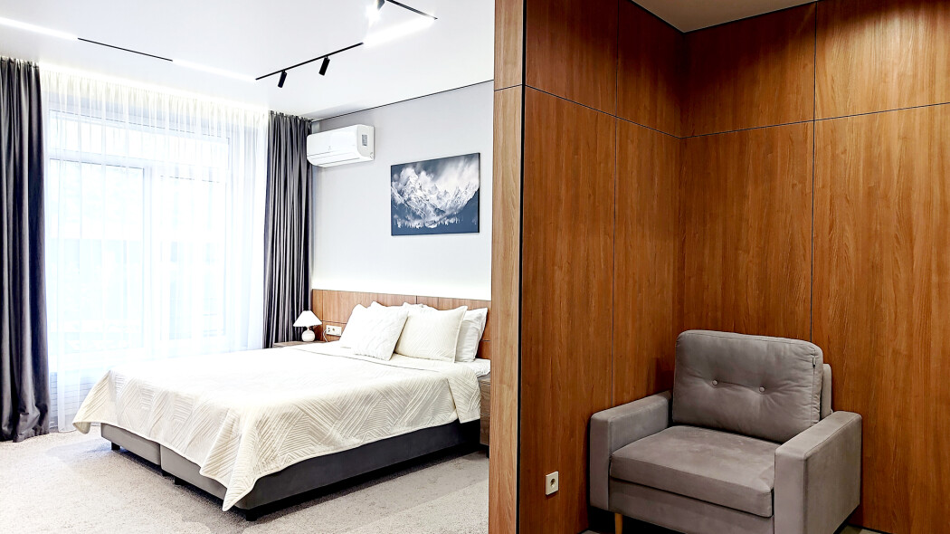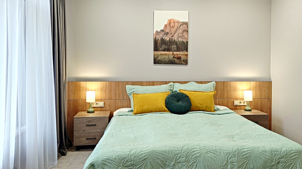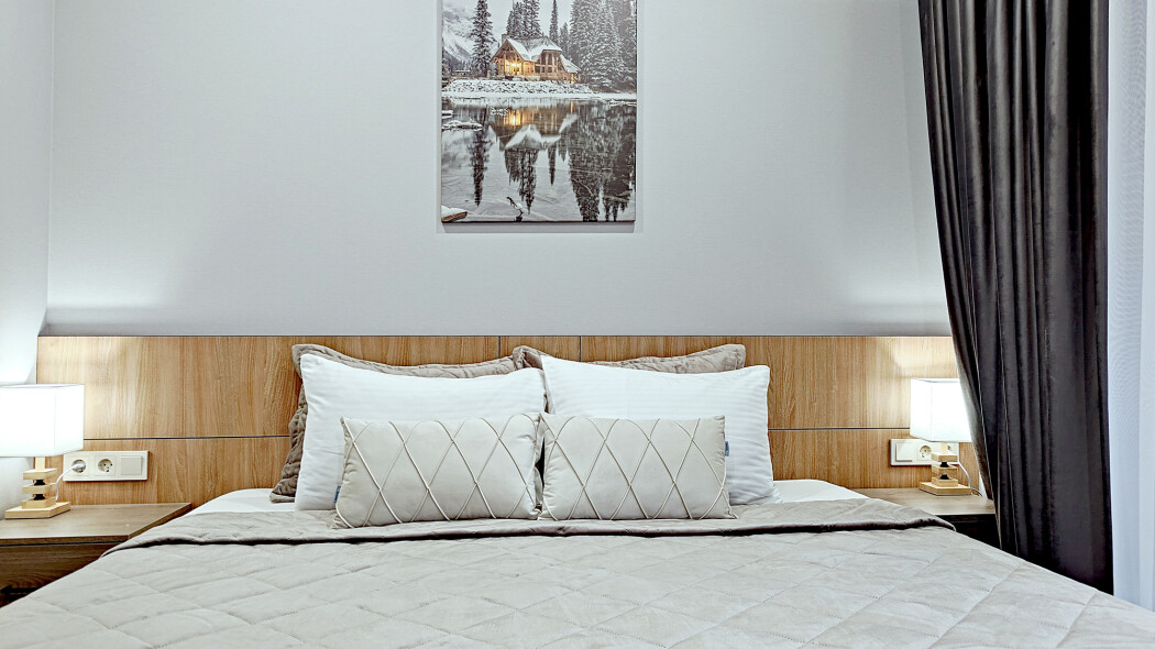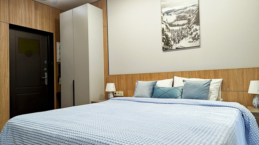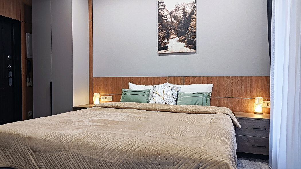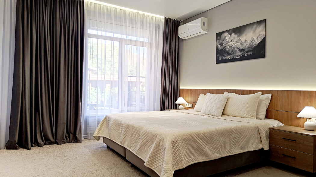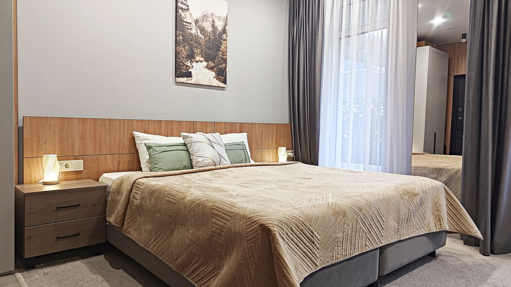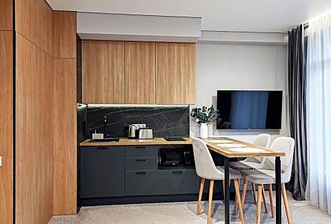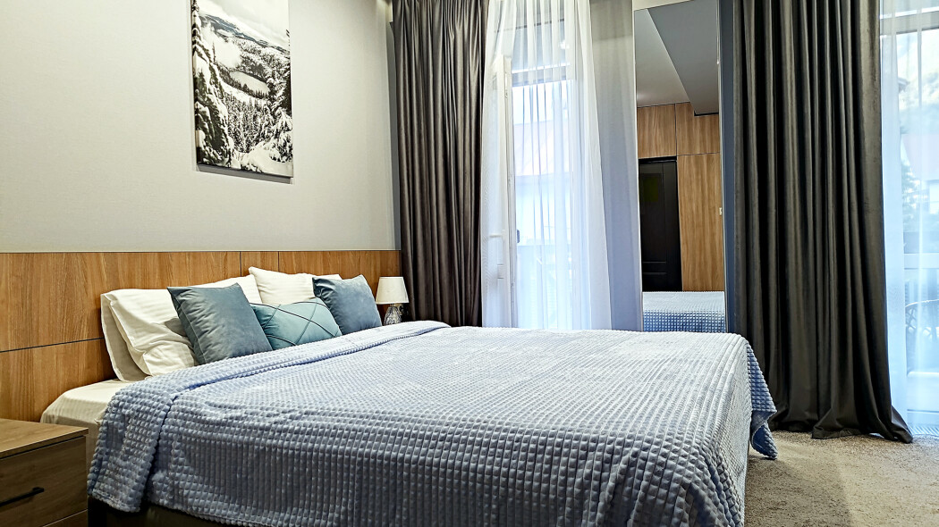 В номере: вешалка, зеркало, кресло-кровать, кровать двуспальная, прикроватные тумбочки, стол, стулья, шкаф, кондиционер, кофемашина, микроволновая печь, набор посуды, плита электрическая, сейф, стиральная машина, телевизор ЖК, утюг, холодильник, электрочайник