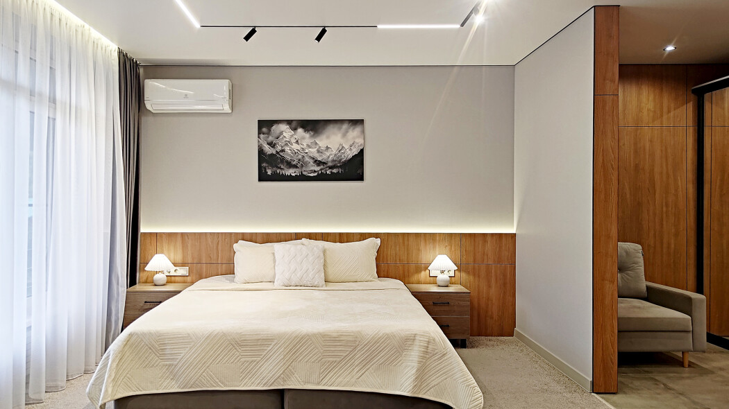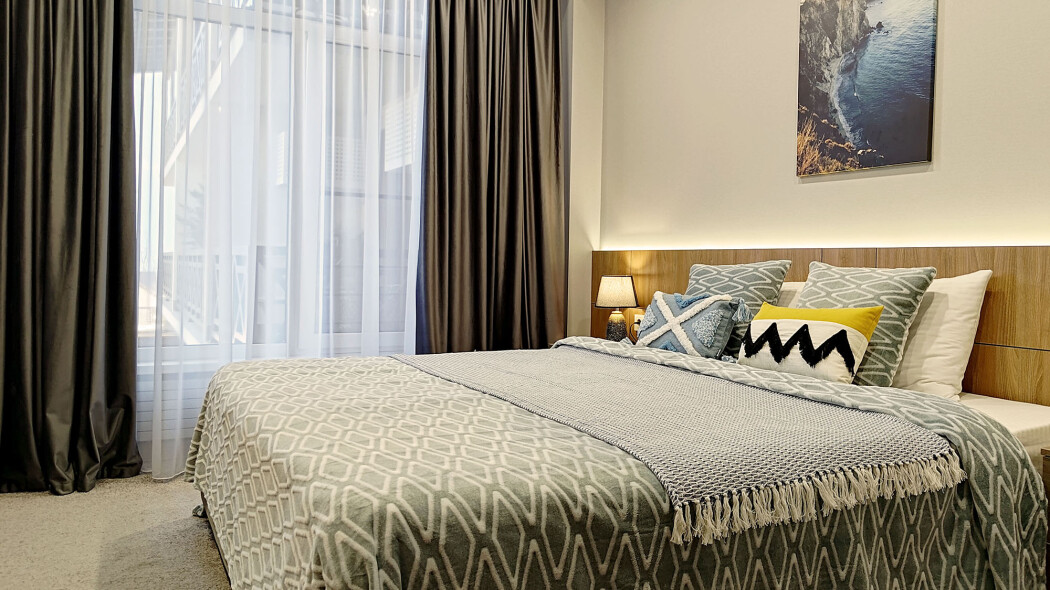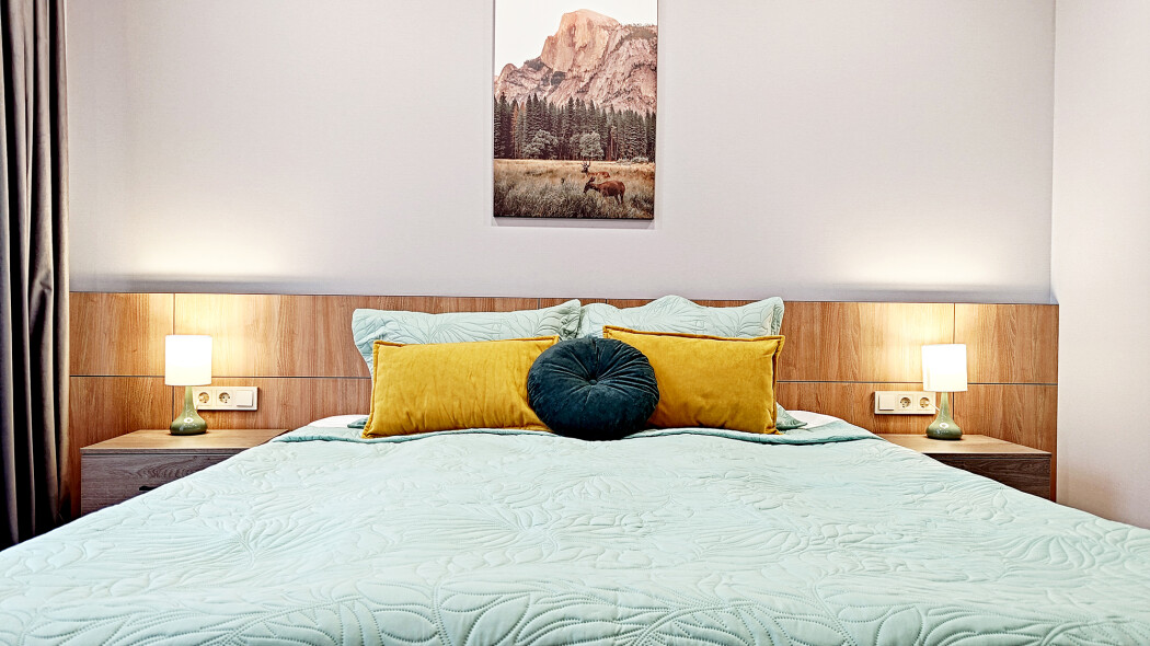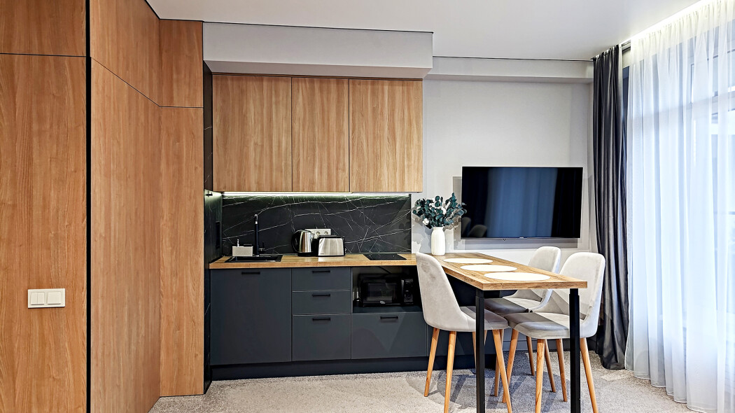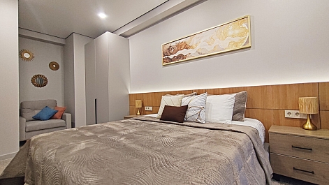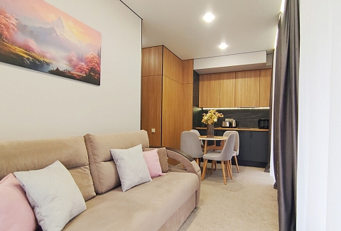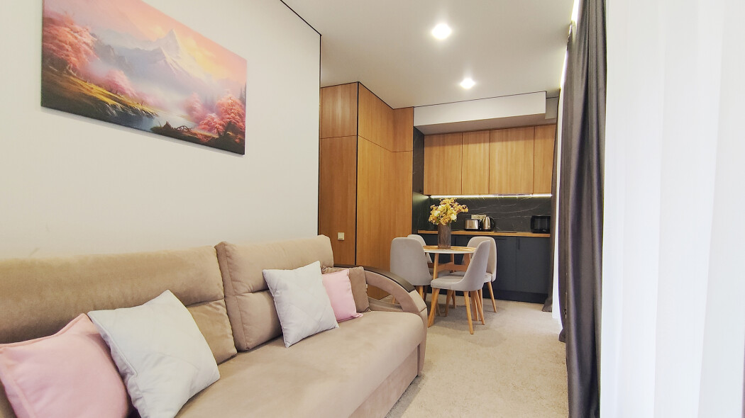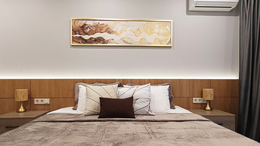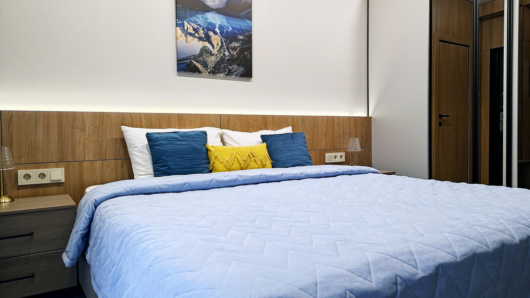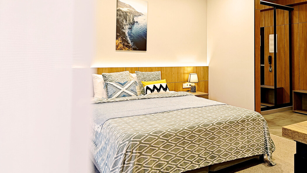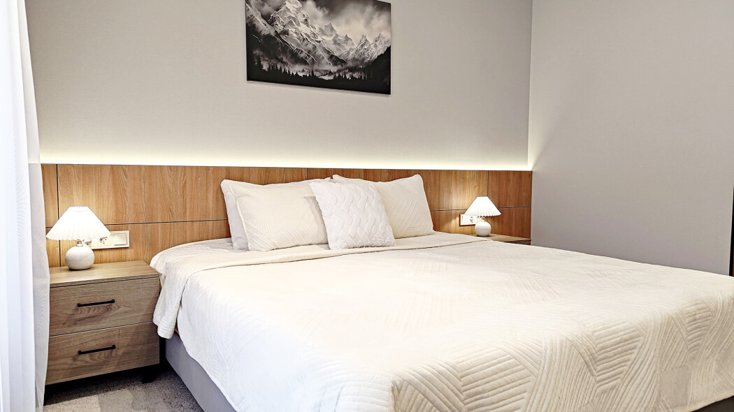В номере: вешалка, зеркало, кресло-кровать, кровать двуспальная, прикроватные тумбочки, стол, стулья, шкаф, кондиционер, кофемашина, микроволновая печь, набор посуды, плита электрическая, сейф, стиральная машина, телевизор ЖК, утюг, холодильник, электрочайник