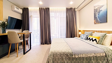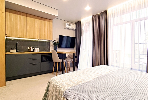 В номере: зеркало, кровать двуспальная, прикроватные тумбочки, стол, стулья, шкаф, кондиционер, кофемашина, микроволновая печь, набор посуды, плита электрическая, сейф, стиральная машина, телевизор ЖК, утюг, холодильник, электрочайник