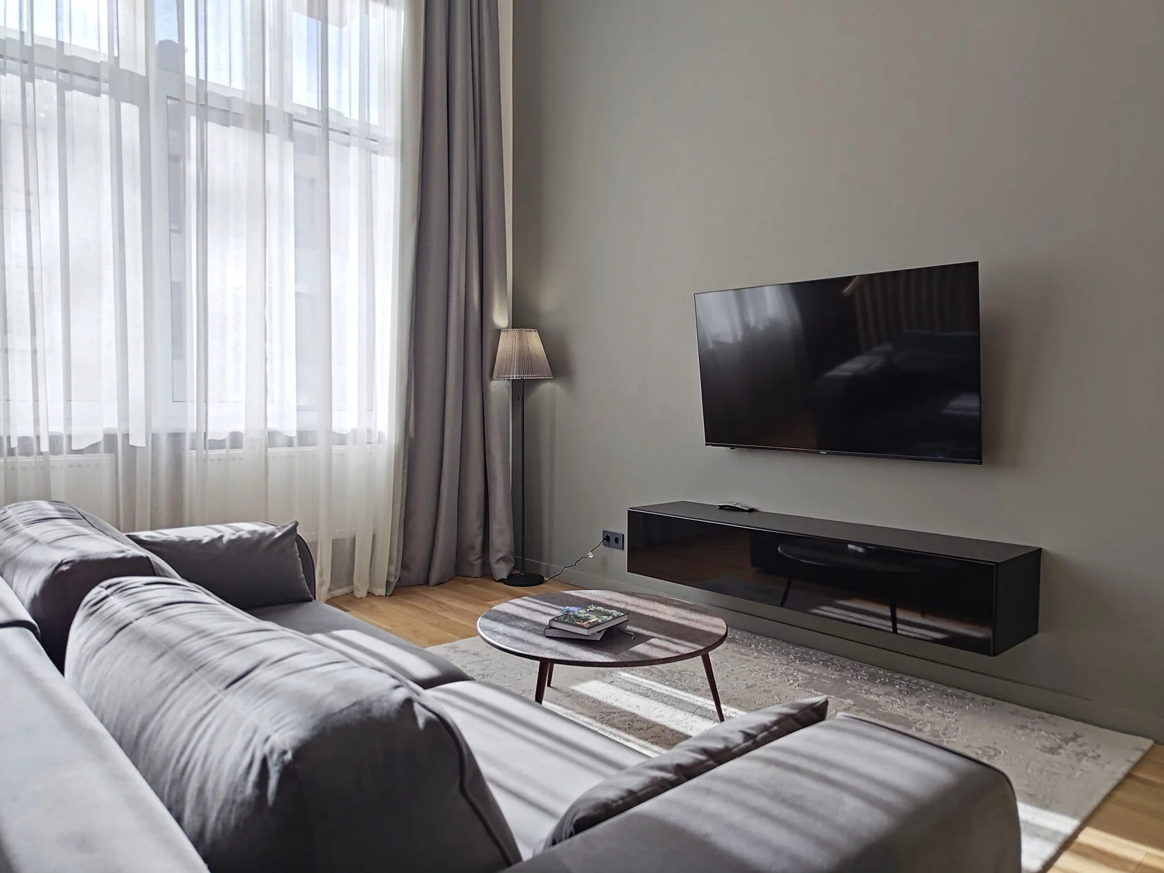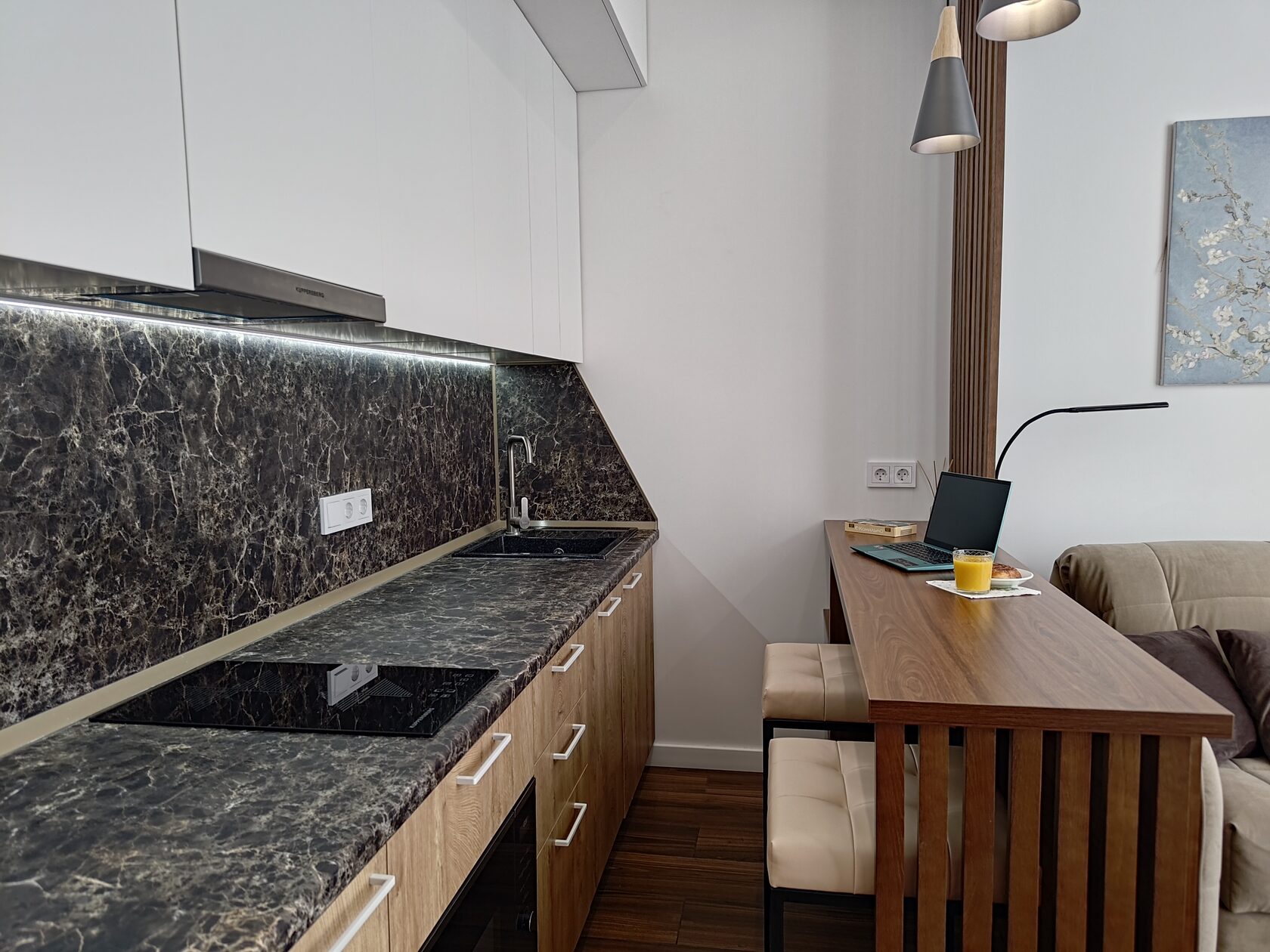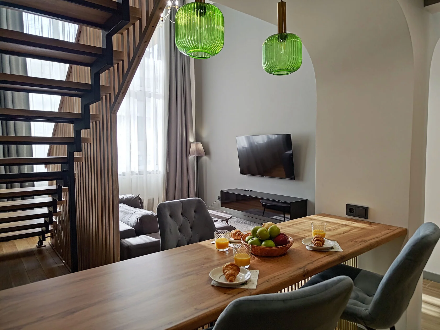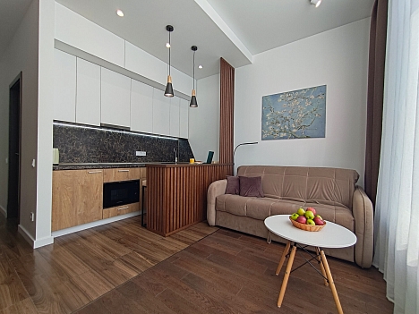 В номере: диван раскладной, столик журнальный, стол обеденный, стулья, шкаф, гладильная доска, кондиционер, микроволновая печь, набор посуды, плита индукционная, посудомоечная машина, стиральная машина, сушилка для белья, телевизор ЖК, утюг, холодильник, электрочайник