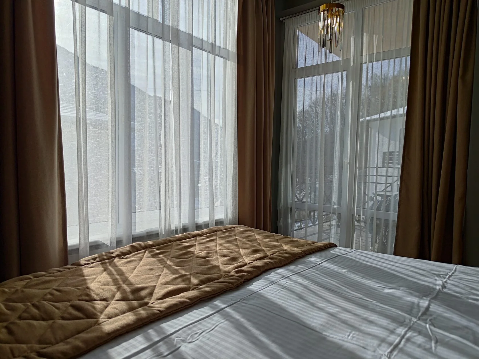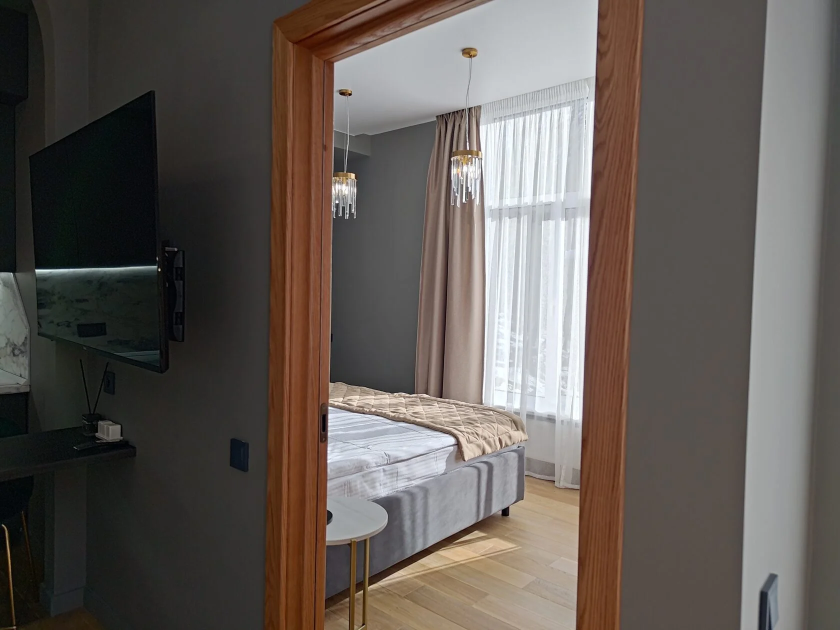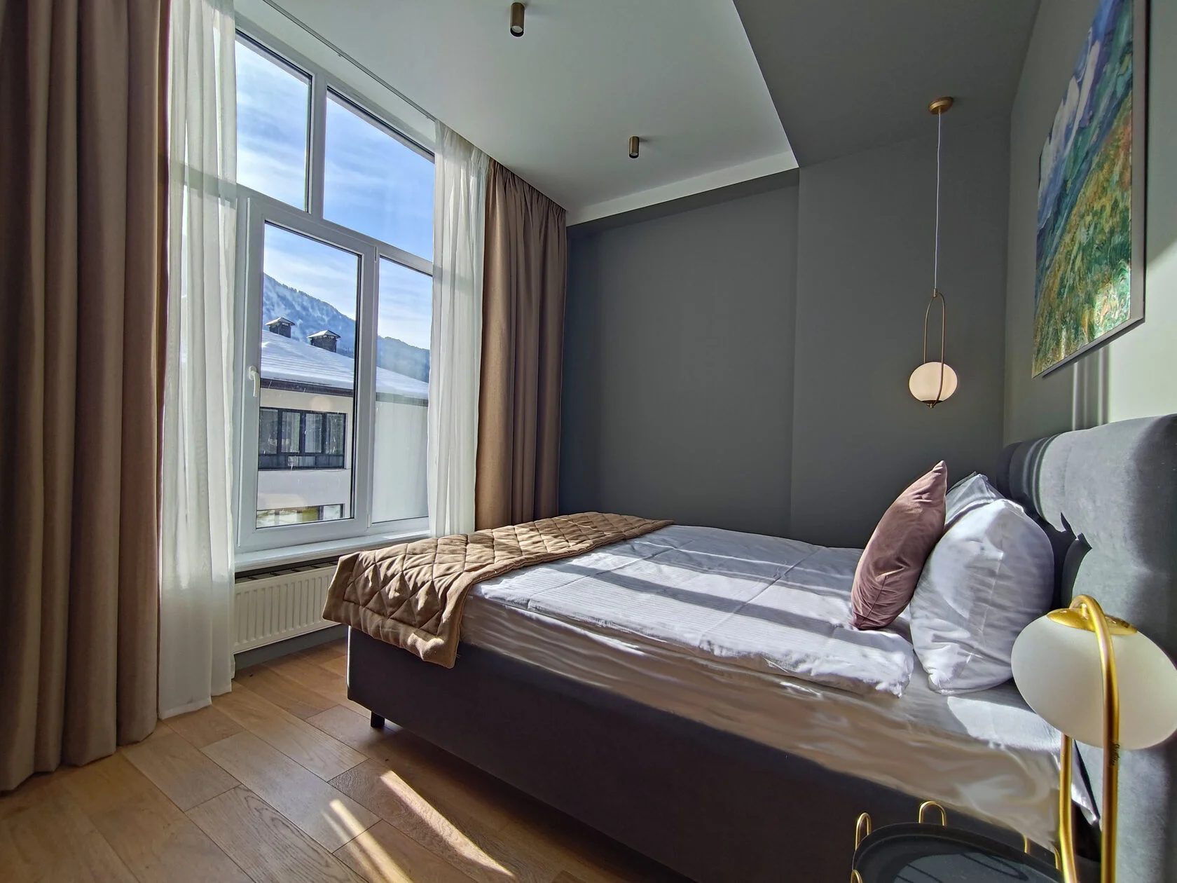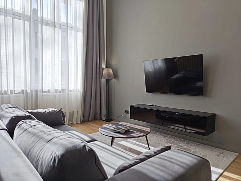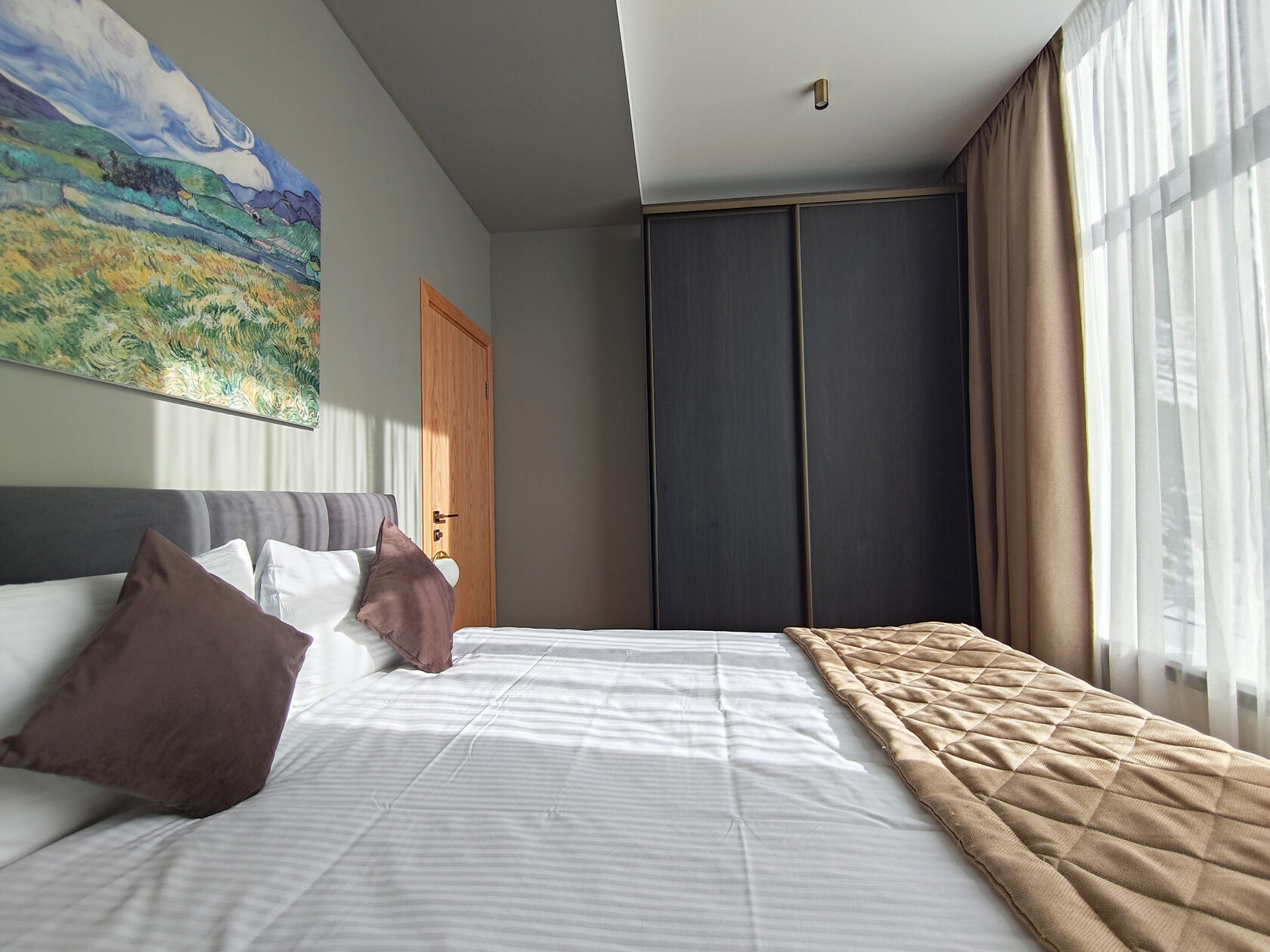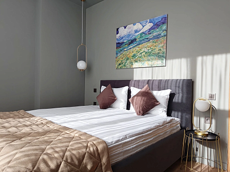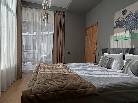 В номере: диван раскладной, зеркало, кровать двуспальная, прикроватные столики, пуфик, столик журнальный, столик туалетный, стол обеденный, шкаф, гладильная доска, кондиционер, микроволновая печь, набор посуды, плита индукционная, посудомоечная машина, стиральная машина, телевизор ЖК, утюг, холодильник, электрочайник