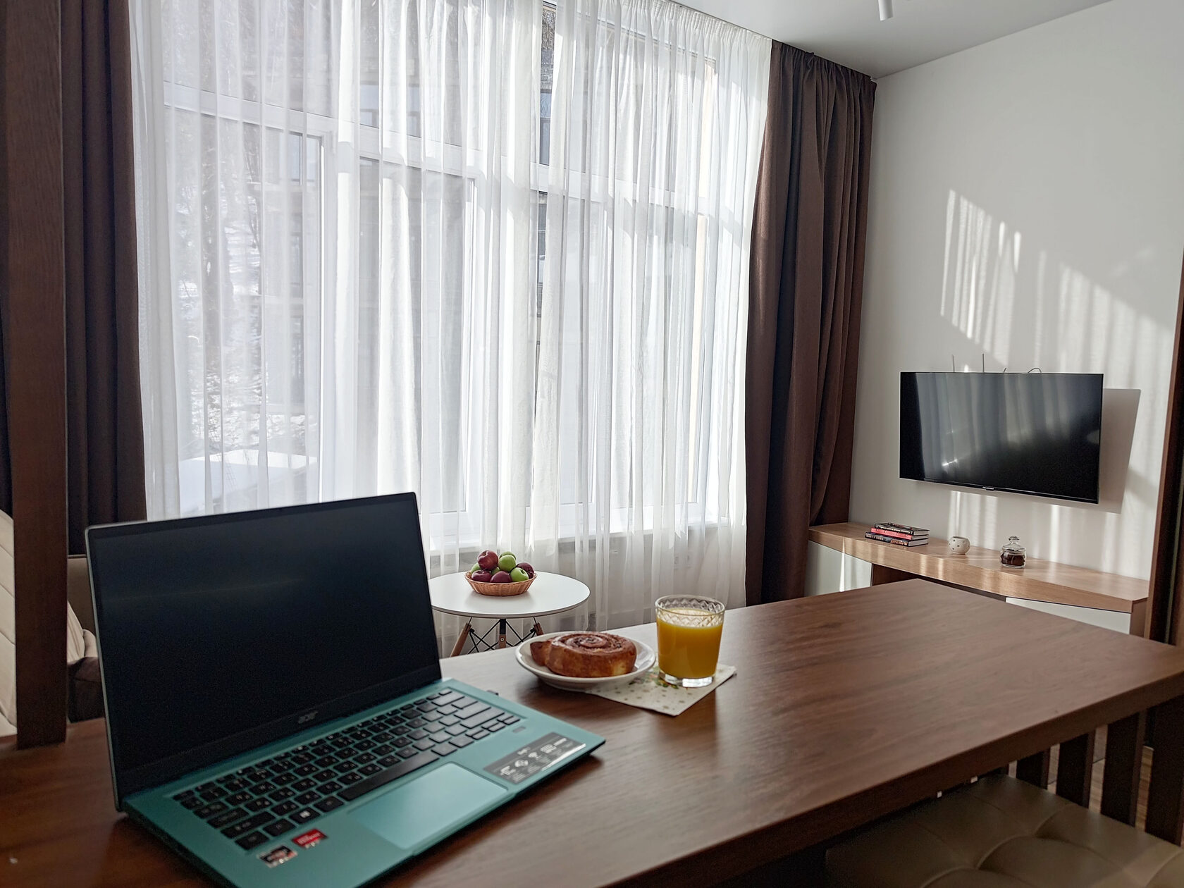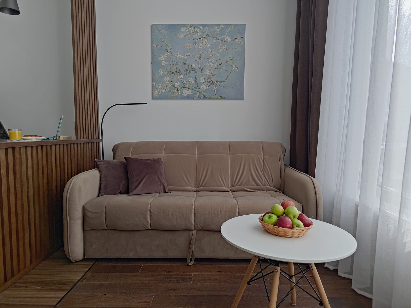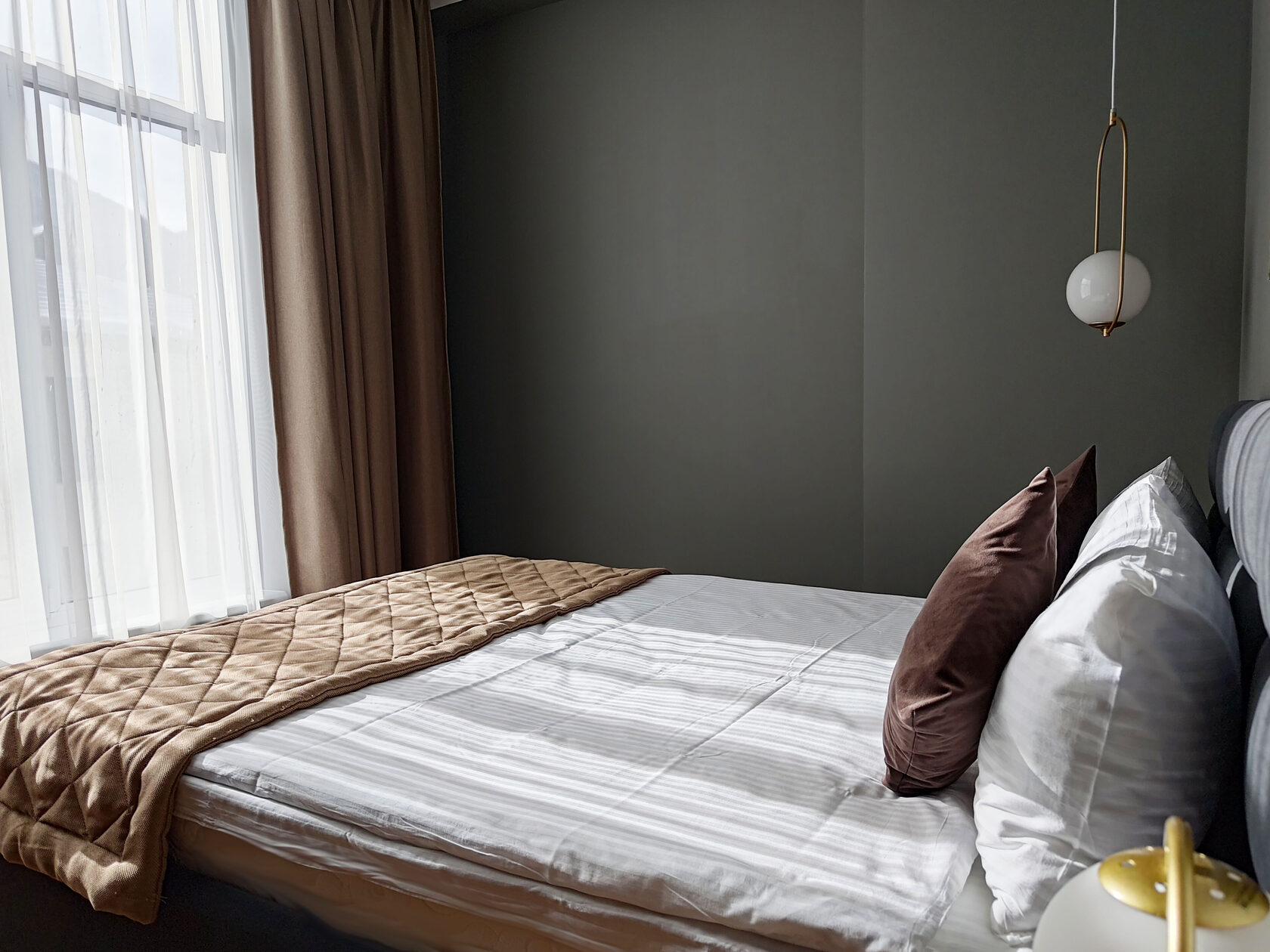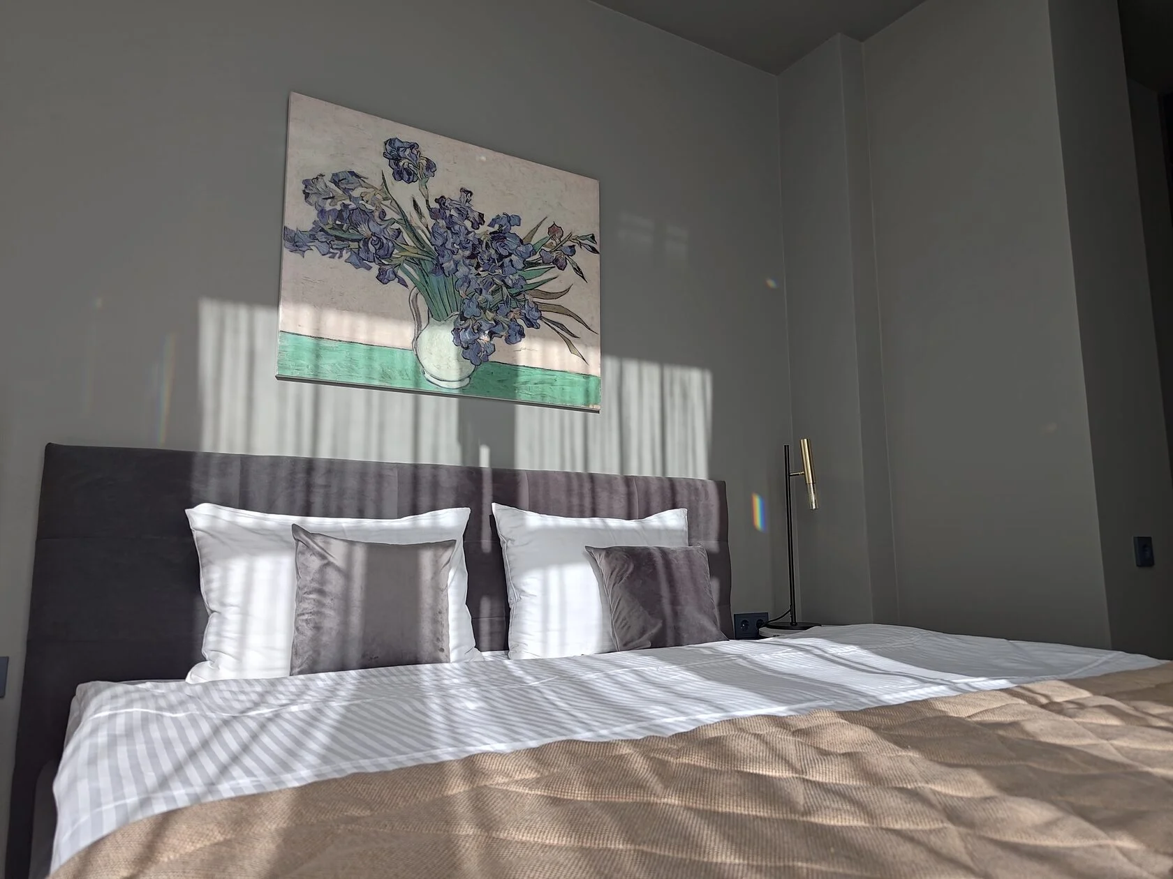 В номере: диван раскладной, зеркало, кровать двуспальная, прикроватные столики, пуфик, столик журнальный, столик туалетный, стол обеденный, шкаф, гладильная доска, кондиционер, микроволновая печь, набор посуды, плита индукционная, посудомоечная машина, стиральная машина, телевизор ЖК, утюг, холодильник, электрочайник