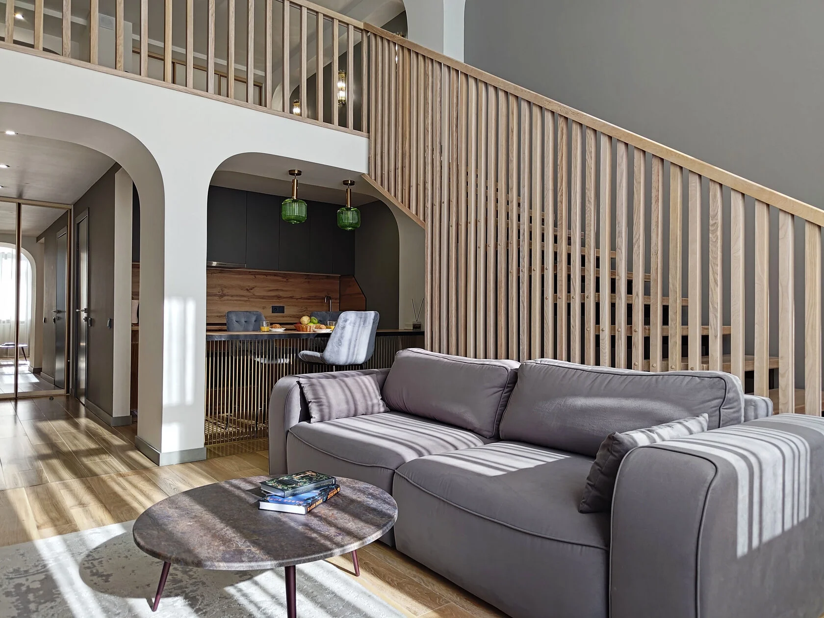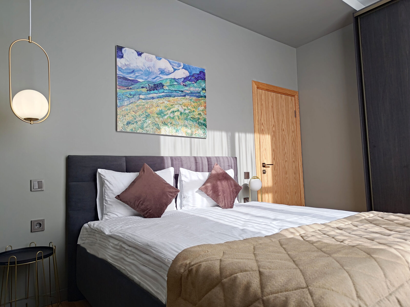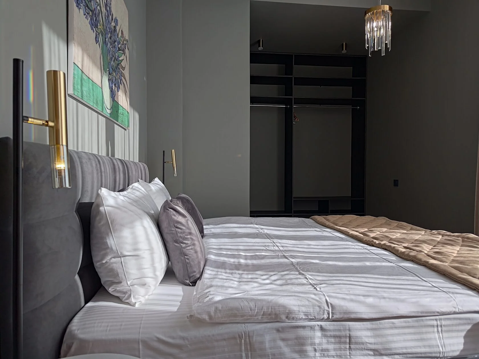 В номере: гардеробная, диван раскладной, кровать двуспальная, прикроватные столики, пуфик, стол, стол обеденный, стулья, шкаф, гладильная доска, кондиционер, микроволновая печь, набор посуды, плита индукционная, посудомоечная машина, стиральная машина, сушилка для белья, телевизор ЖК, утюг, холодильник, электрочайник