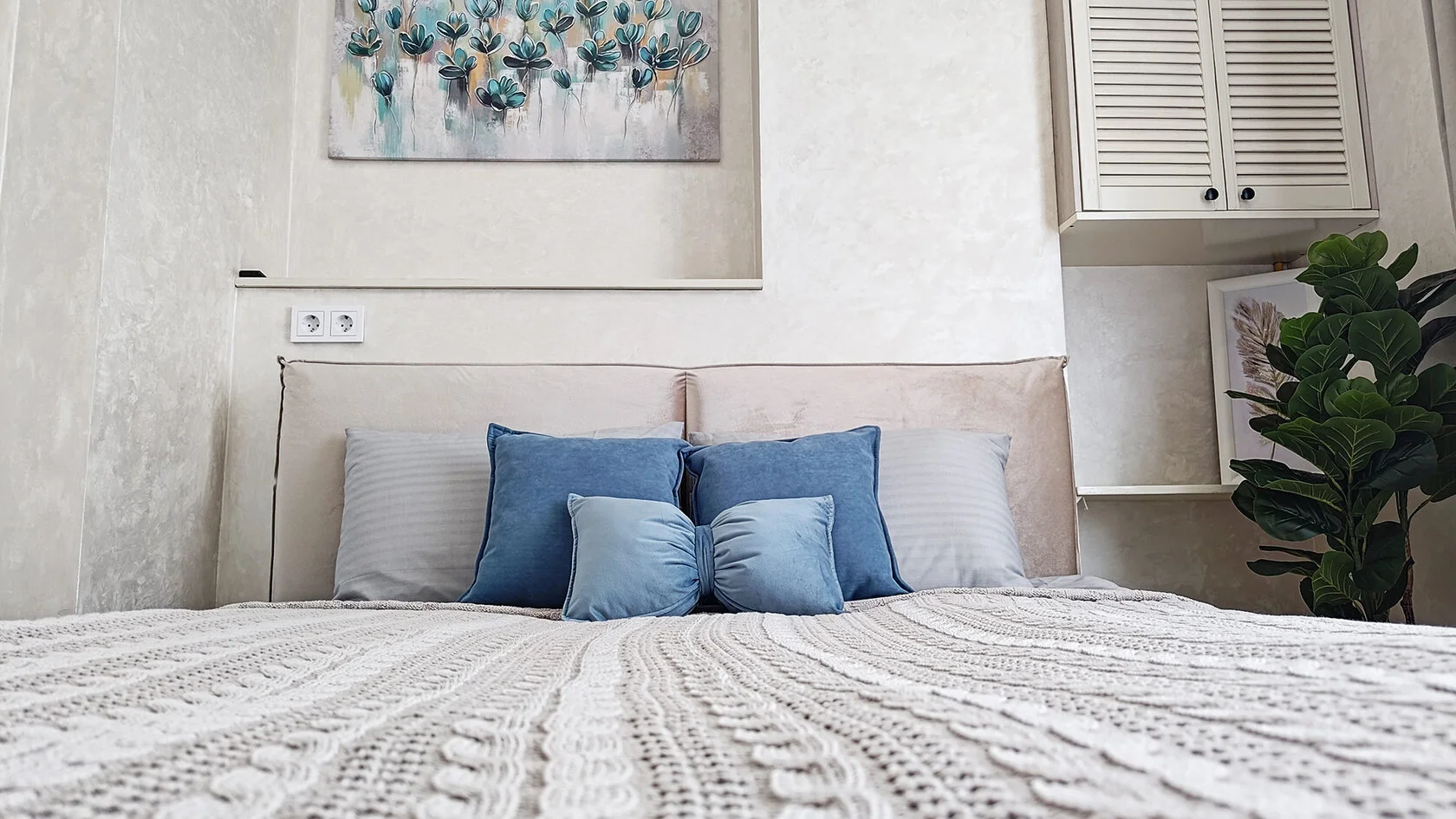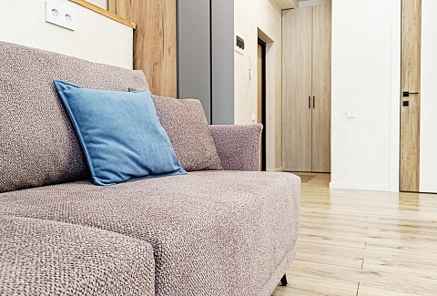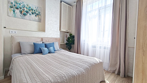 В номере: диван раскладной, зеркало, комод, кровать двуспальная, стол обеденный, стулья, шкаф, гладильная доска, кондиционер, микроволновая печь, набор посуды, плита индукционная, посудомоечная машина, пылесос, стиральная машина, сушилка для белья, телевизор ЖК, теплый пол, утюг, холодильник, электрочайник