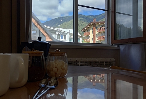 Просторная гостиная включает мягкий диван, телевизионную зону и выход на балкон, откуда открывается живописный вид на горы. Балкон оснащён летней мебелью, что делает его отличным местом для отдыха на свежем воздухе.Полноценная кухня подходит для самостоятельного приготовления пищи и включает обеденный стол, плиту, микроволновую печь, электрический чайник, тостер, холодильник и посудомоечную машину. В ванной комнате имеется душ, раковина, туалет, зеркало с подсветкой и фен.На территории дома доступна парковка, а лыжное оборудование можно удобно хранить в специальной кладовке. Также в апартаментах имеется Wi-Fi, что позволяет оставаться на связи во время отдыха.