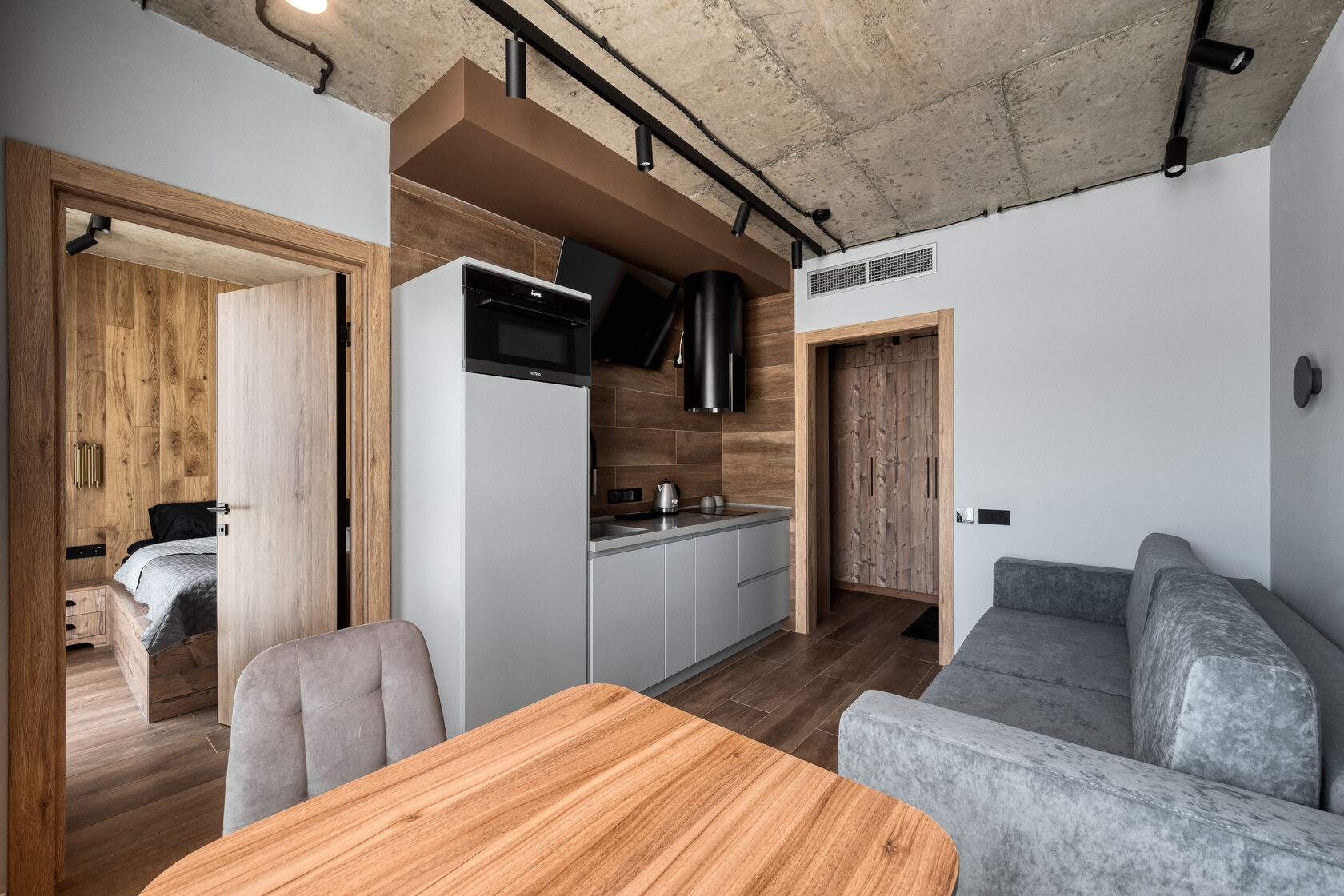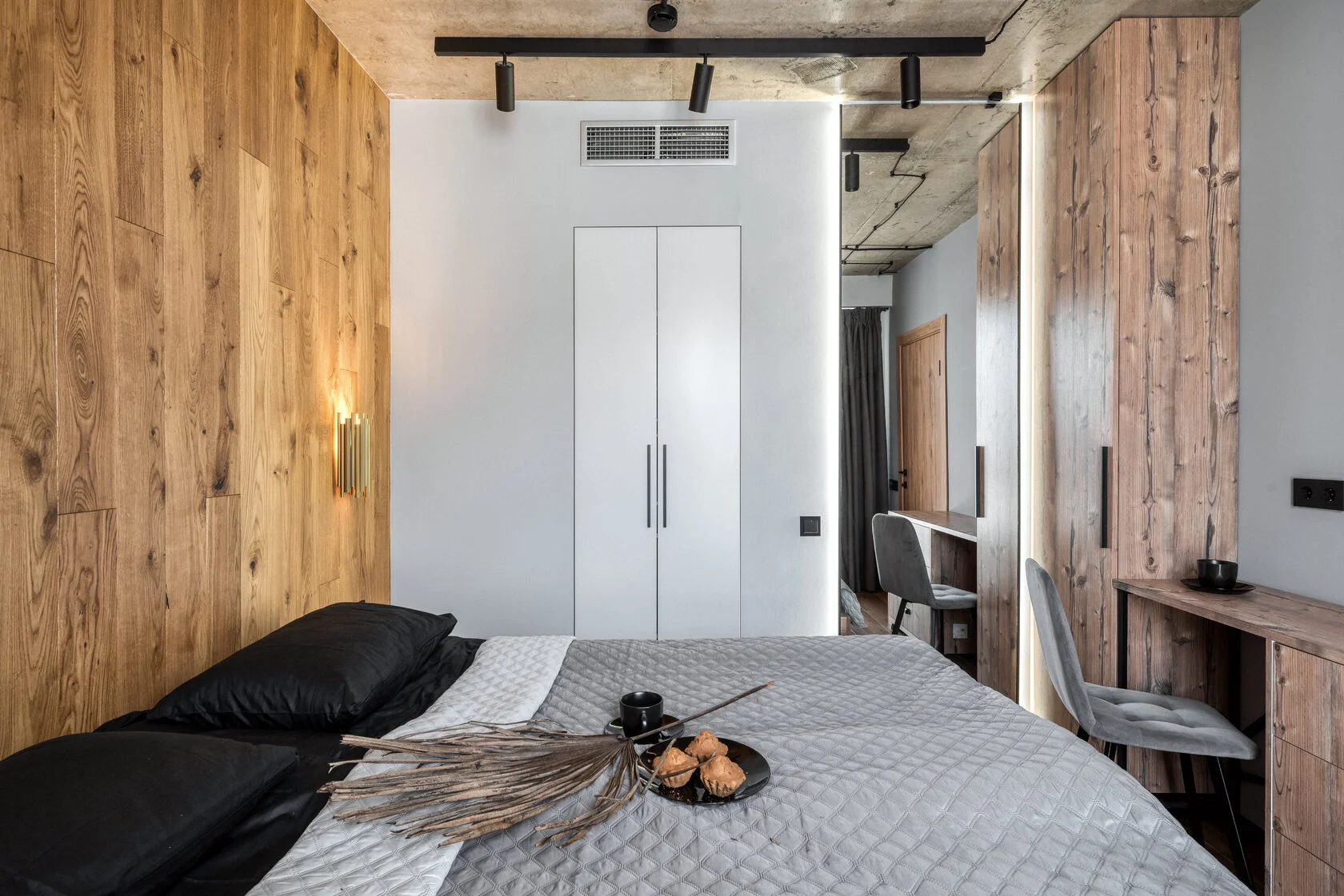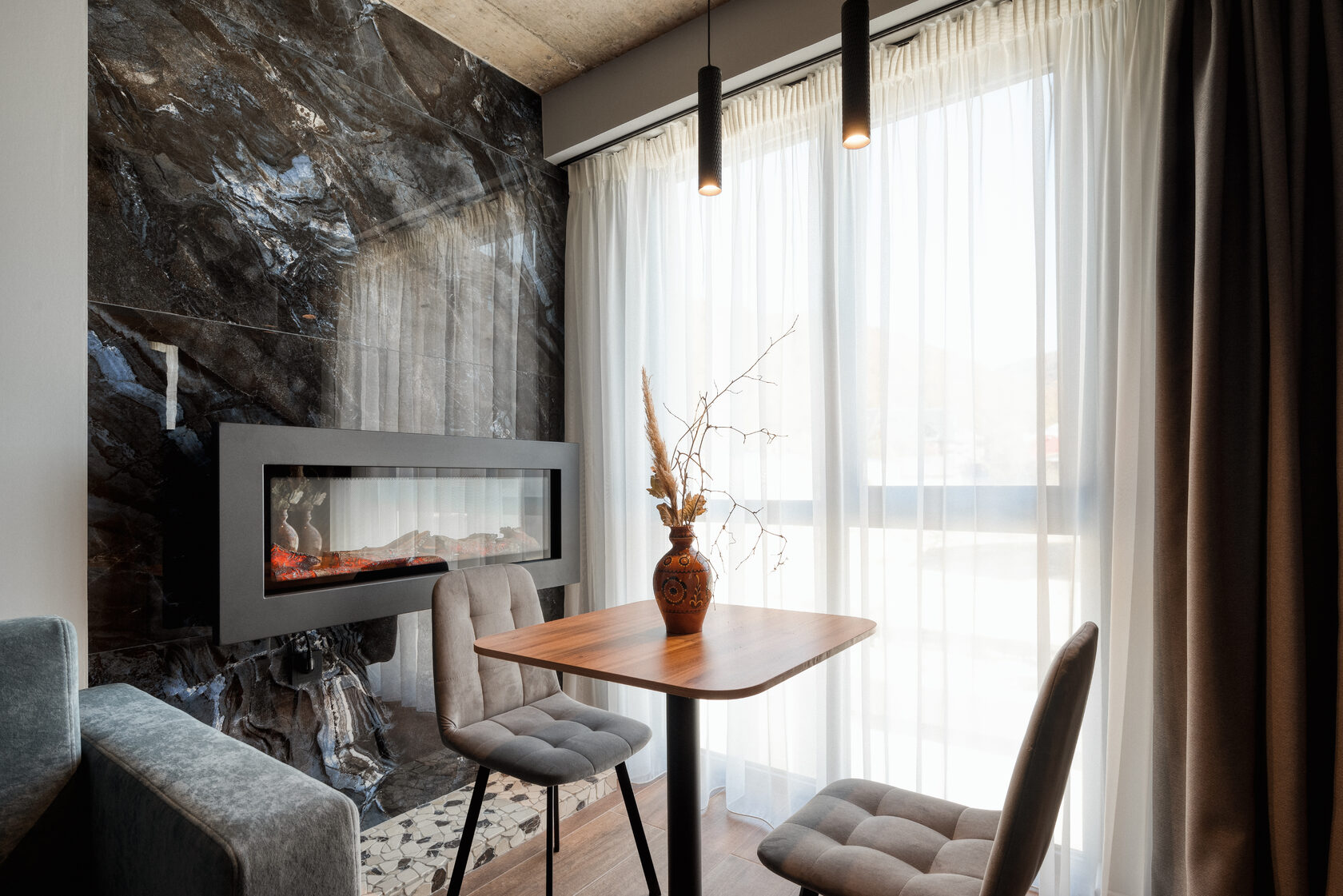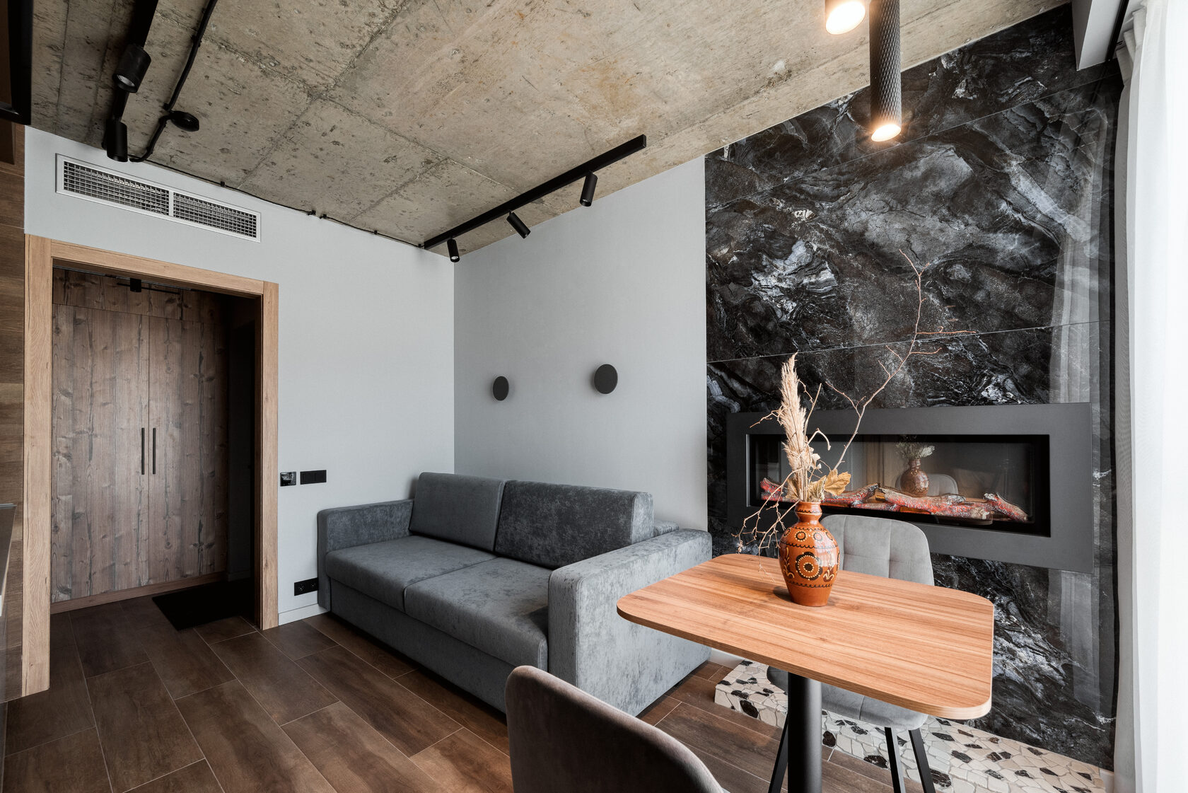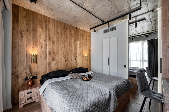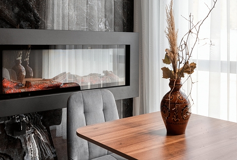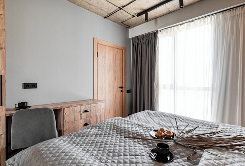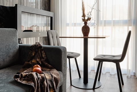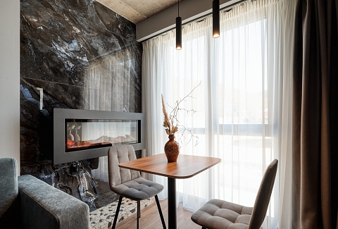 В номере: кровать двуспальная, прикроватные тумбочки, стол, стол обеденный, стулья, шкаф, гладильная доска, камин, кондиционер, микроволновая печь, набор посуды, плита индукционная, посудомоечная машина, стиральная машина, сушилка для белья, телевизор ЖК, утюг, холодильник, электрочайник