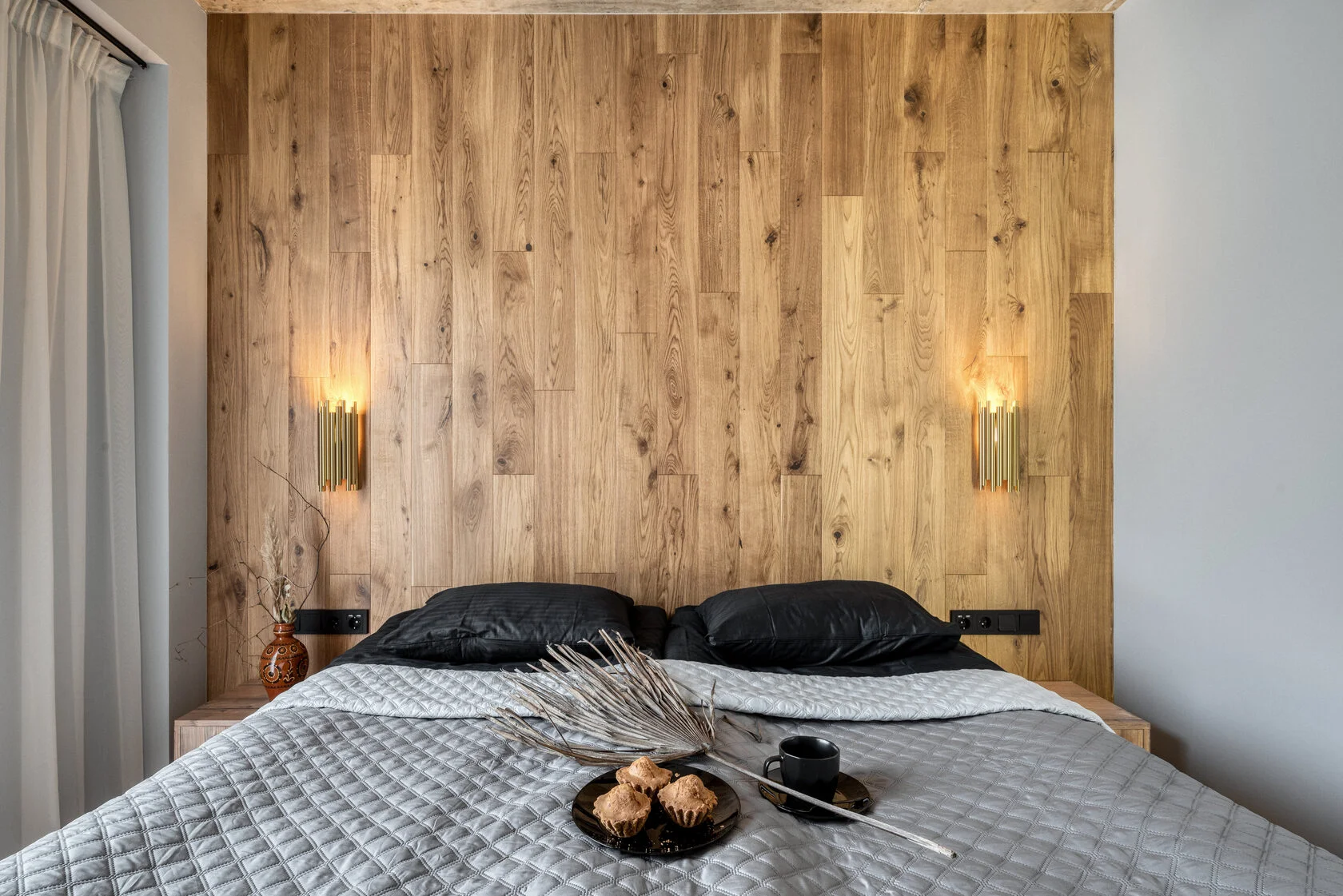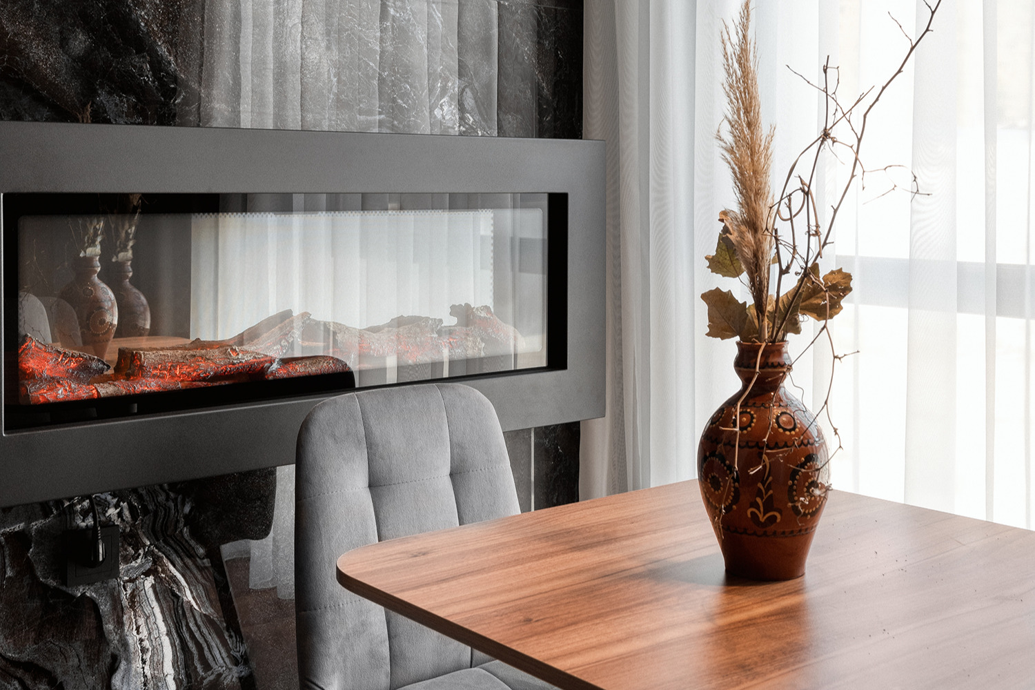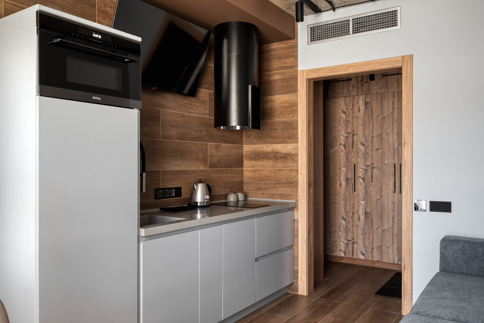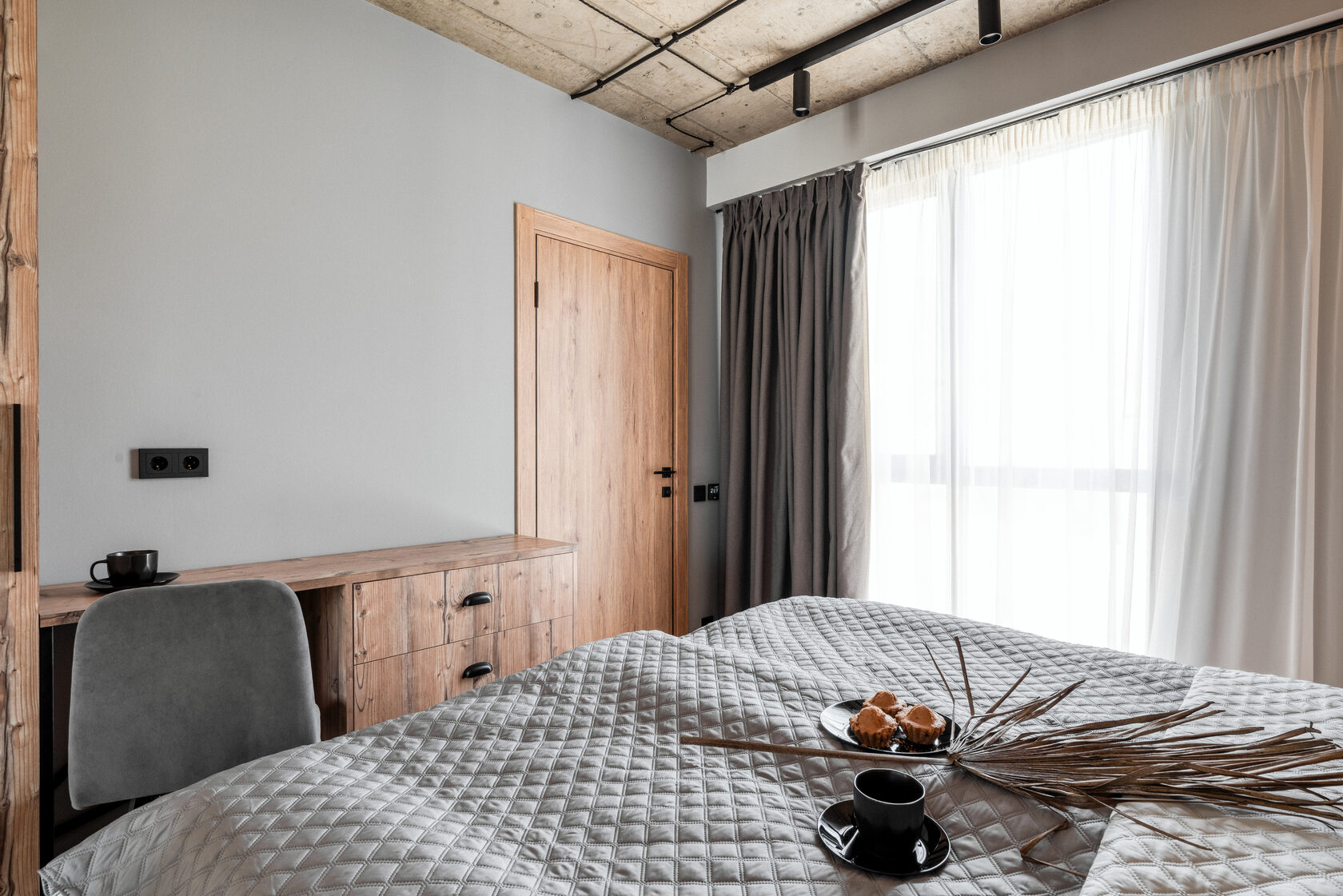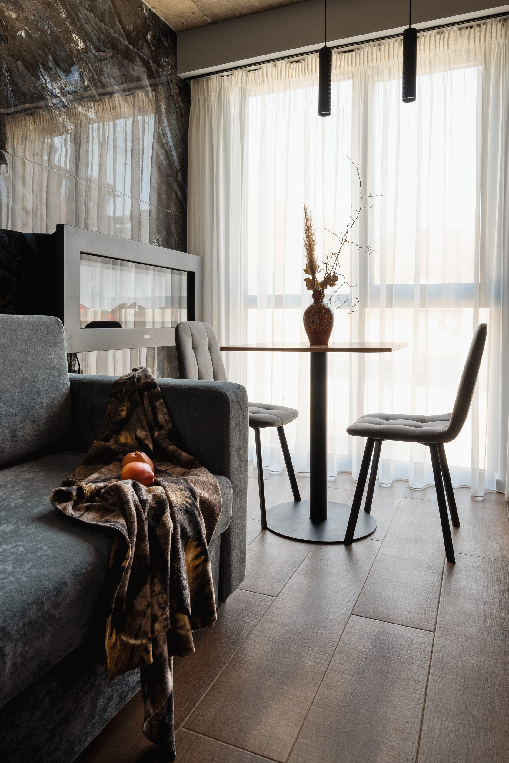 В номере: кровать двуспальная, прикроватные тумбочки, стол, стол обеденный, стулья, шкаф, гладильная доска, камин, кондиционер, микроволновая печь, набор посуды, плита индукционная, посудомоечная машина, стиральная машина, сушилка для белья, телевизор ЖК, утюг, холодильник, электрочайник