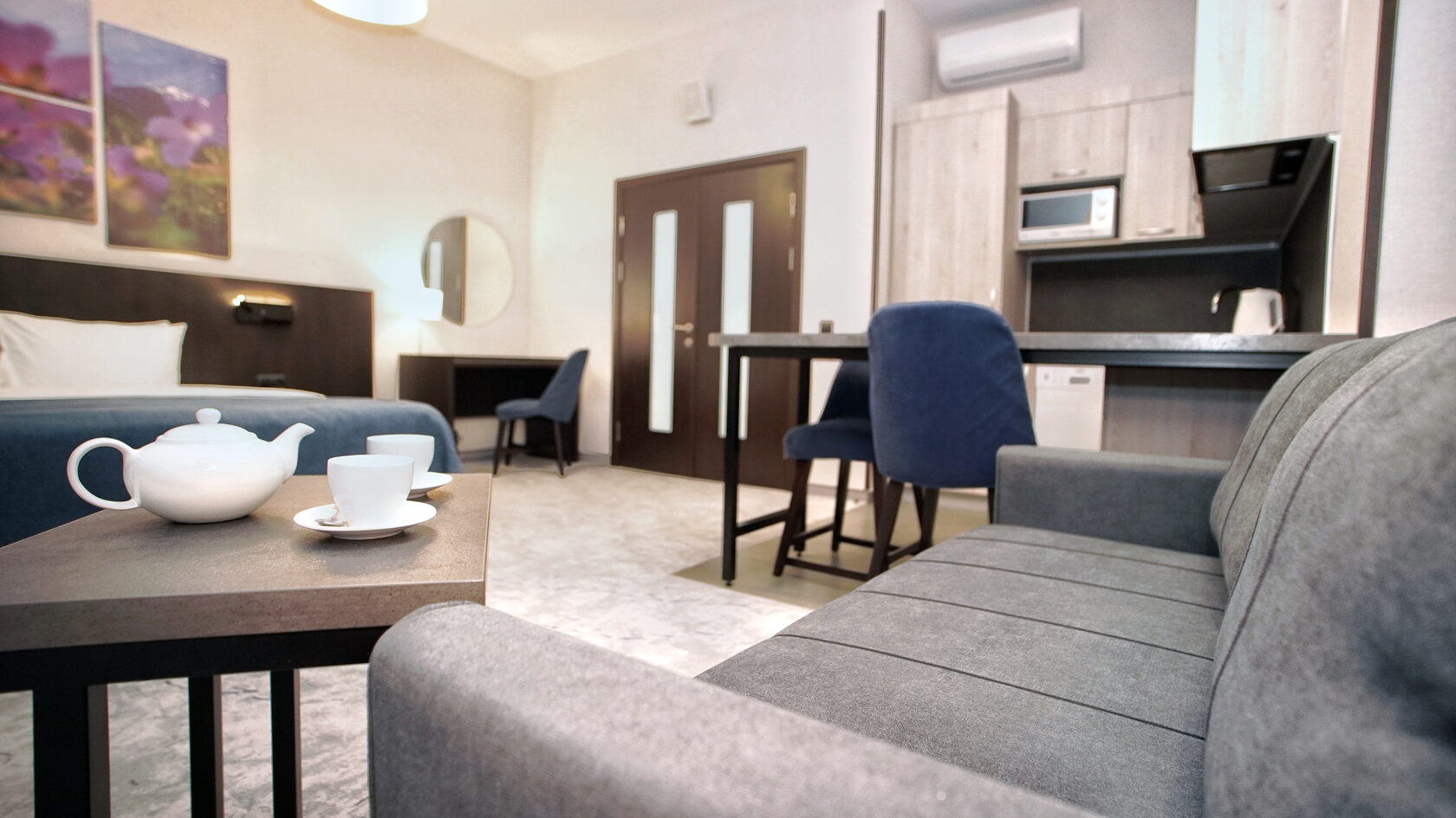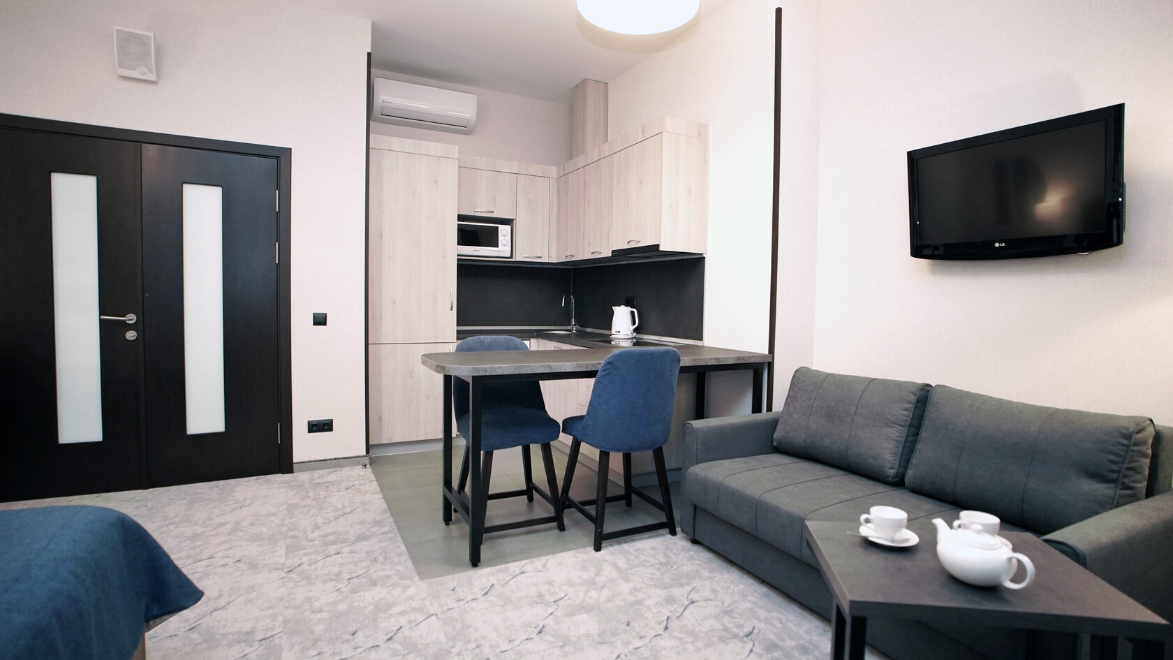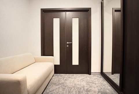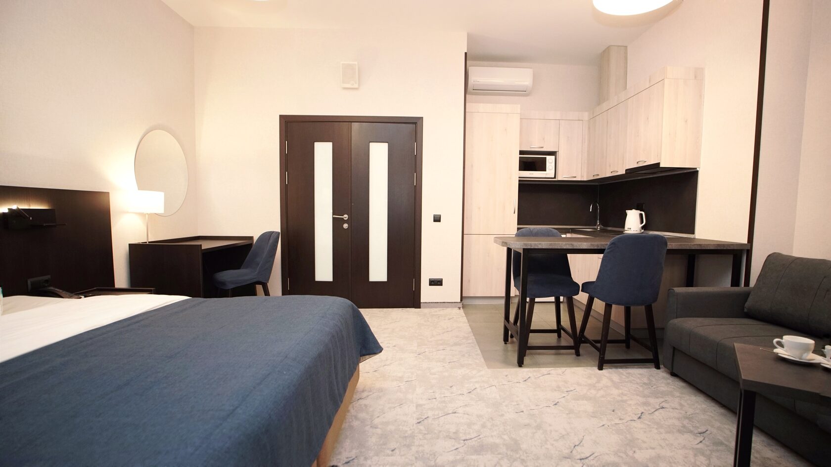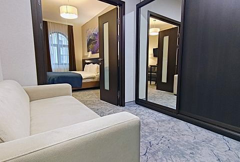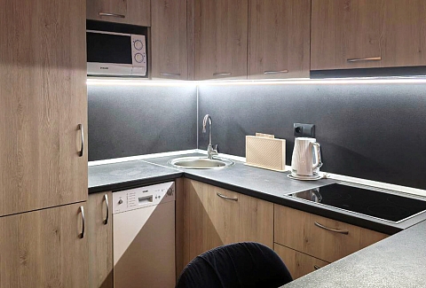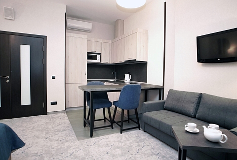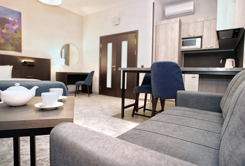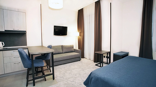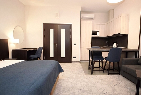 В номере: диван раскладной, зеркало, кровать двуспальная, прикроватные тумбочки, стол, столик кофейный, стулья, шкаф, гладильная доска, кондиционер, микроволновая печь, набор посуды, плита индукционная, посудомоечная машина, стиральная машина, сушилка для белья, телевизор ЖК, утюг, холодильник, электрочайник