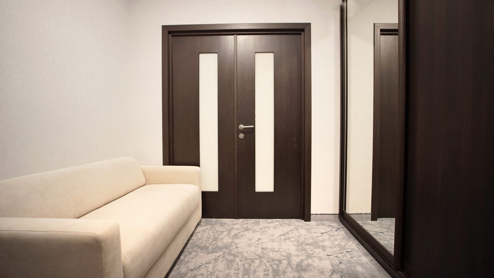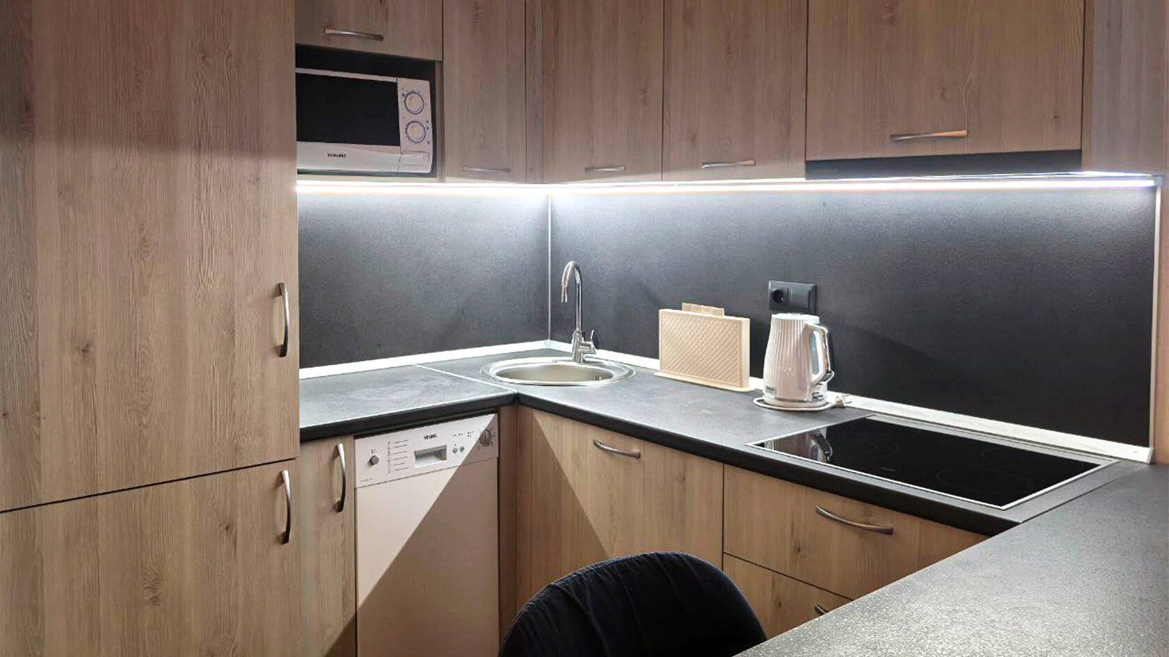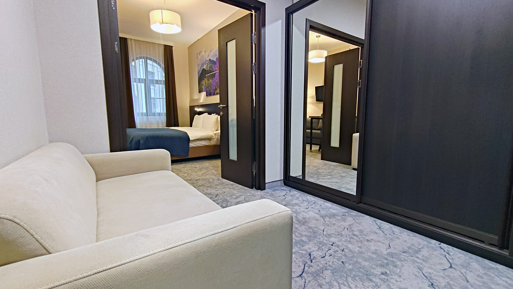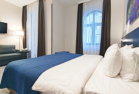 В номере: диван раскладной, зеркало, кровать двуспальная, прикроватные тумбочки, стол, столик кофейный, стулья, шкаф, гладильная доска, кондиционер, микроволновая печь, набор посуды, плита индукционная, посудомоечная машина, стиральная машина, сушилка для белья, телевизор ЖК, утюг, холодильник, электрочайник