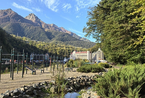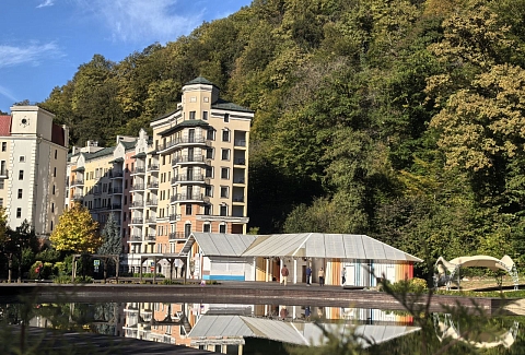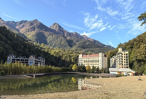 Поездом до ж/д вокзала Адлер, далее на автобусе №105, 105с до остановки «Роза Хутор», далее пройти 264 м до апартаментов.