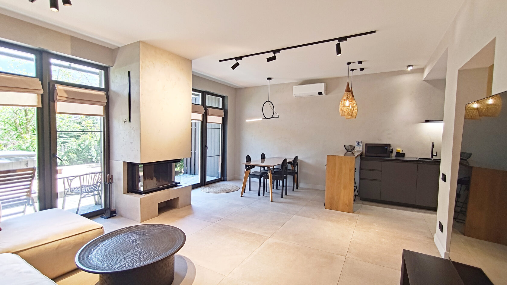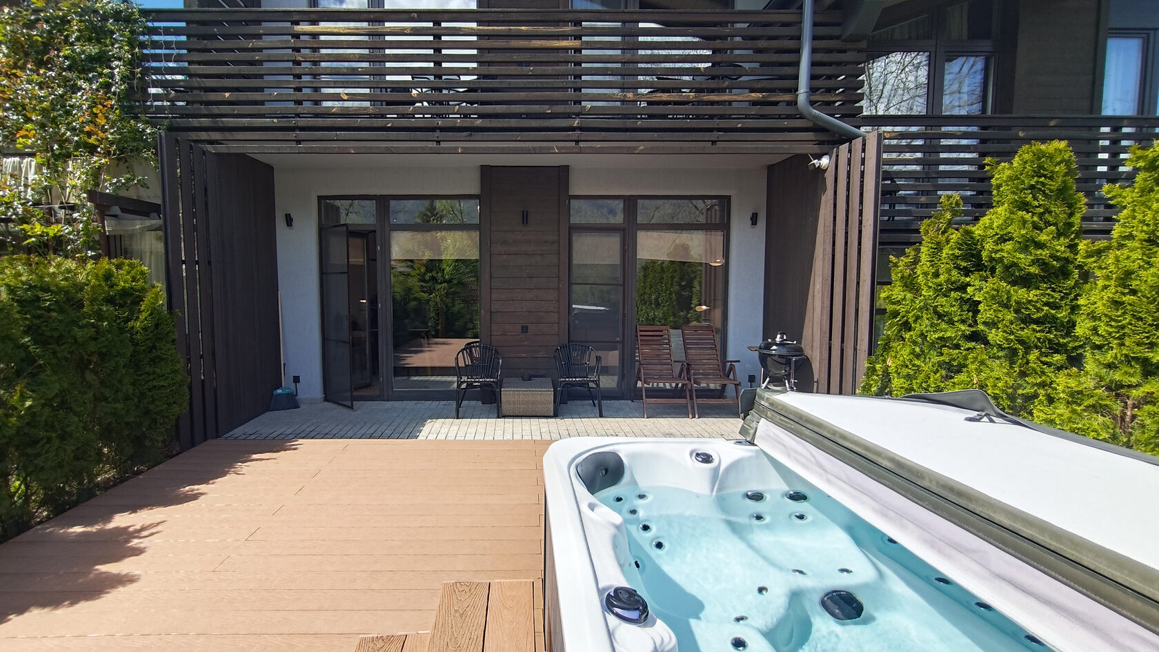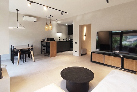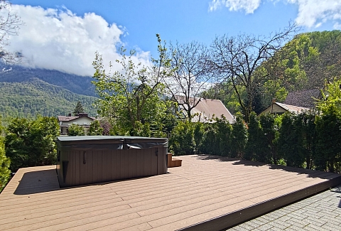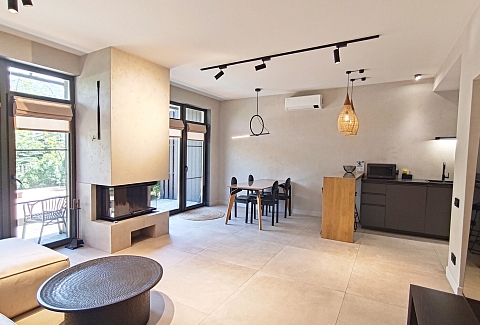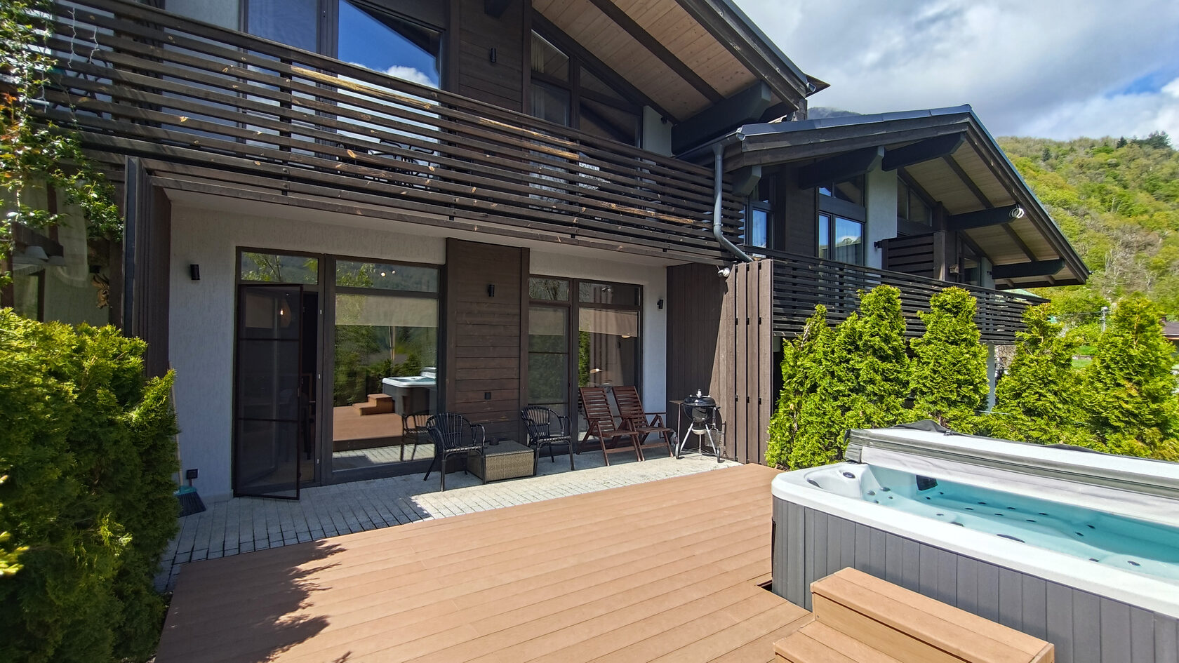 Уникальная архитектура в стиле минимализм в сочетании с хайтеком создает атмосферу современного и стильного жилья. Из окон открывается великолепный вид на горы и зелёные леса, что позволяет насладиться природной красотой.На первом этаже находится просторная гостиная с камином, кондиционером и телевизором, а также полностью оборудованная кухня с необходимой техникой: плитой, духовым шкафом, микроволновой печью, холодильником с морозильной камерой, кофемашиной и посудомоечной машиной. Также предусмотрены туалетная комната и кладовая, включающая прачечную.Второй этаж включает три комфортабельные спальни, каждая из которых оснащена кондиционером и имеет выход на балкон с летней мебелью. Здесь также располагаются два санузла, в каждом из которых есть ванна и душевая кабина. Спальные места представлены 2-спальными и раздельными кроватями.На закрытой территории таунхауса имеется парковка, а для удобства жильцов предоставляется Wi-Fi. На террасе создана зона для барбекю, что дополнительно способствует приятным вечерам на свежем воздухе. Этот таунхаус станет отличным выбором для семейного отдыха или поездки с друзьями.