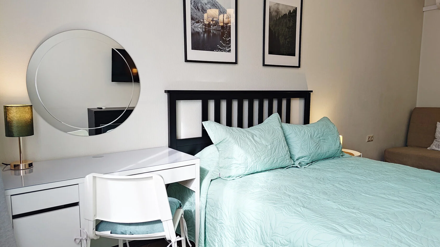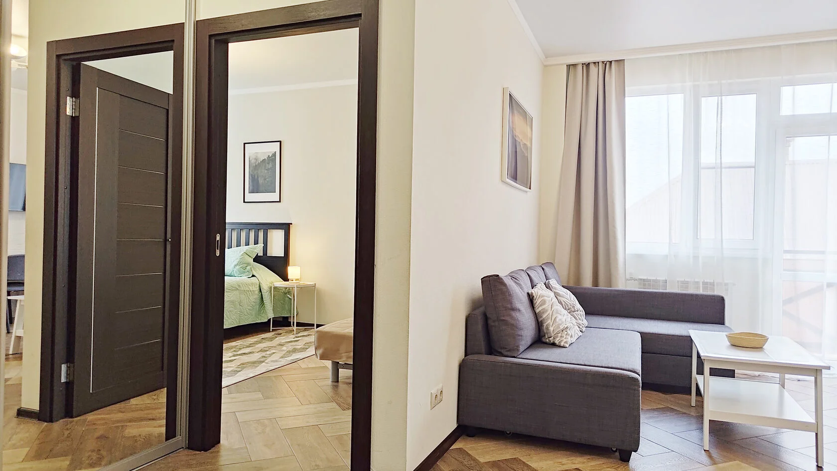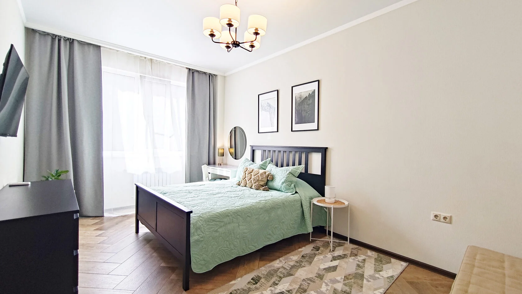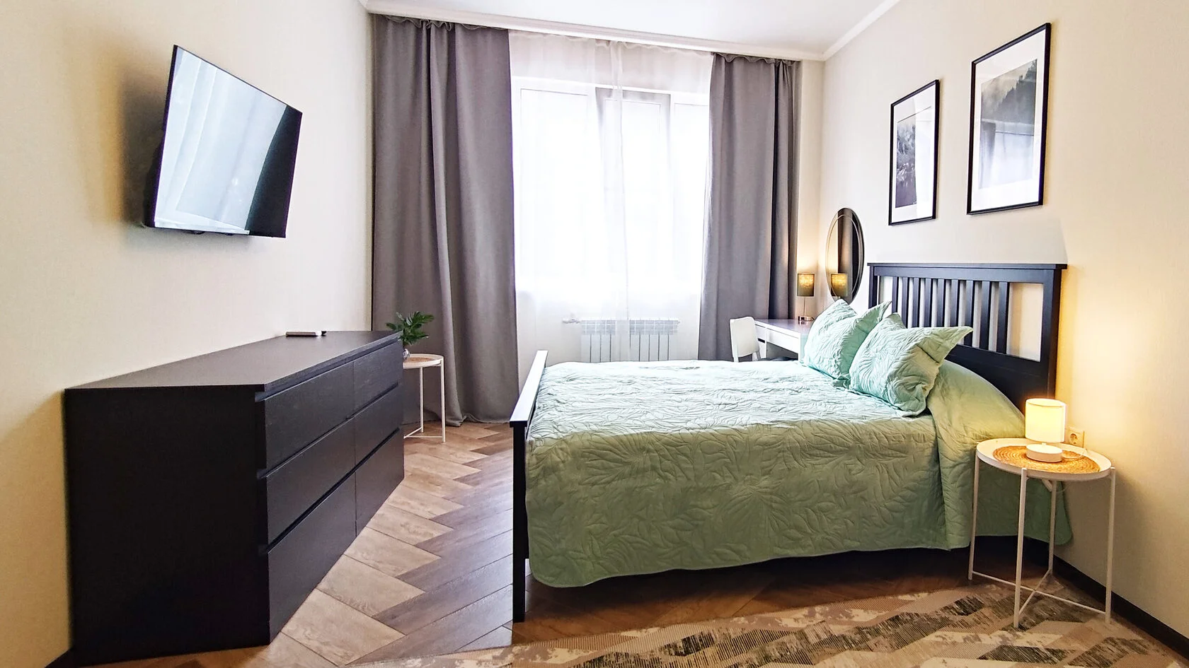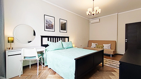 В номере: диван раскладной, зеркало, комод, кровать двуспальная, прикроватный столик, стол, столик журнальный, стол обеденный, стулья, шкаф, гладильная доска, духовой шкаф, кондиционер, микроволновая печь, набор посуды, плита газовая, посудомоечная машина, пылесос, стиральная машина, сушилка для белья, телевизор ЖК, теплый пол, утюг, холодильник, электрочайник