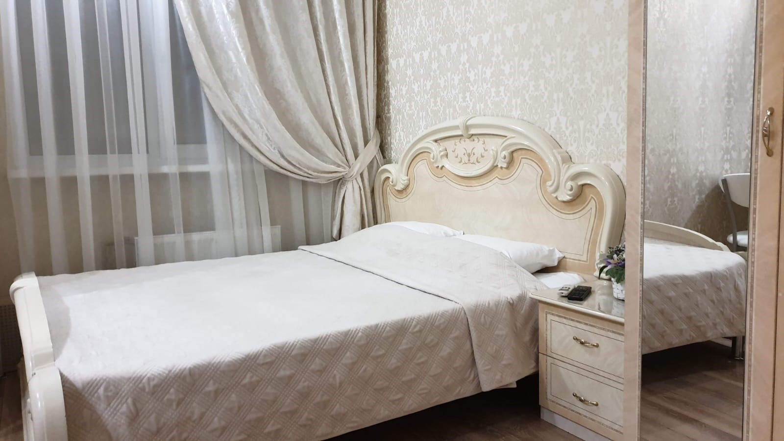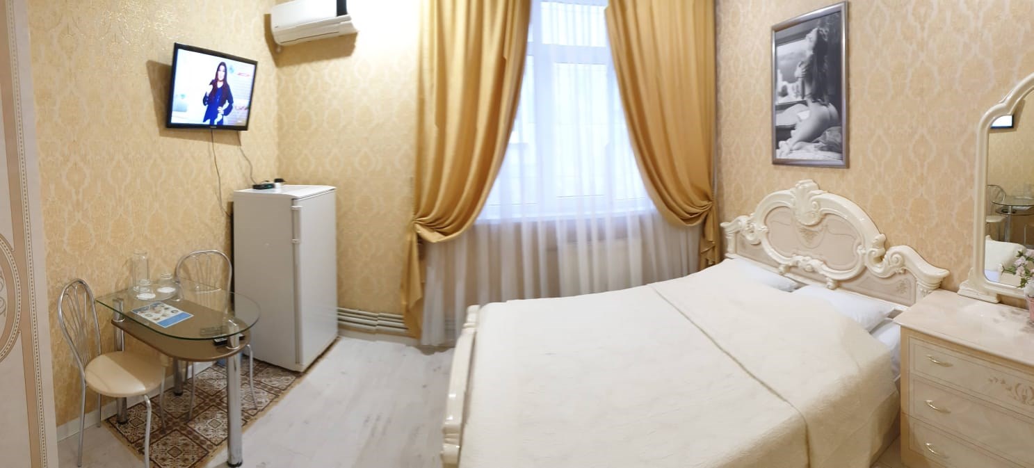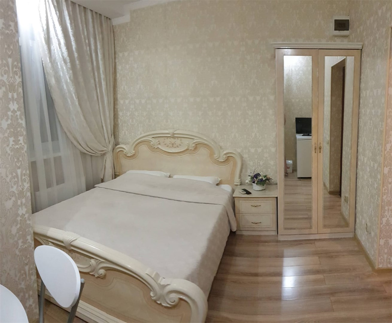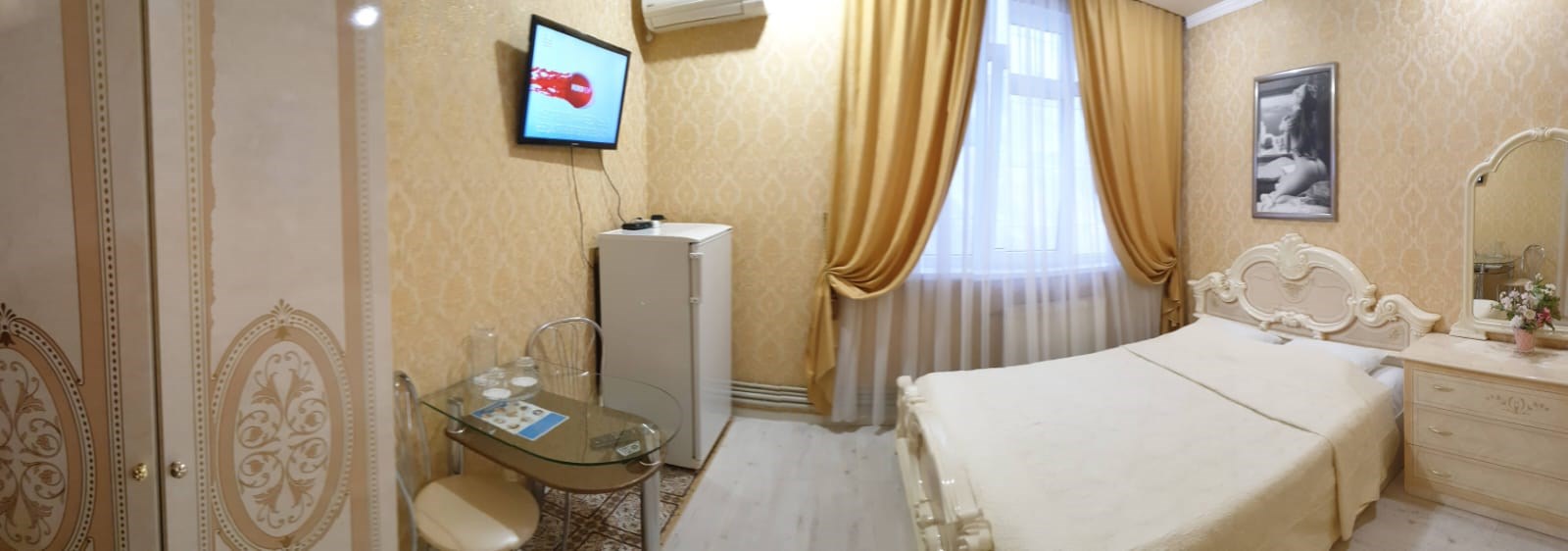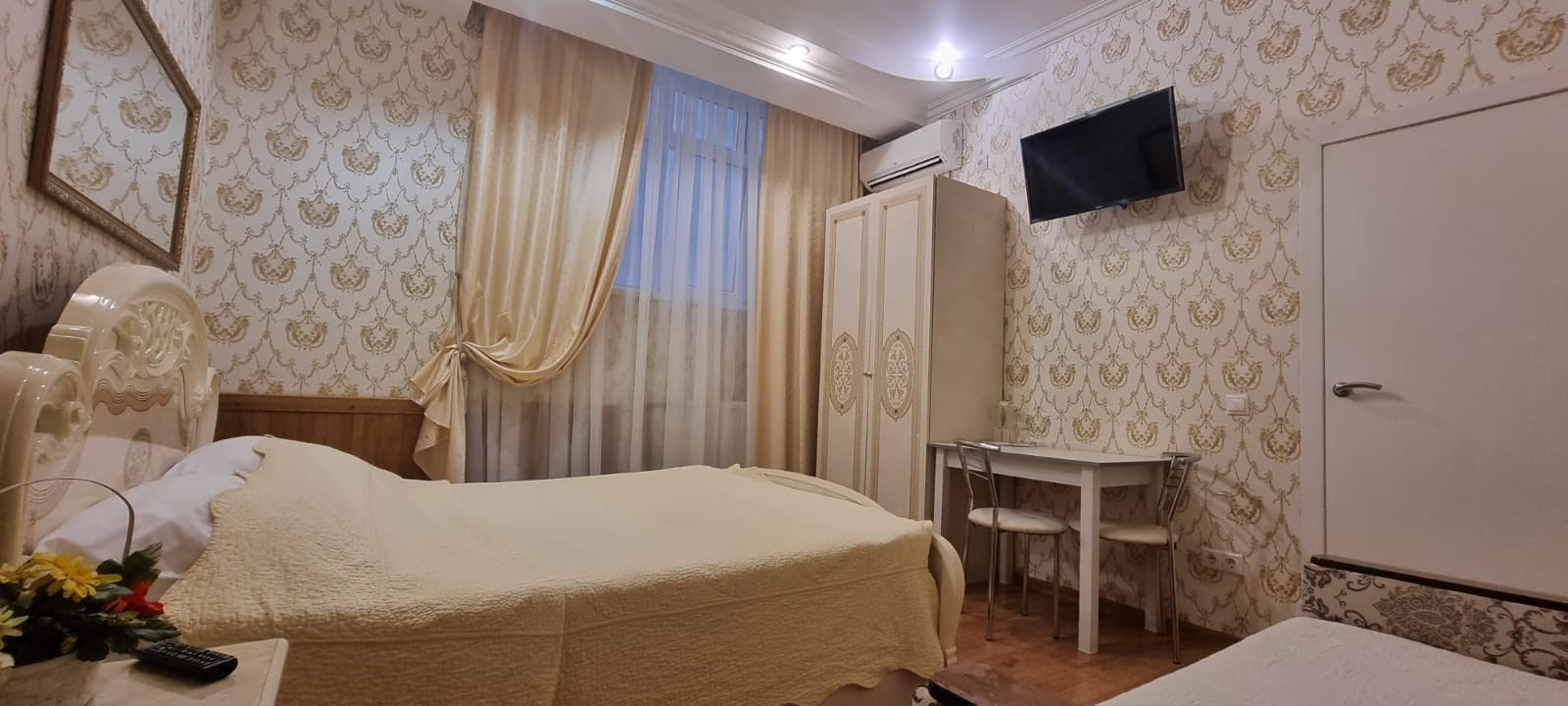 В номере: зеркало, кровать двуспальная, прикроватные тумбочки, стол, стулья, шкаф, кондиционер, сейф, телевизор, холодильник