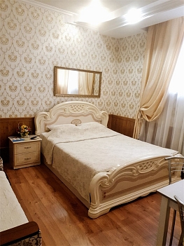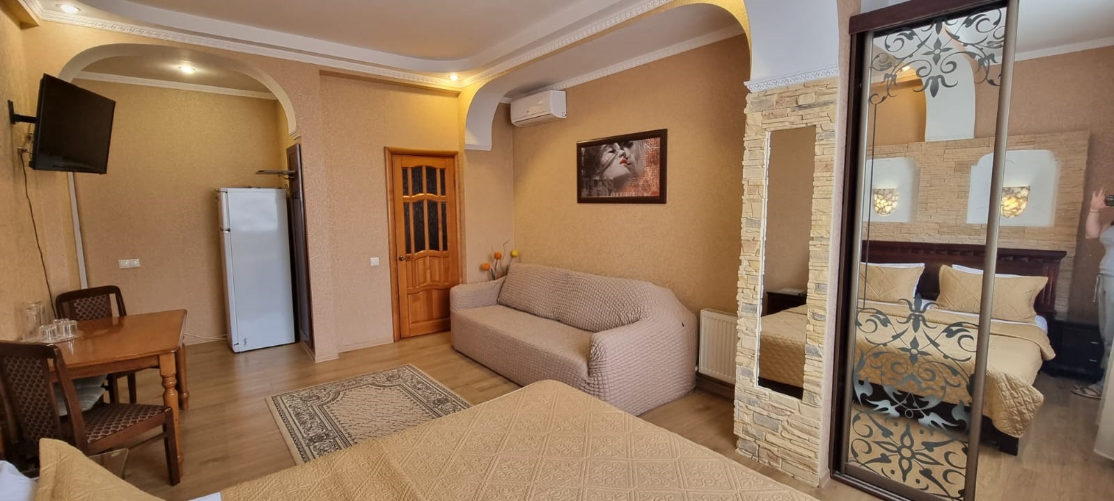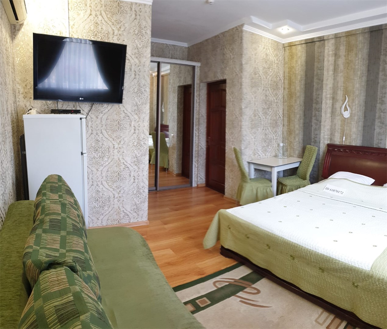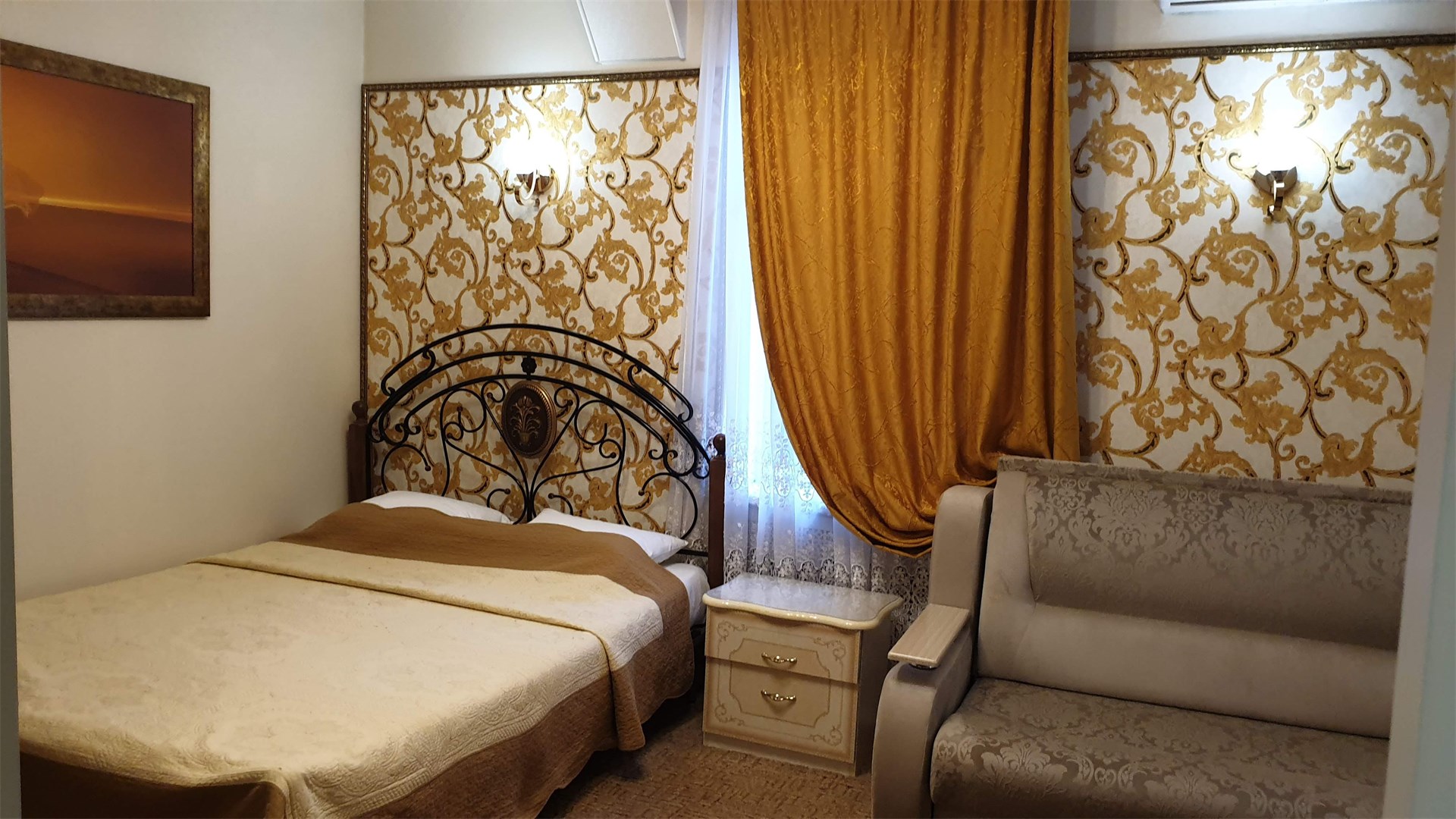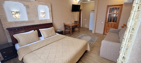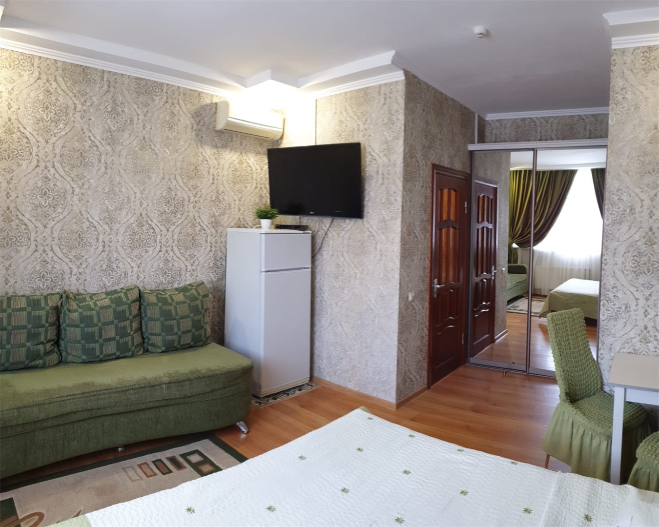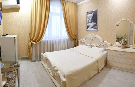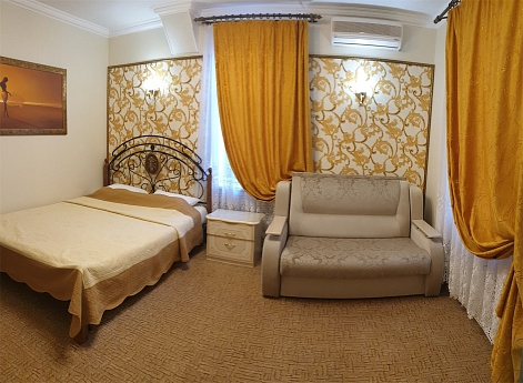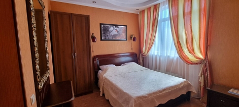 В номере: диван раскладной, зеркало, кровать двуспальная, прикроватные тумбочки, стол, стулья, шкаф, кондиционер, сейф, телевизор, холодильник