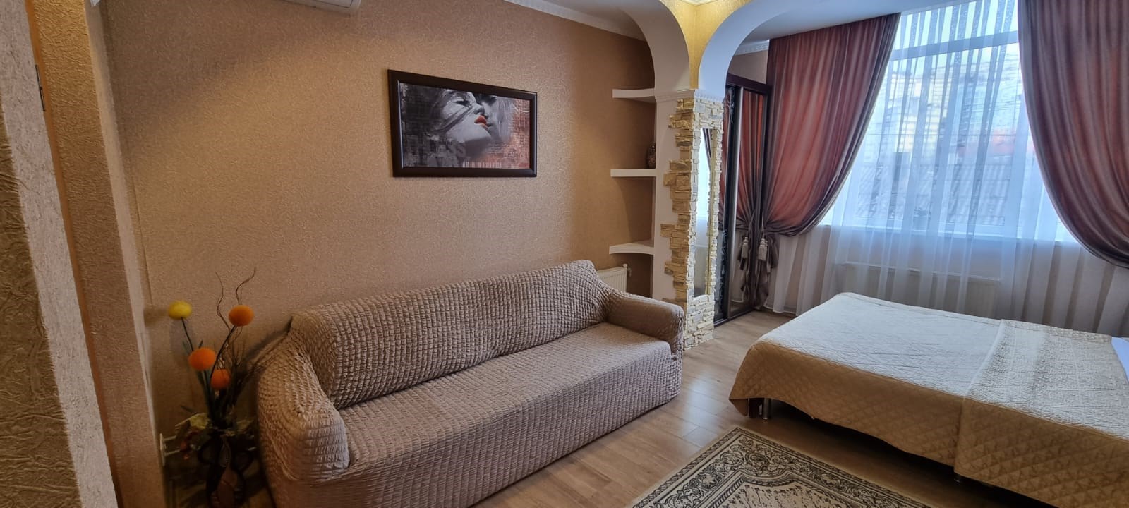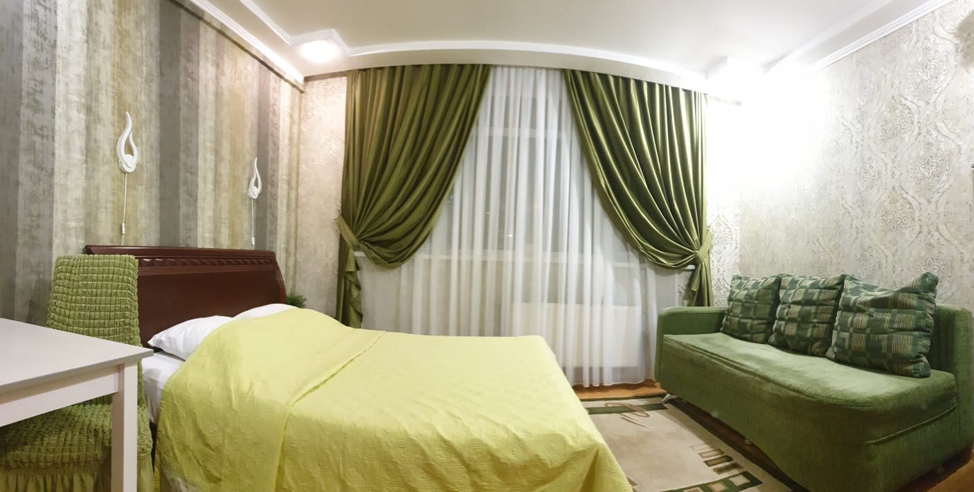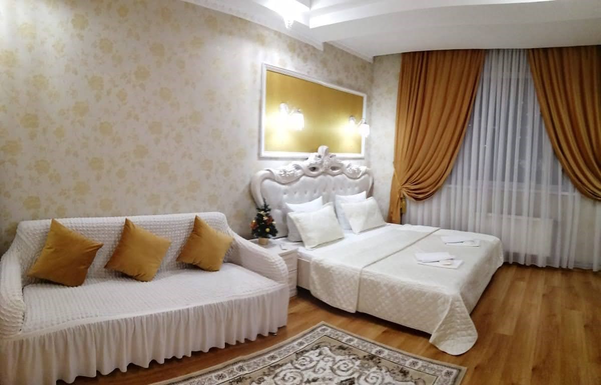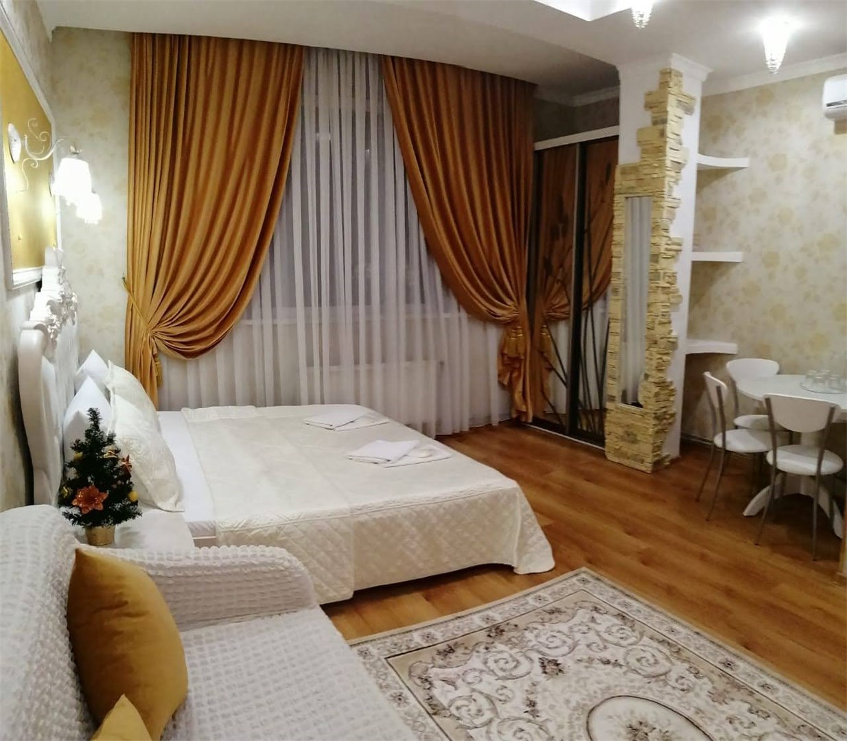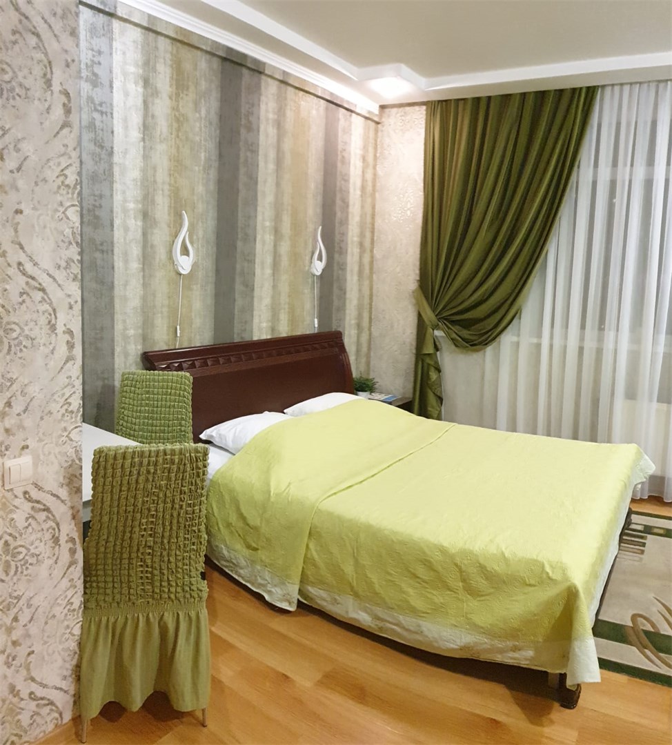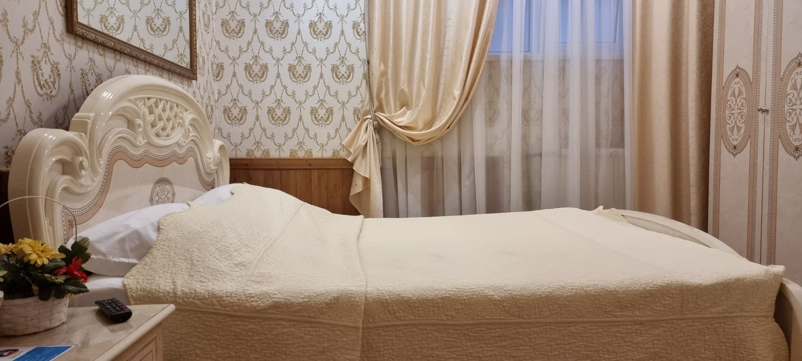 В номере: диван раскладной, зеркало, кровать двуспальная, прикроватные тумбочки, стол, стулья, шкаф, кондиционер, сейф, телевизор, холодильник