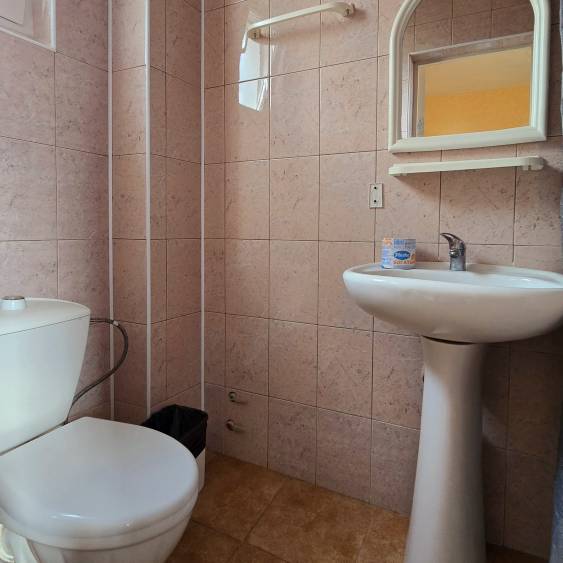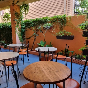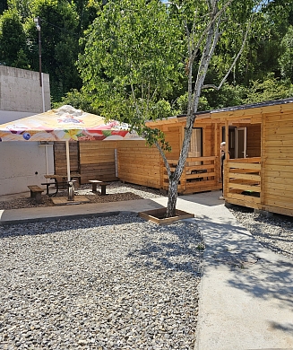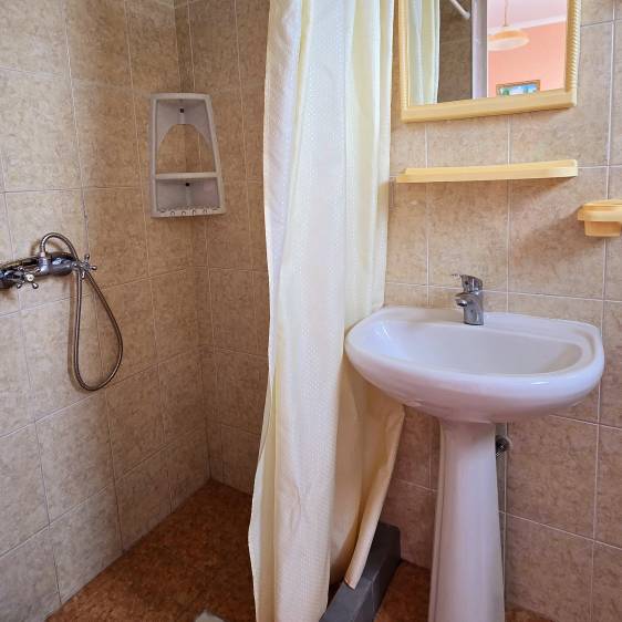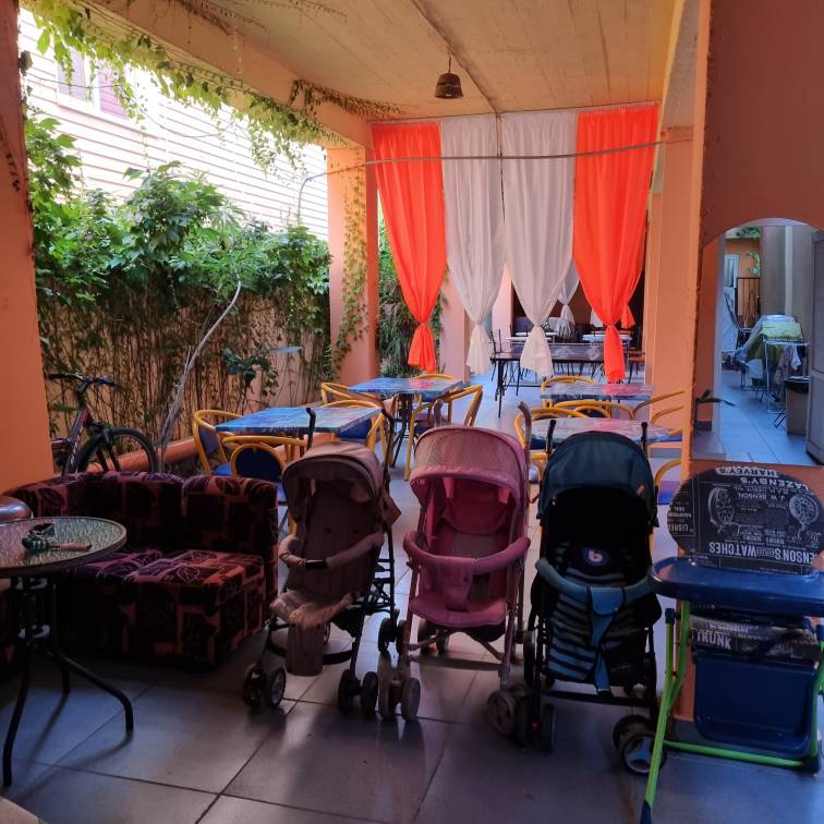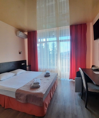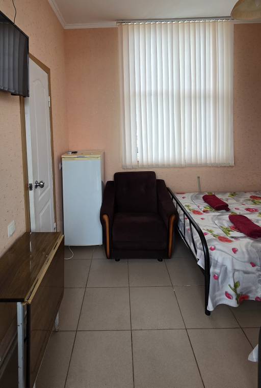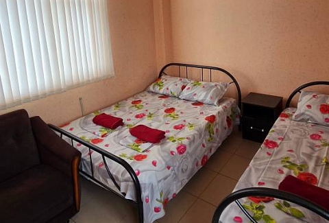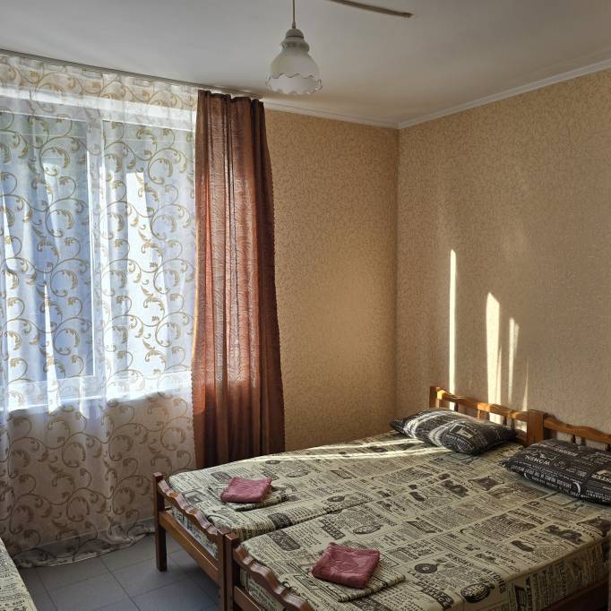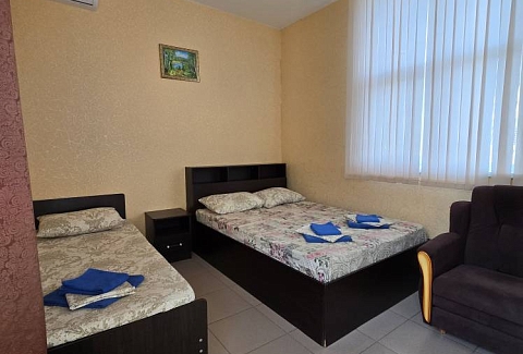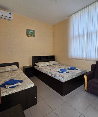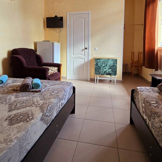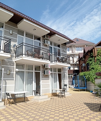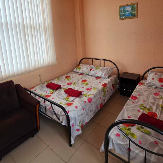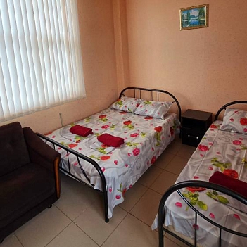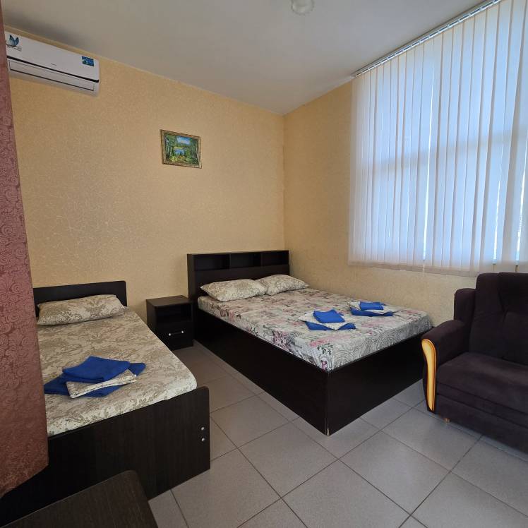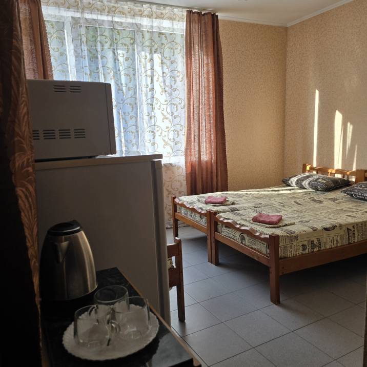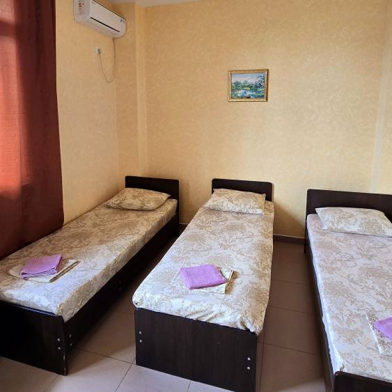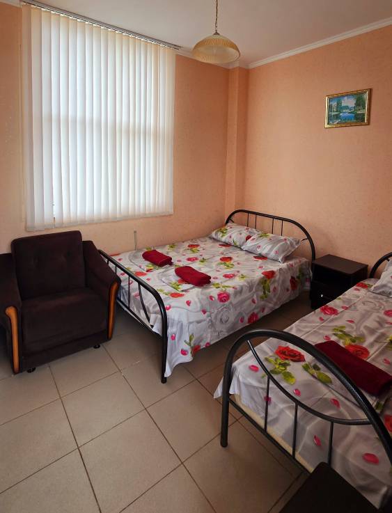 Стандартные номера расчитаны на двоих, троих и четверых гостей и расположены с первого по третий этаж. В каждом номере есть собственный душ и туалет, телевизор, холодильник для продуктов и прохладительных напитков, сплит-система, позволяющая установить идеальную температуру, а также удобные кровати, прикроватные тумбочки, вместительный шкаф и обеденный стол со стульями. Поднимаясь на этаж, гости выходят на общий балкон — светлое, продуваемое пространство, откуда ведёт вход в номера. На каждом этаже оборудована общая кухня с газовой плитой, микроволновой печью, раковиной и полным набором посуды для приготовления любых блюд — от простого завтрака до полноценного ужина с домашними пирогами. Дом утопает в зелени парковой зоны, что особенно ценится теми, кто устал от городского шума. Двор дома — это отдельная история: здесь очень зелено, всегда царит приятная прохлада благодаря раскидистым деревьям, стоят столики для душевных посиделок, обустроен детский уголок, где малыши могут играть под присмотром, и мягкая диванная зона, идеально подходящая для обеда на свежем воздухе или вечерних посиделок.В гостевом доме строго соблюдаются часы тишины с одиннадцати вечера до восьми утра — время, когда все отдыхают, набираются сил и наслаждаются безмятежностью южной ночи. В трёх минутах ходьбы от дома находится закрытая, охраняемая парковка для гостей, путешествующих на личном автомобиле. По предварительному согласованию доступен трансфер.До моря отсюда — рукой подать: всего три минуты по ровной, удобной аллее, и можно забыть о тревогах перехода через железнодорожные пути или оживлённую трассу — их здесь просто нет.
