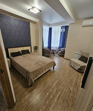 В номере: зеркало, кресло-кровать, кровать двуспальная, кровать односпальная, стол, шкаф, сплит-система, телевизор, холодильник