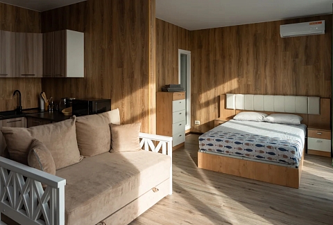 Самолетом до аэропорта г. Симферополь, далее на маршрутном такси до остановки «Поворот до Семидворье», далее 2,7 км до комплекса апартаментов.