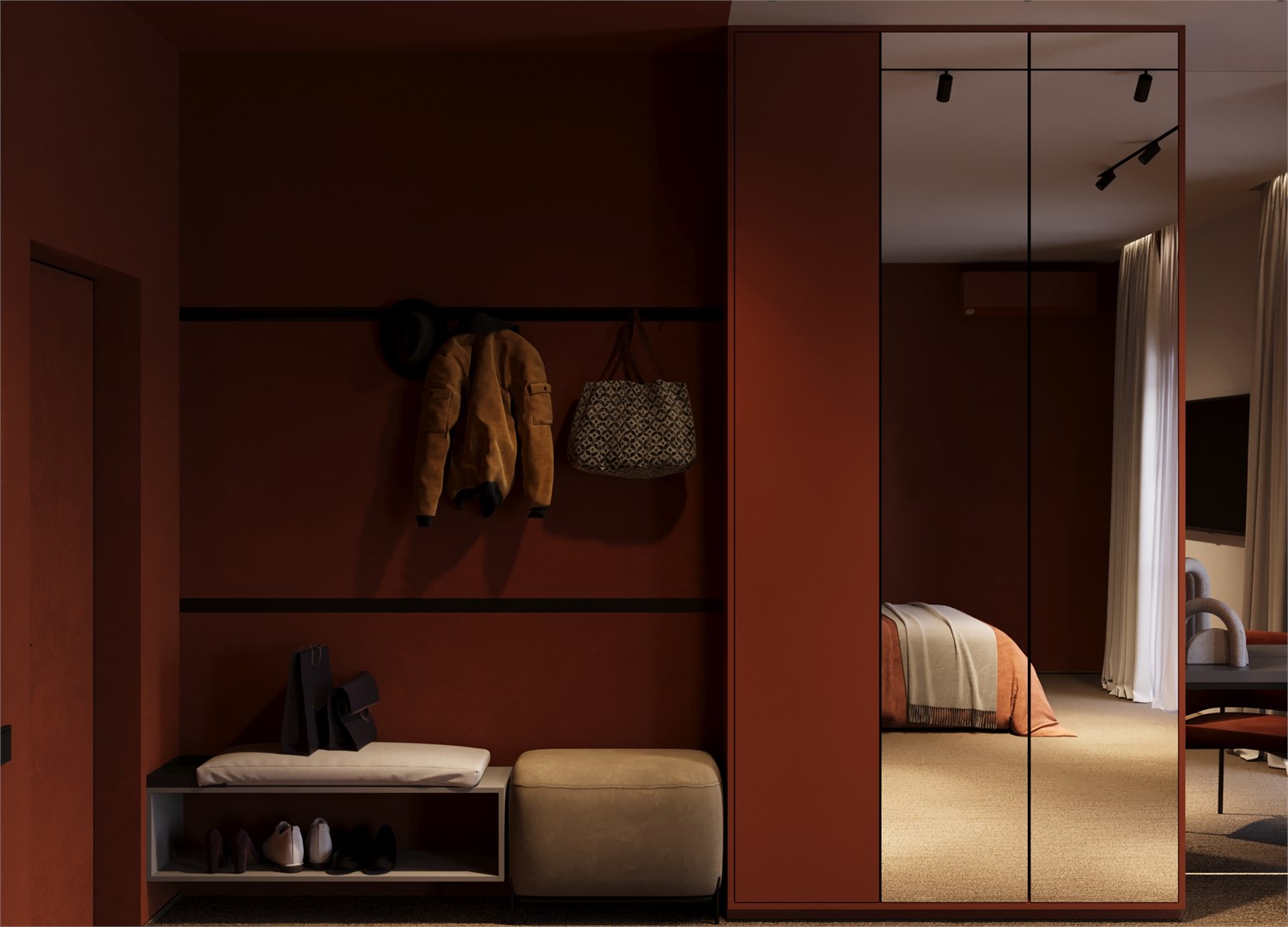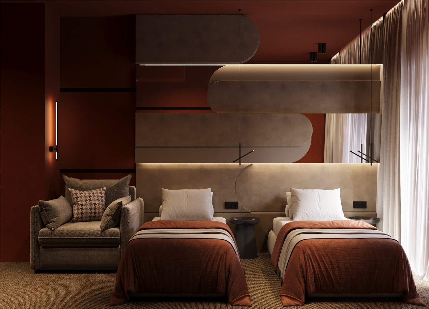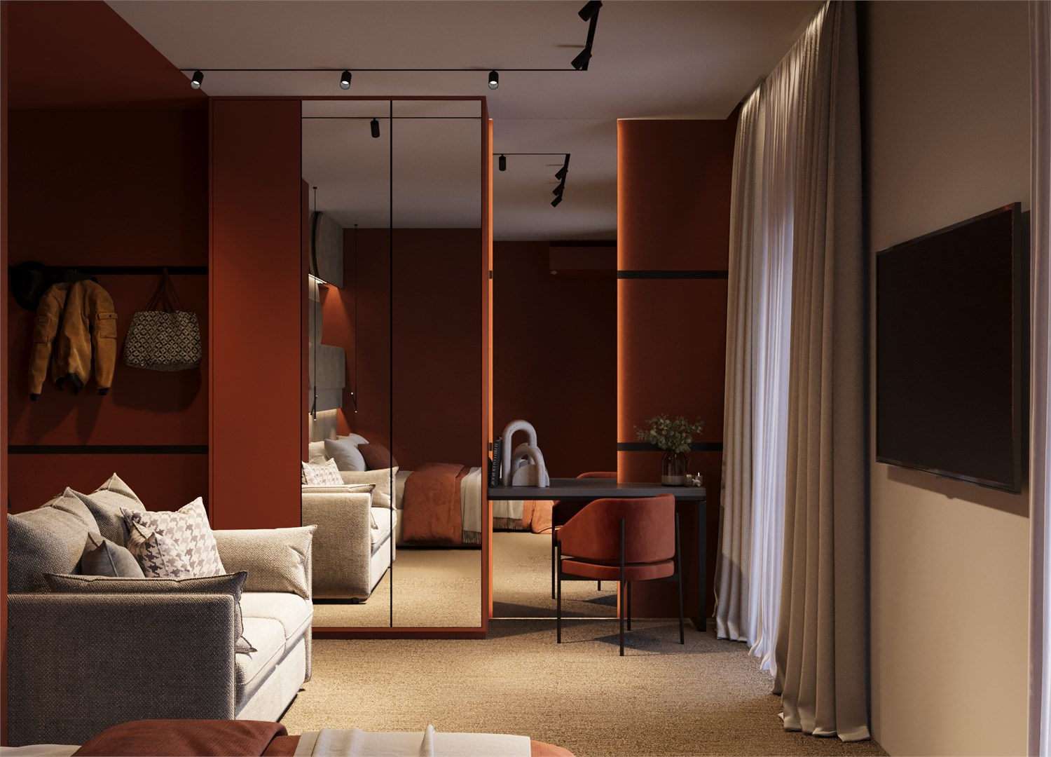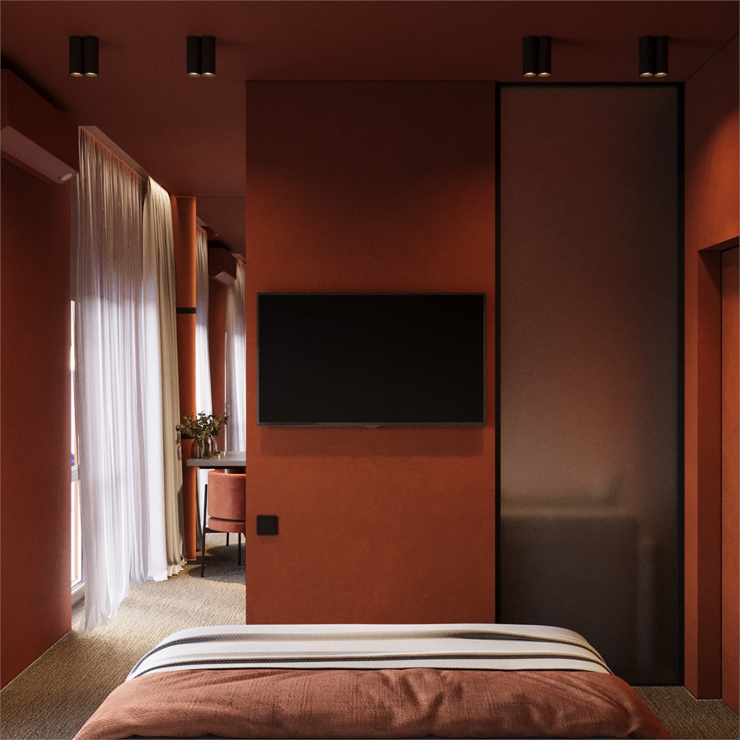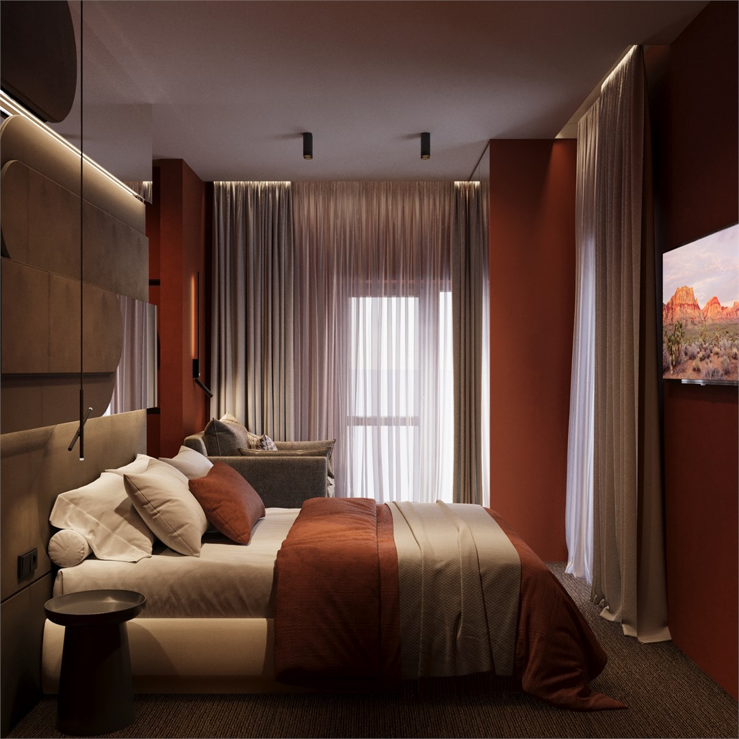 В номере: вешалка, зеркало, кресло-кровать, кровати односпальные /одна двуспальная кровать, прикроватные столики, стол, столик туалетный, стул, тумба, шкаф, кондиционер, мини-холодильник, сейф, телевизор, холодильник, чайная станция, чайный набор посуды