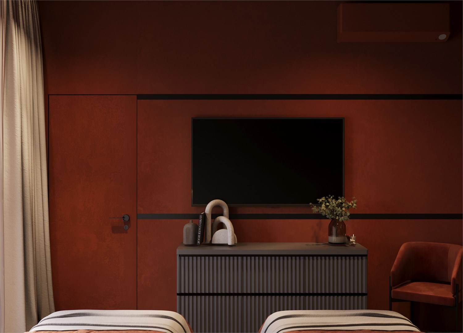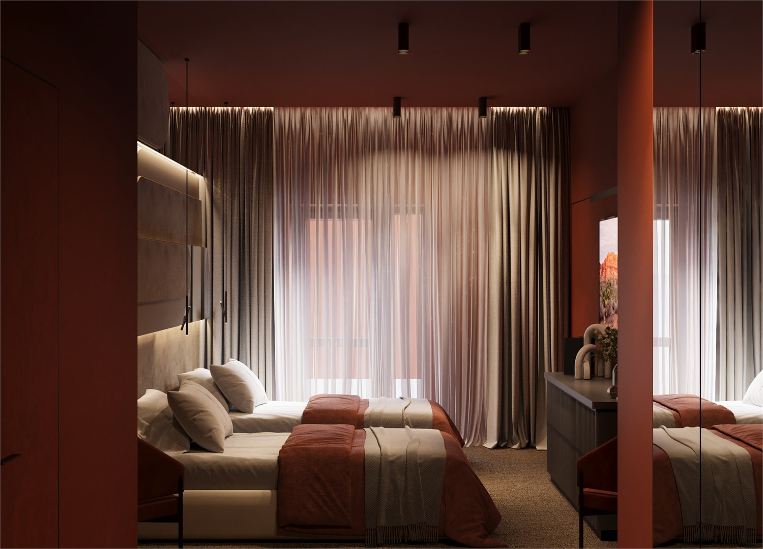 В номере: вешалка, зеркало, кровати односпальные /одна двуспальная кровать, прикроватные столики, стол, столик туалетный, стул, шкаф, кондиционер, телевизор, холодильник, чайная станция