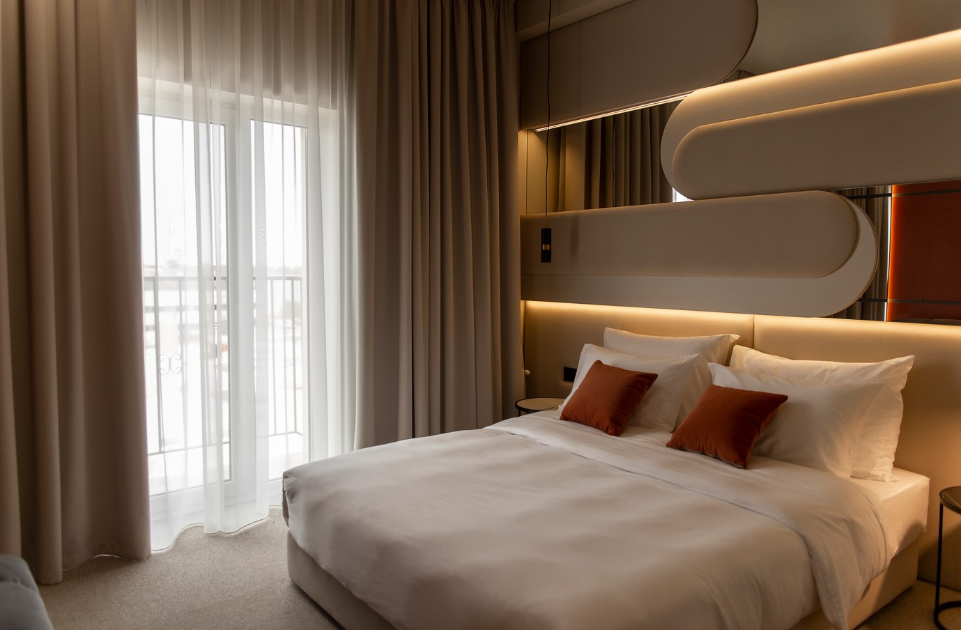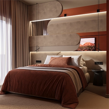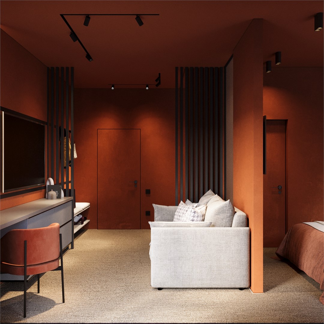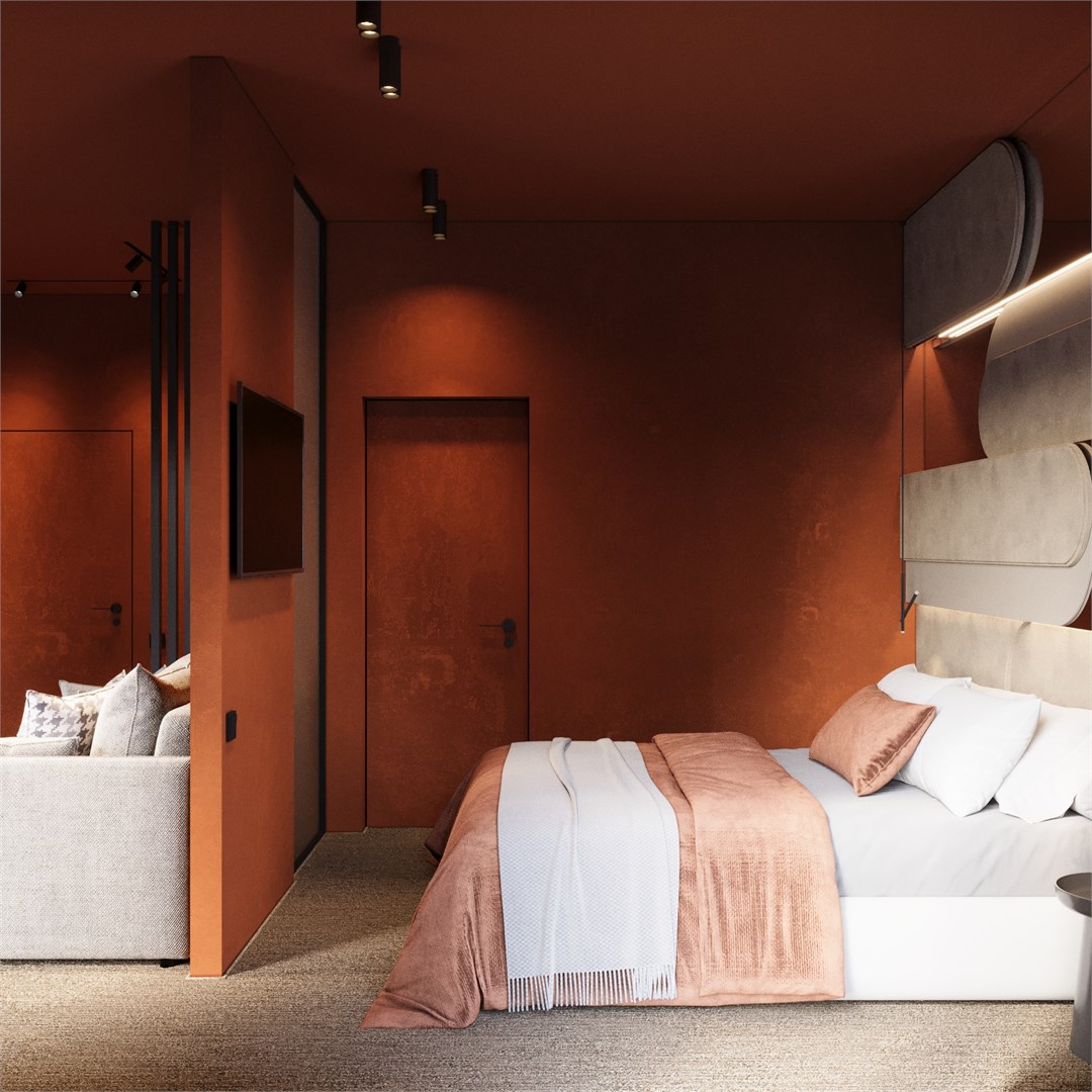 В номере: вешалка, диван, кровать двуспальная, прикроватные столики, стол, столик туалетный, стул, шкаф, кондиционер, телевизор, холодильник, чайная станция