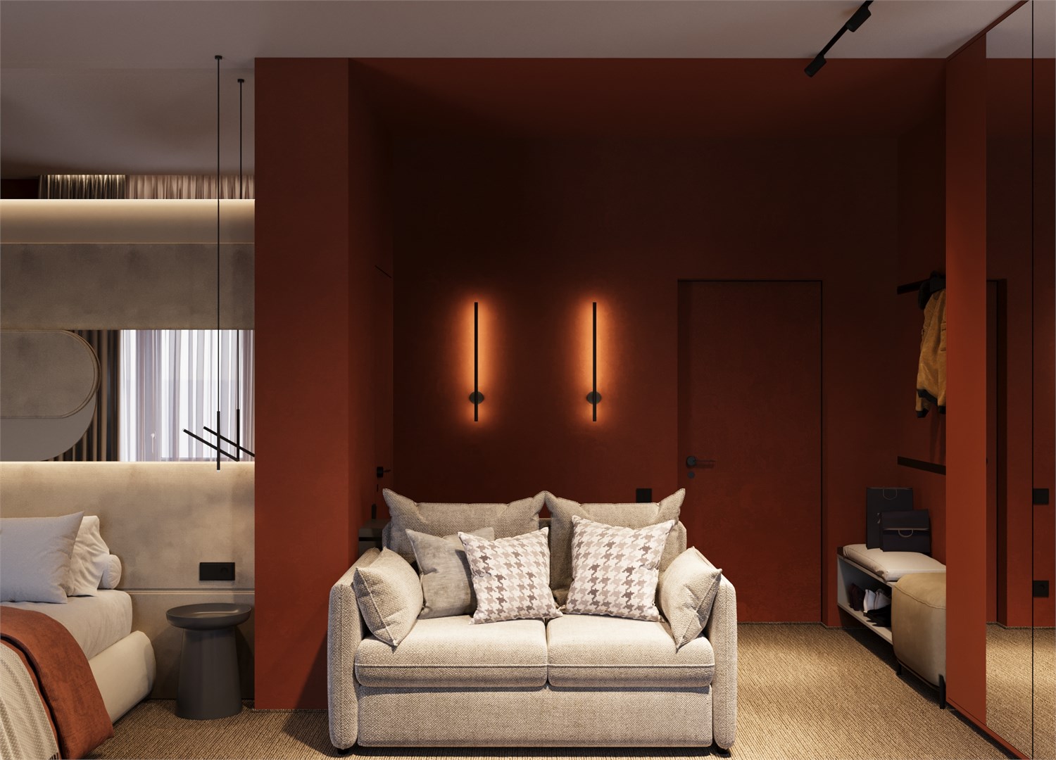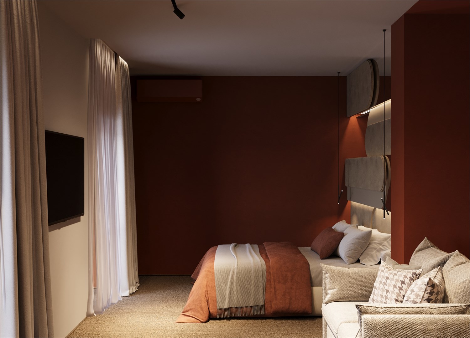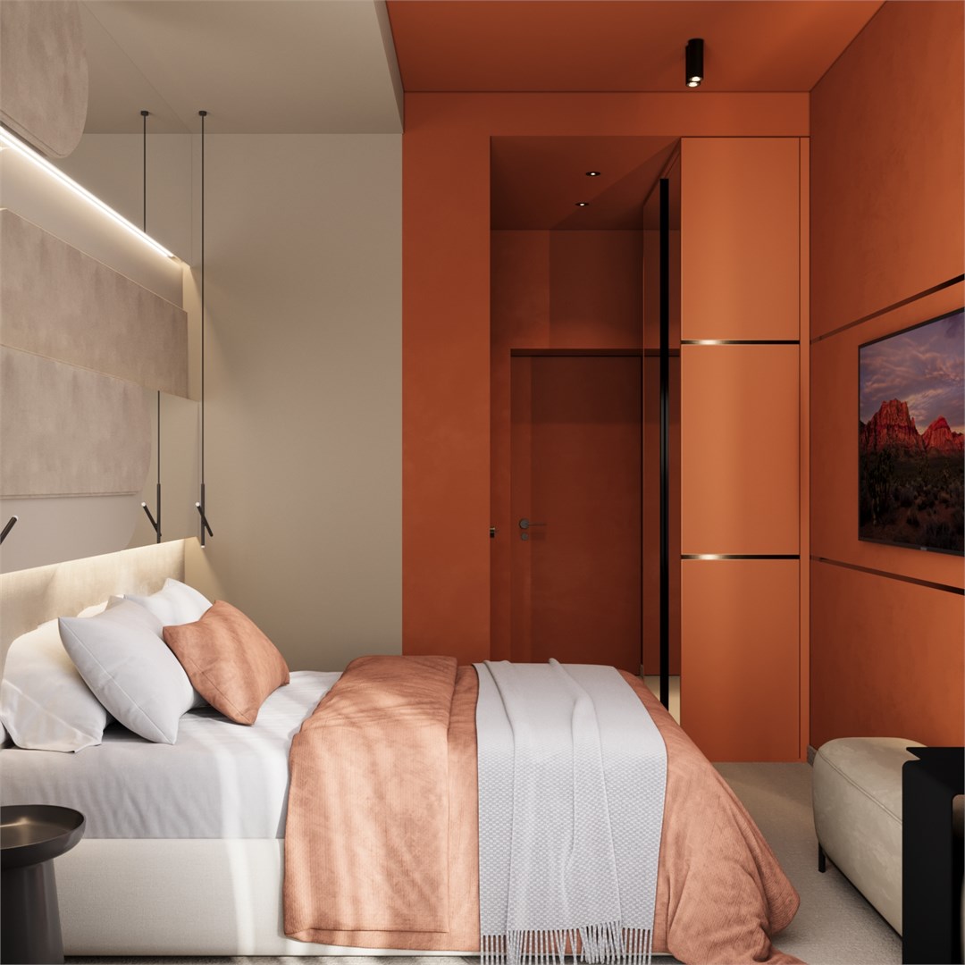 В номере: вешалка, диван, кровать двуспальная, прикроватные столики, стол, столик туалетный, стул, шкаф, кондиционер, телевизор, холодильник, чайная станция