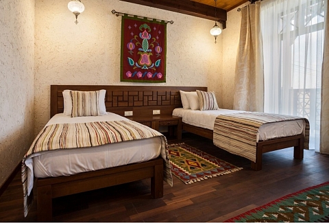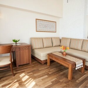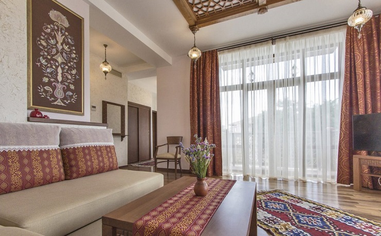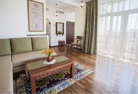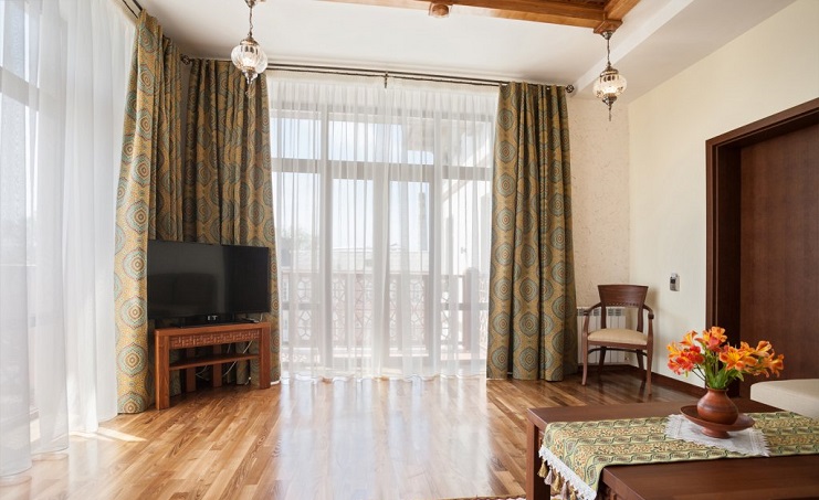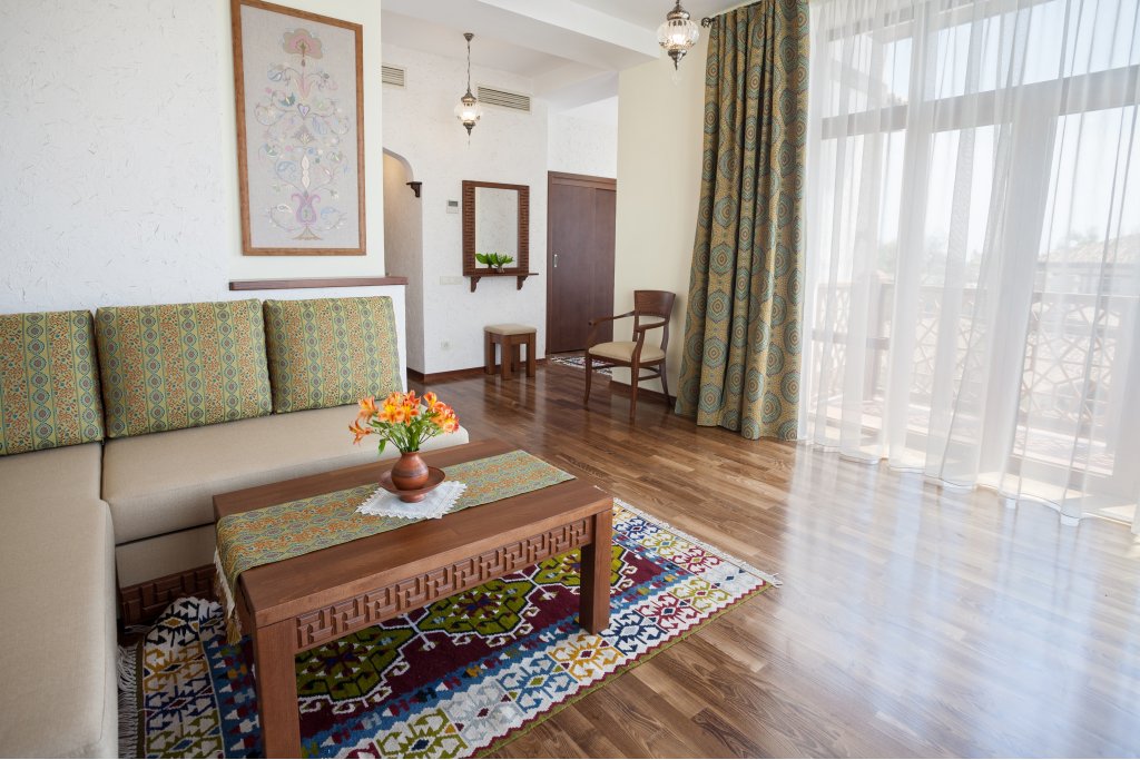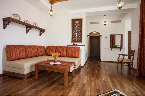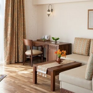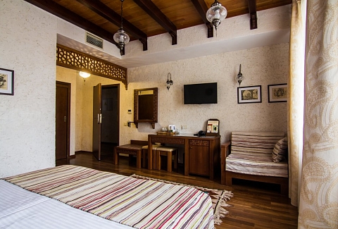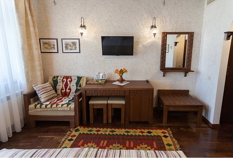 В номере: вешалка, диван, зеркало, кровати односпальные /одна двуспальная кровать, прикроватные тумбочки, стол, стулья, шкаф, мини-холодильник, набор посуды, сейф, сплит-система, телевизор, телефон, электрочайник