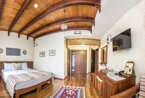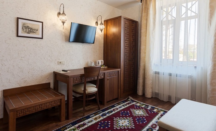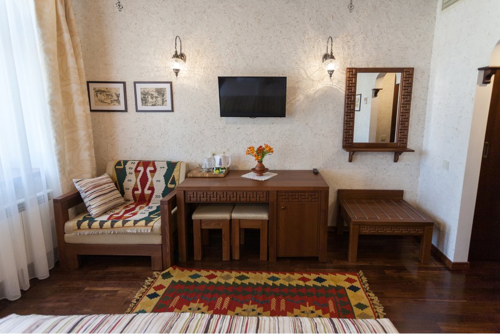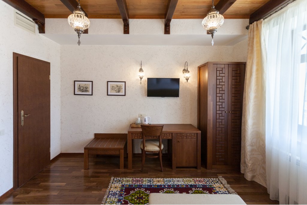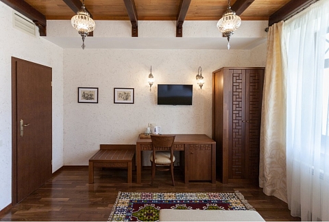 В номере: вешалка, зеркало, кресло-кровать, кровати односпальные /одна двуспальная кровать, прикроватные тумбочки, стол, стулья, шкаф, мини-холодильник, набор посуды, сейф, сплит-система, телевизор, телефон, электрочайник