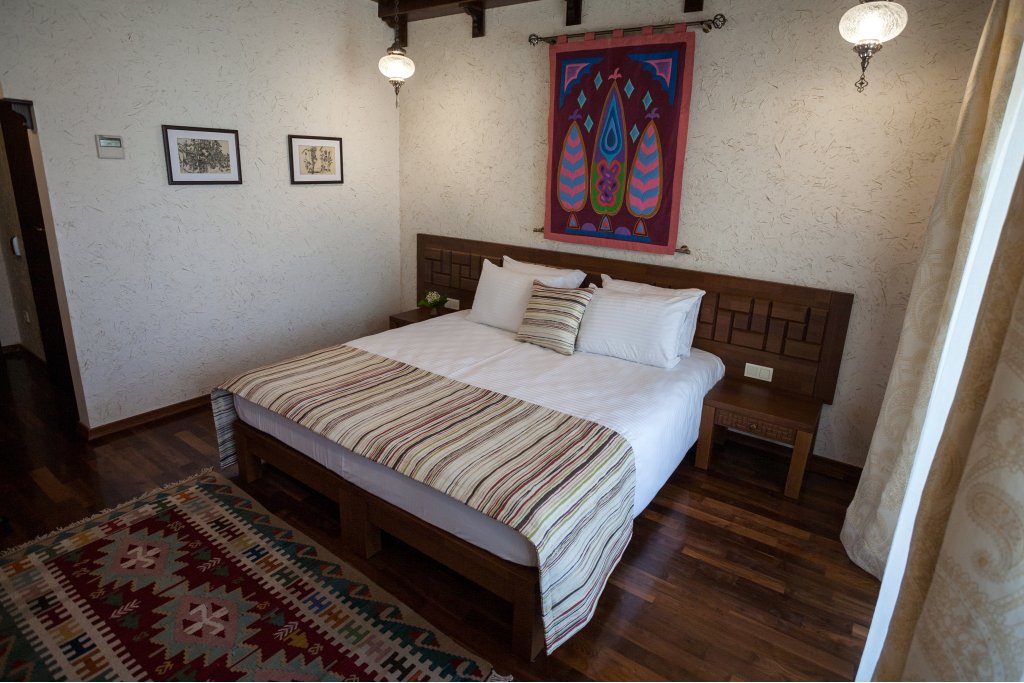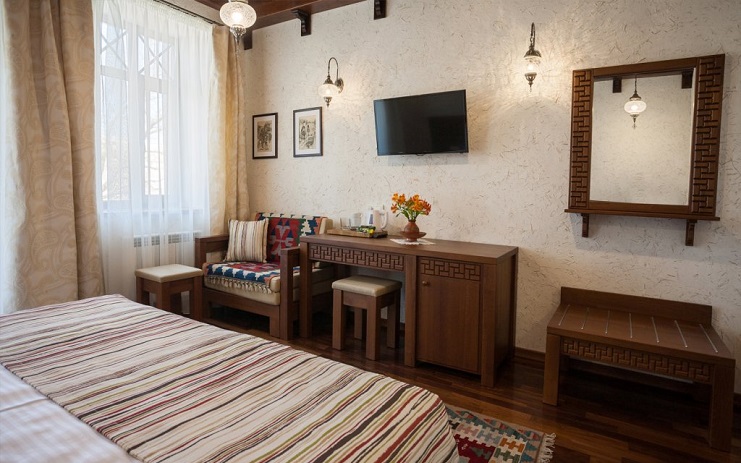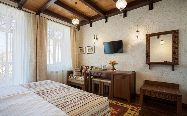 В номере: вешалка, диван, зеркало, кровать двуспальная, прикроватные тумбочки, стол, стулья, шкаф, мини-холодильник, набор посуды, сейф, сплит-система, телевизор, телефон, электрочайник