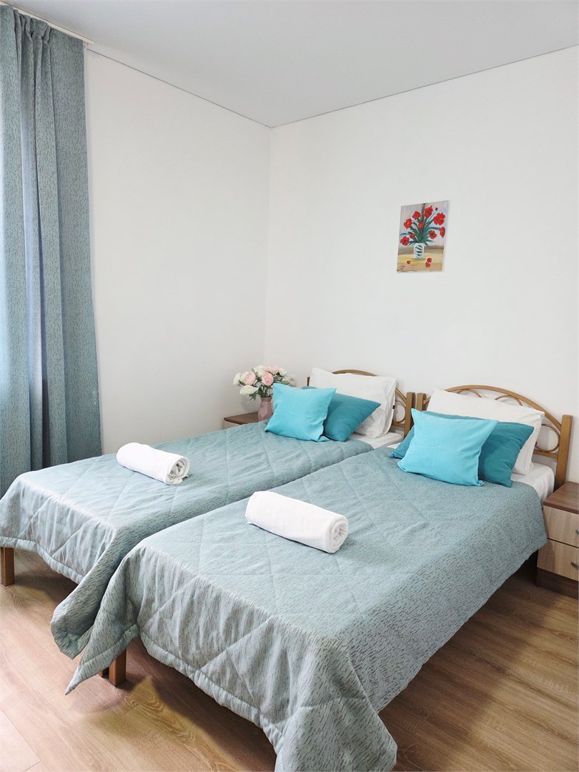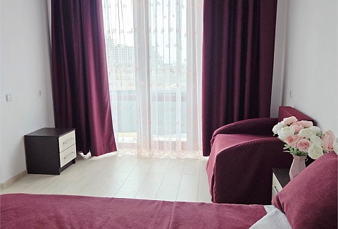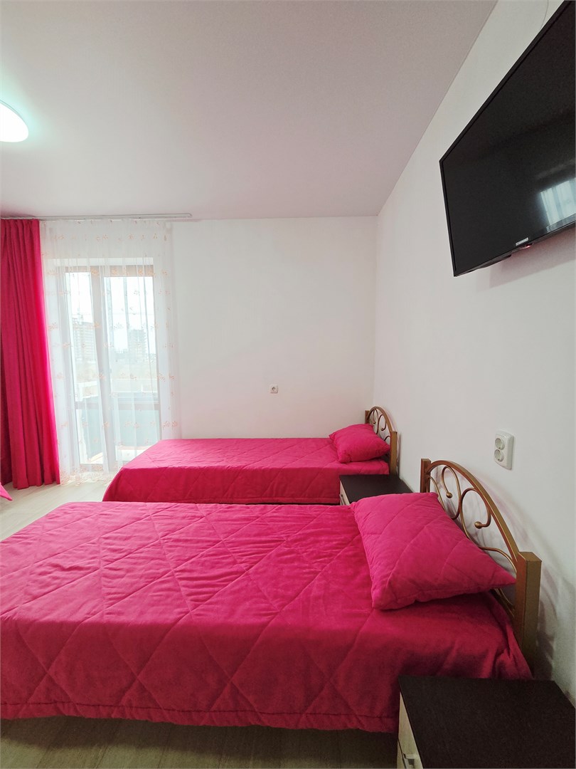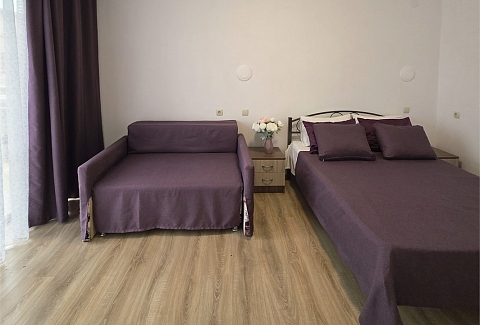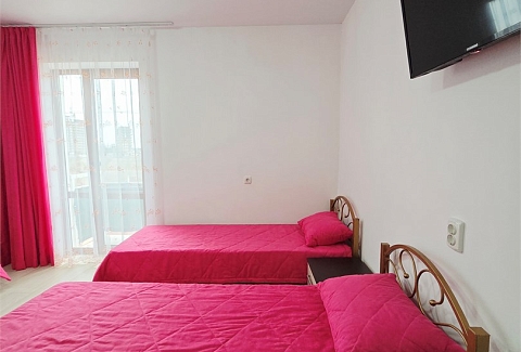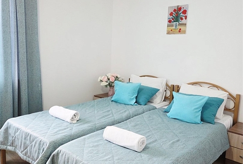 В номере: вешалка, зеркало, кресло-кровать, кровать двуспальная, кровать односпальная, прикроватные тумбочки, стол, стулья, шкаф, кондиционер, телевизор, холодильник