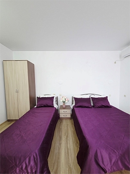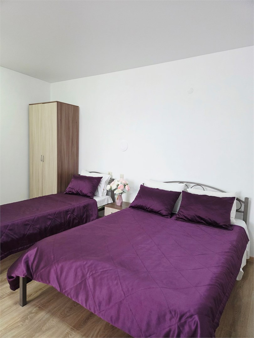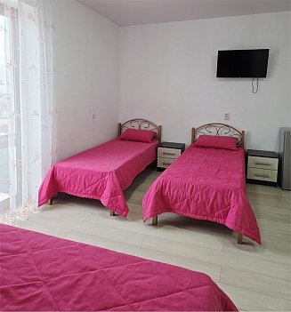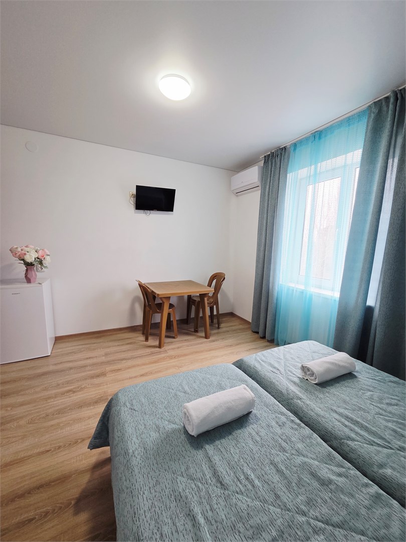 В номере: вешалка, зеркало, кровать двуспальная, кровать односпальная, прикроватные тумбочки, стол, стулья, шкаф, кондиционер, телевизор, холодильник