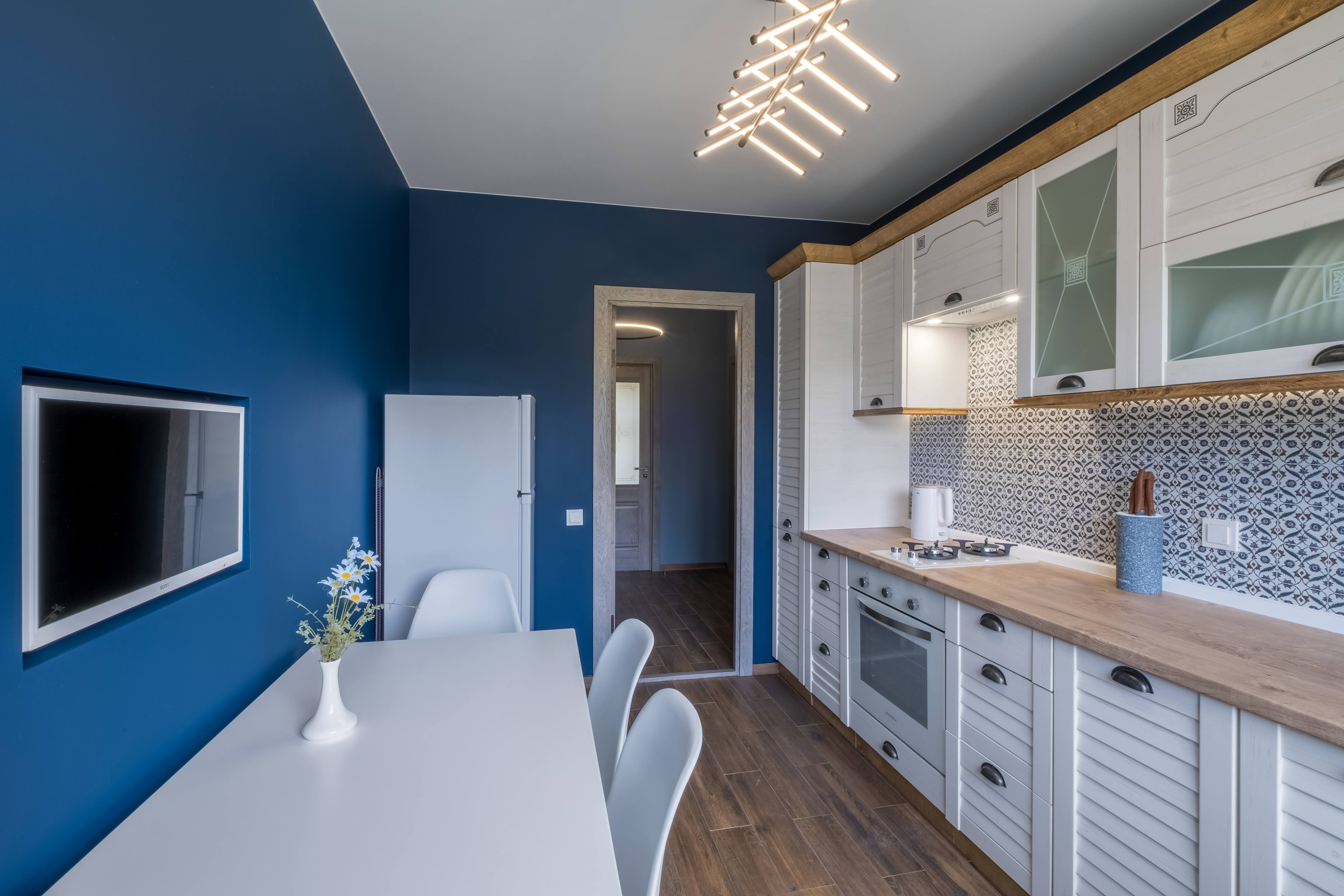 В номере: вешалка, зеркало, кровать двуспальная, кухонная мебель, прикроватные тумбочки, стол, стулья, тумба, шкаф, кондиционер, микроволновая печь, набор посуды, плита газовая, телевизор, холодильник, электрочайник