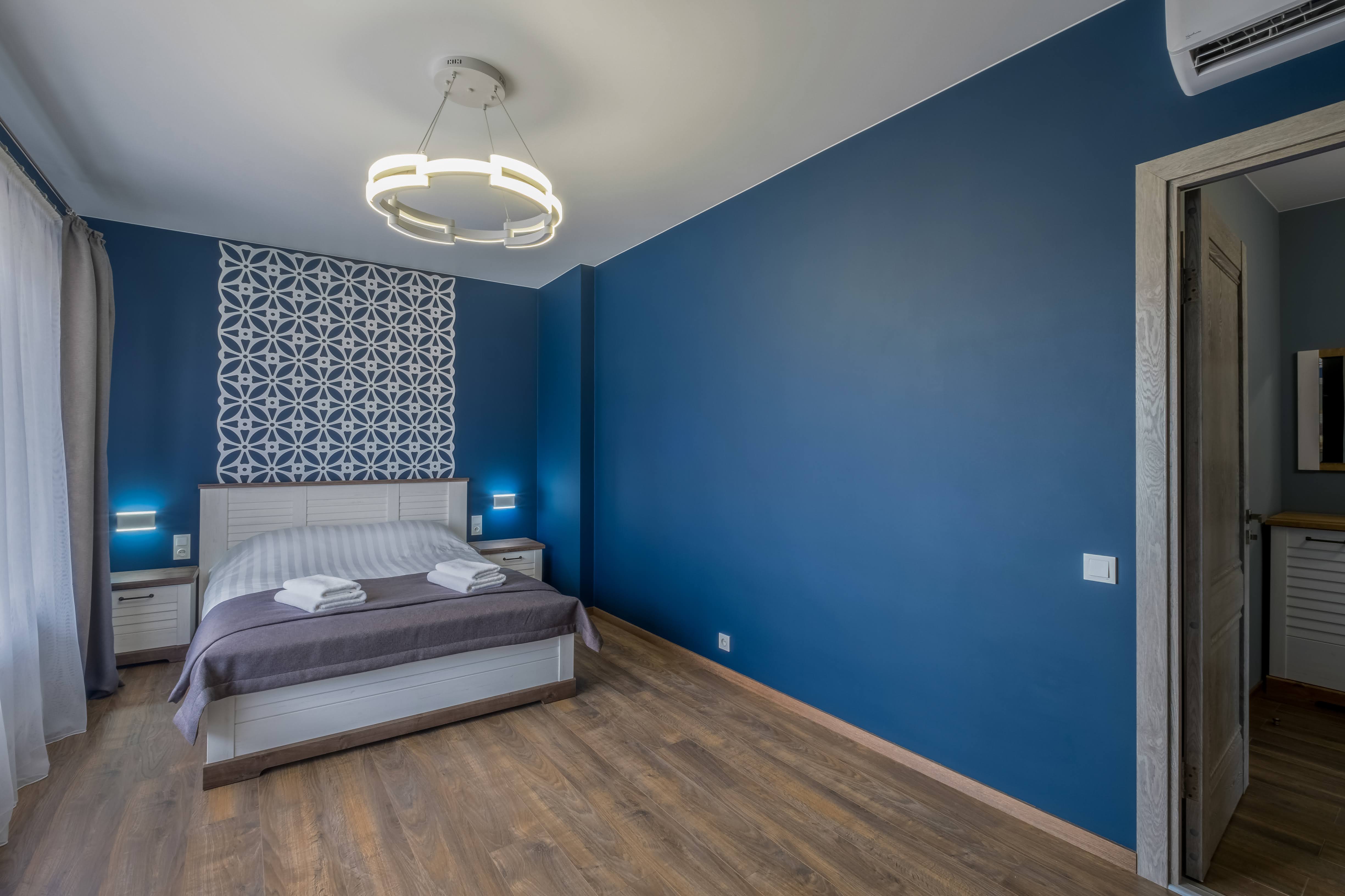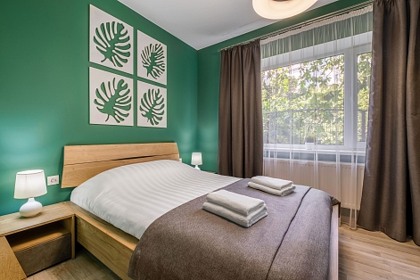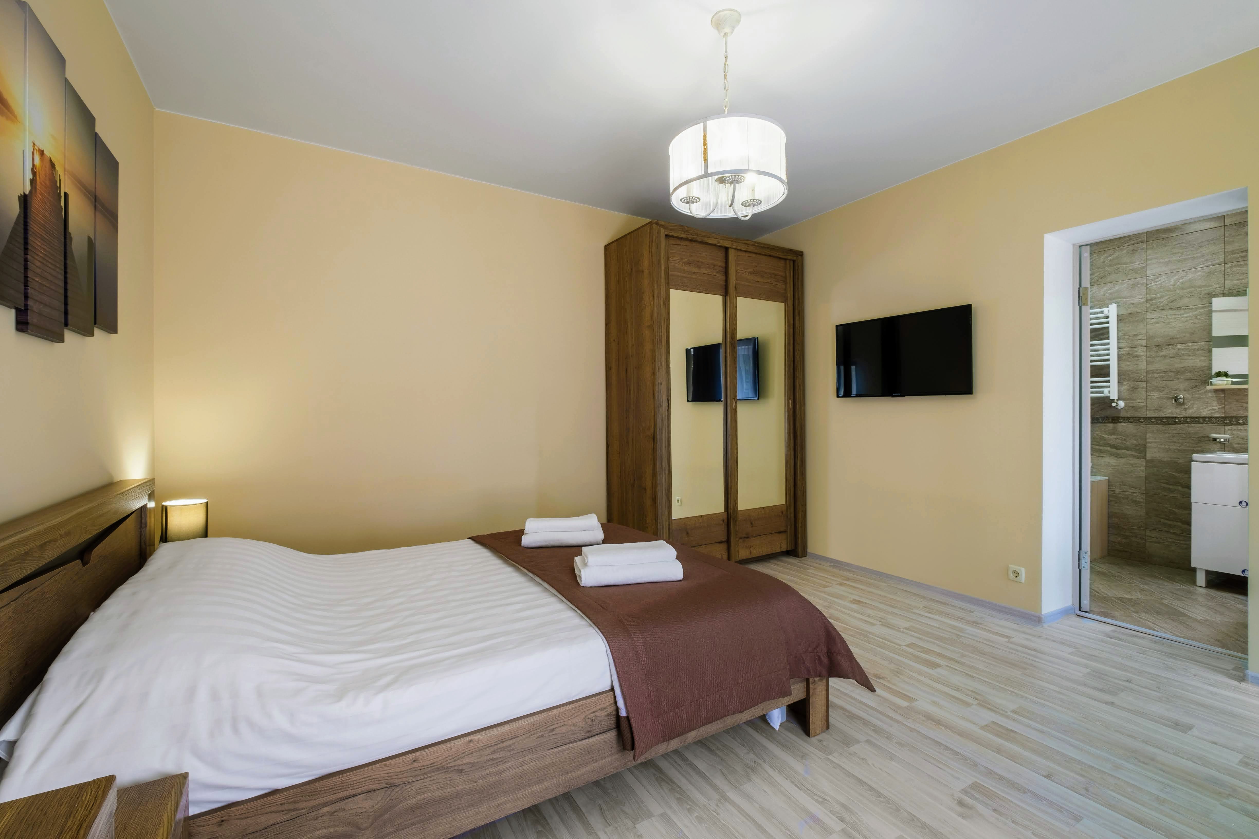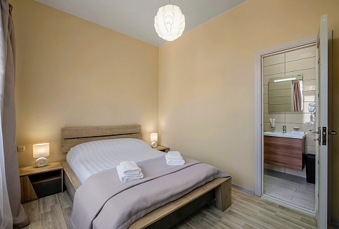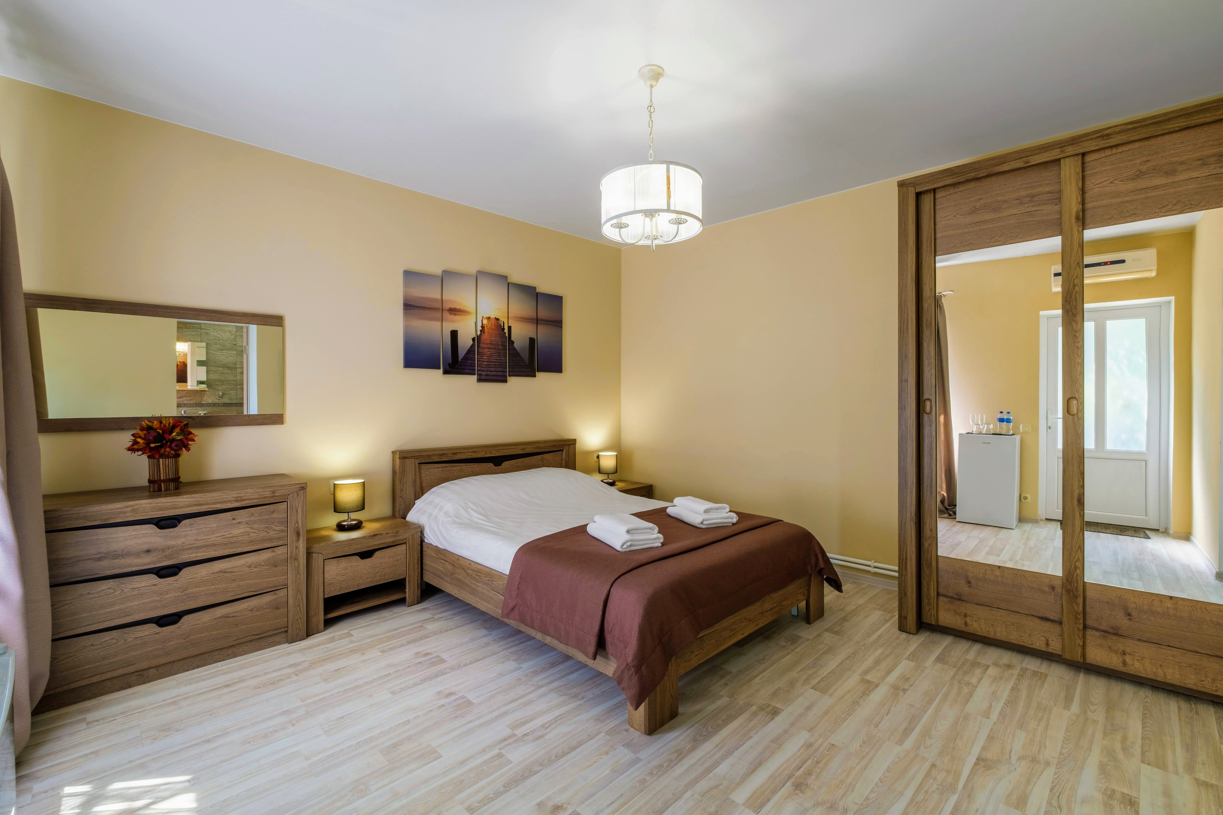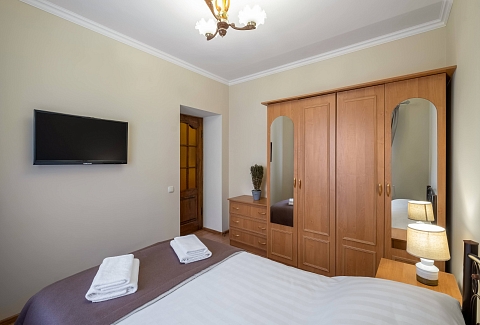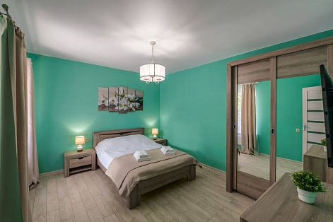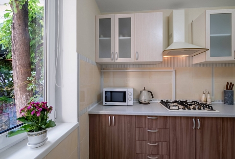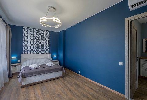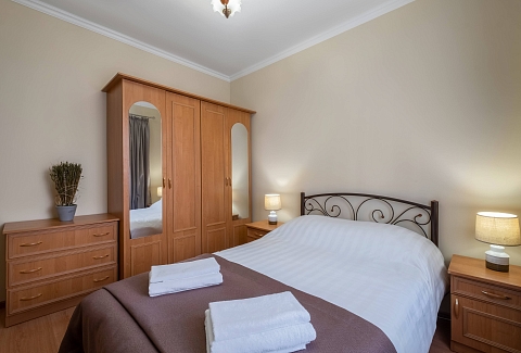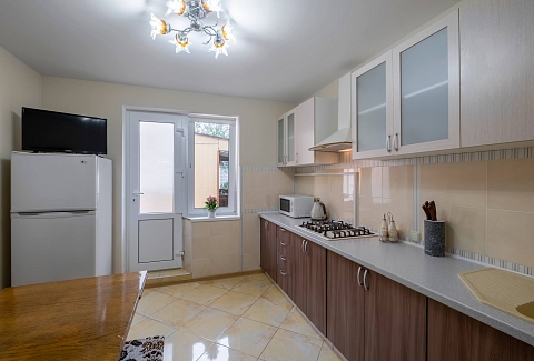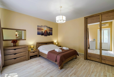 В номере: вешалка, диван, зеркало, кровать двуспальная, кухонная мебель, прикроватные тумбочки, стол, стулья, тумба, шкаф, кондиционер, микроволновая печь, набор посуды, плита газовая, телевизор, холодильник, чайный набор посуды, электрочайник
