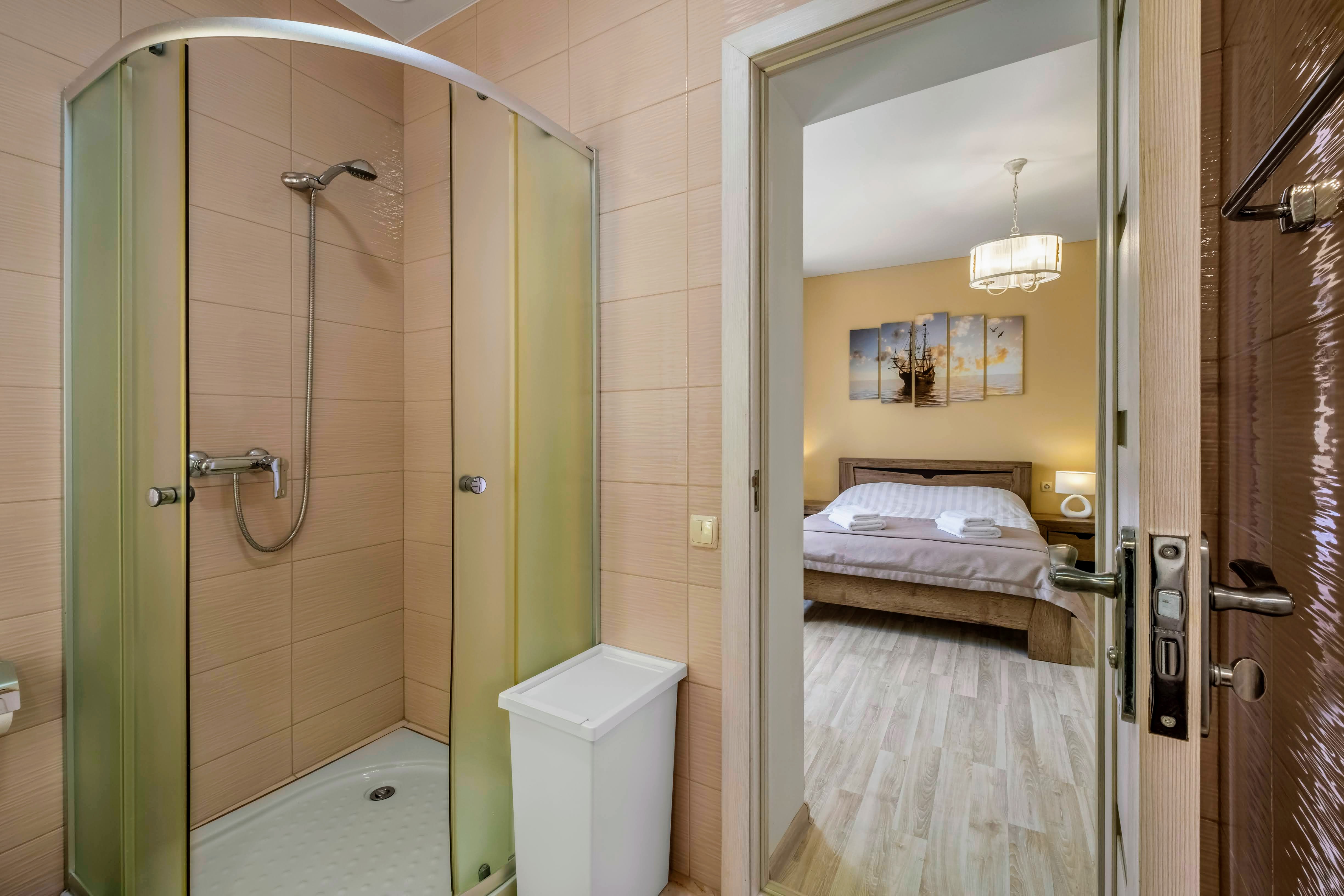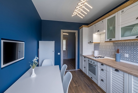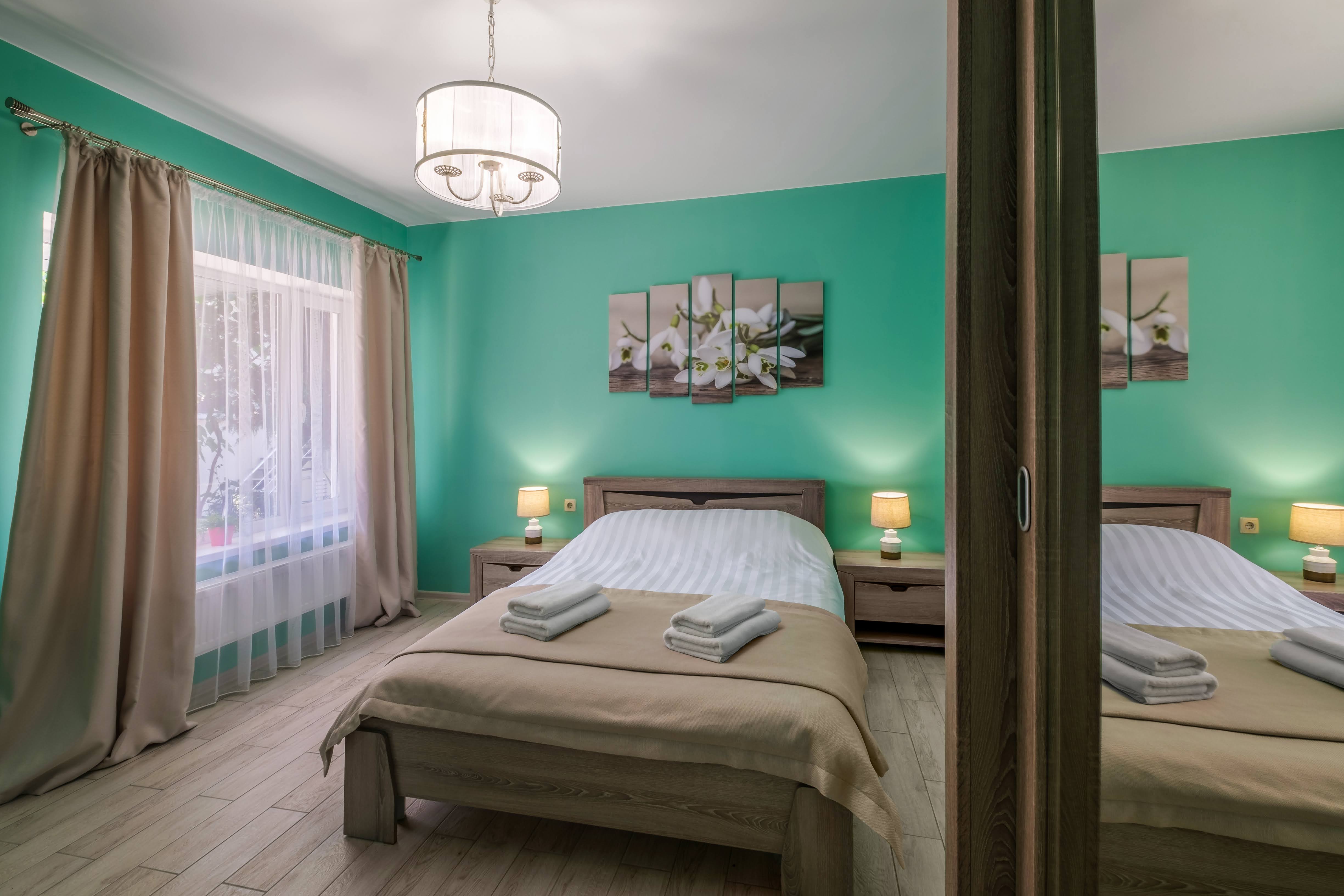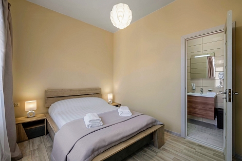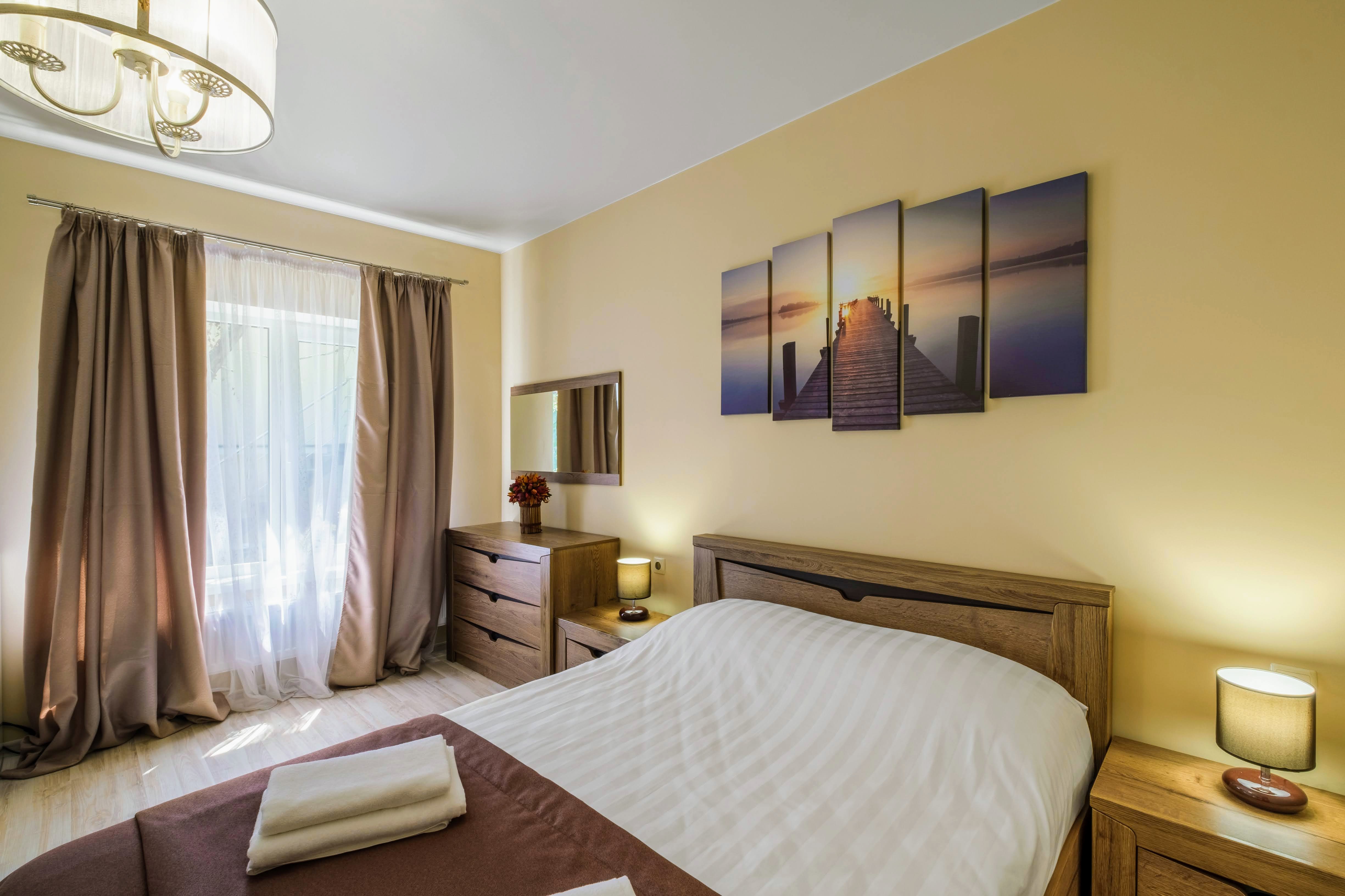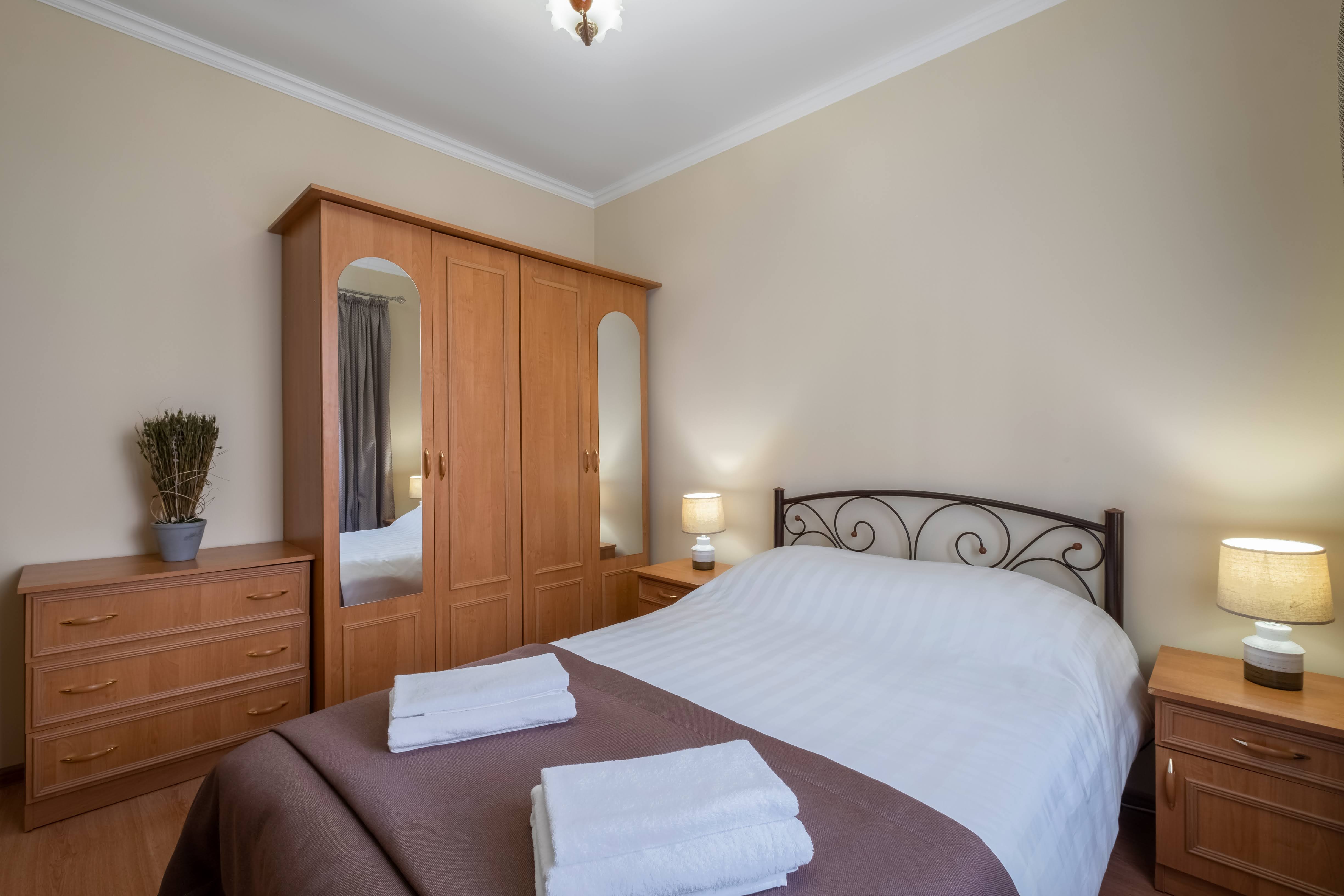 В номере: вешалка, диван, зеркало, кровать двуспальная, кухонная мебель, прикроватные тумбочки, стол, стулья, тумба, шкаф, кондиционер, микроволновая печь, набор посуды, плита газовая, телевизор, холодильник, чайный набор посуды, электрочайник