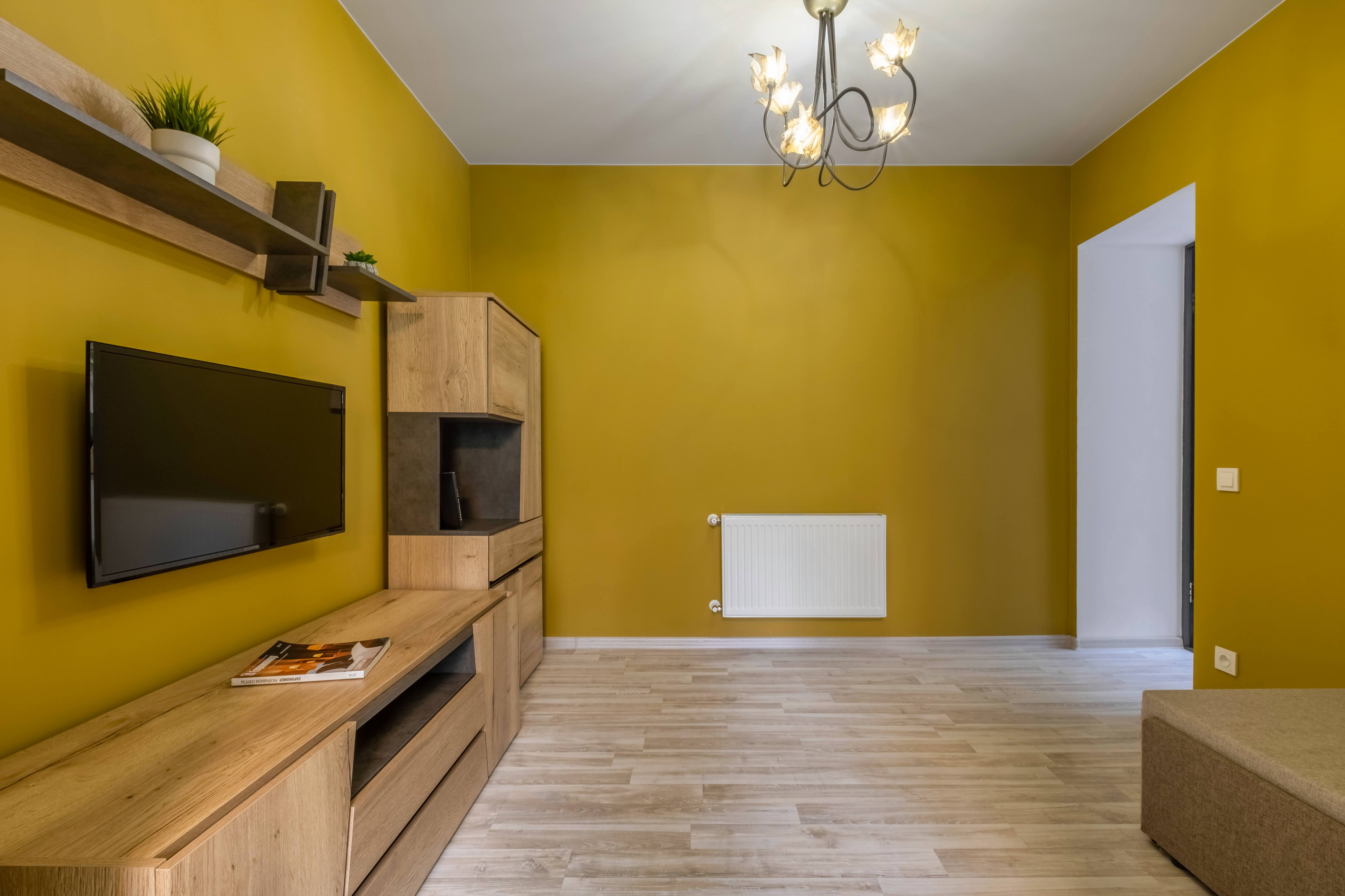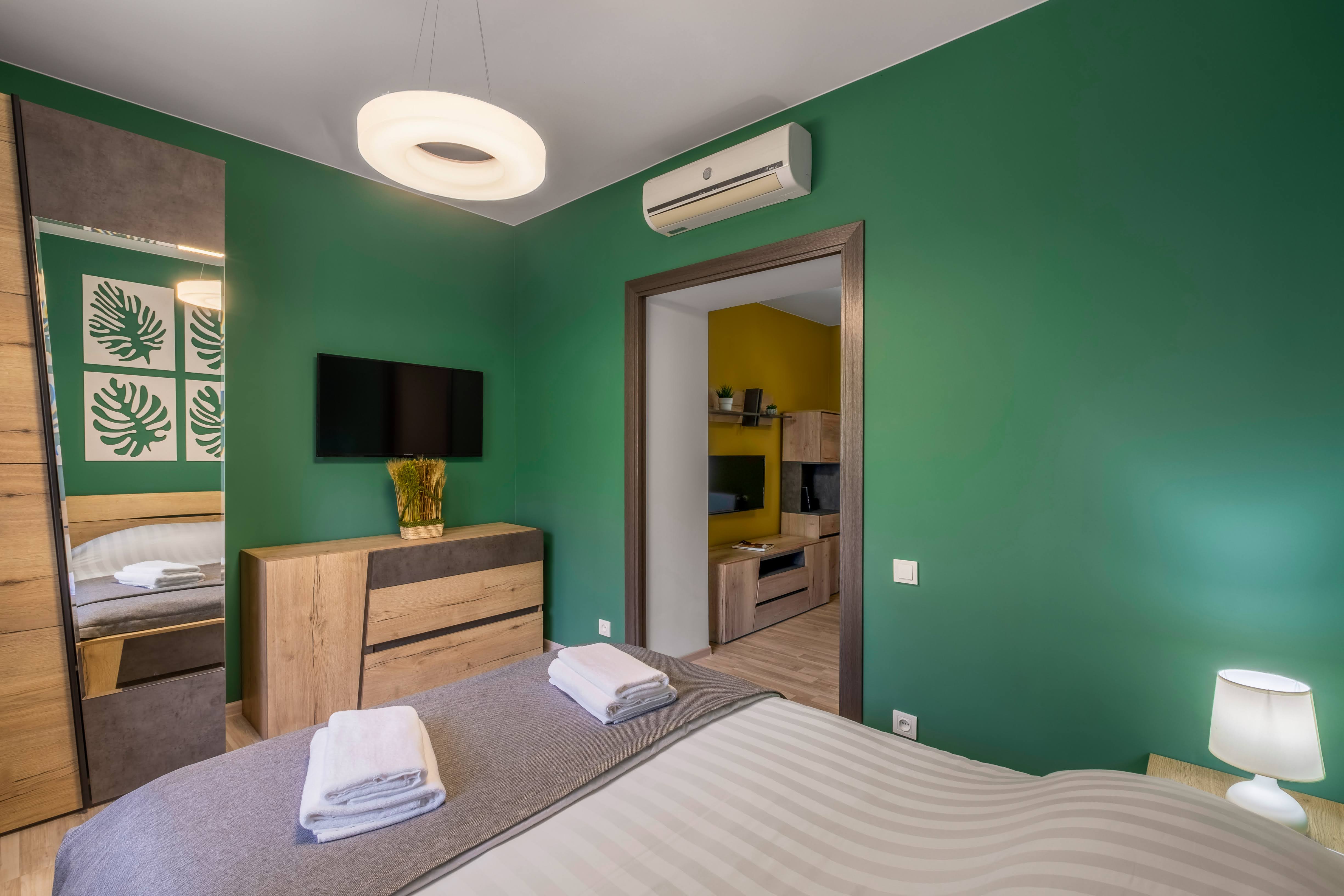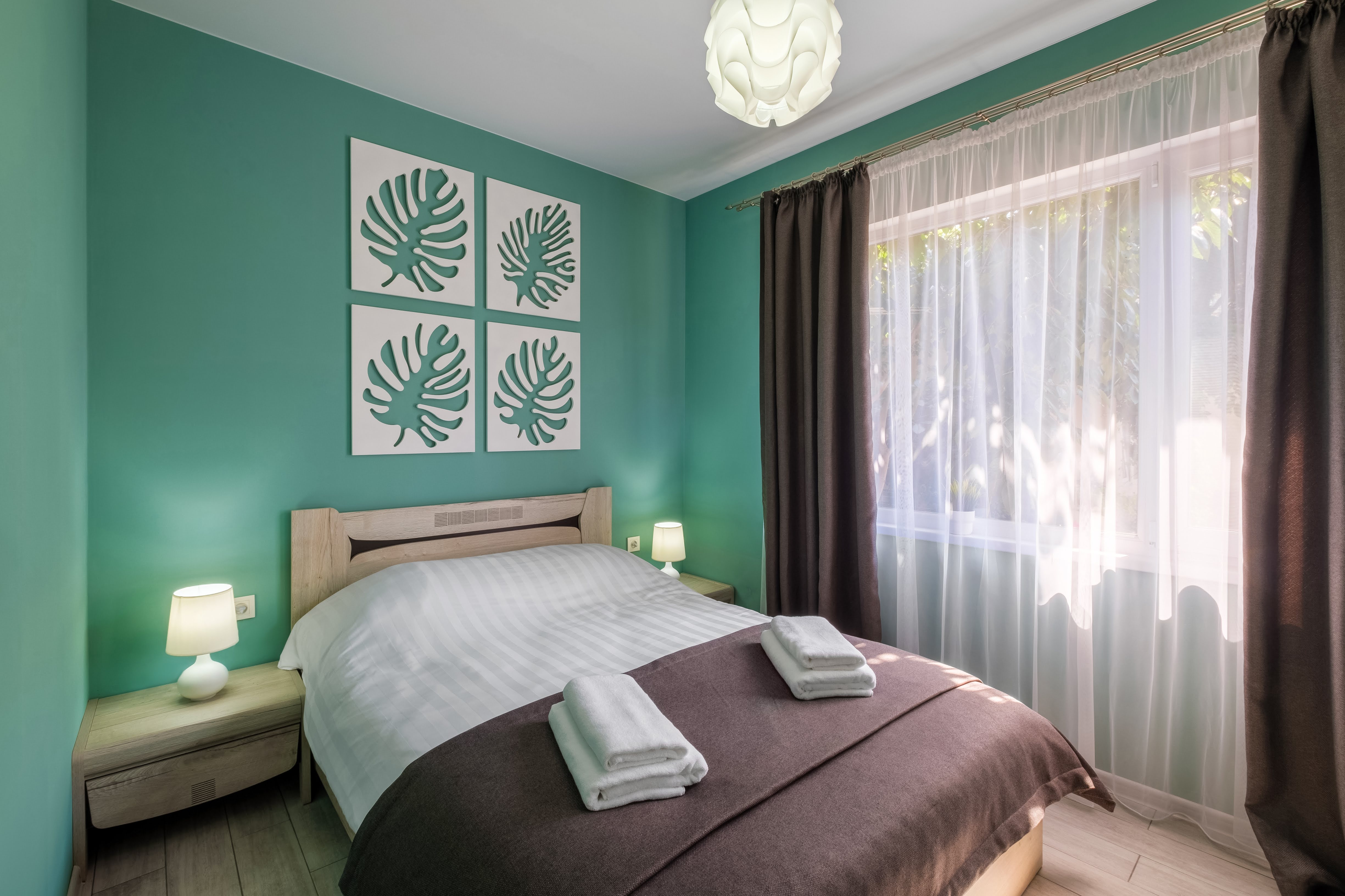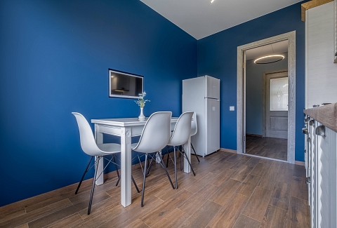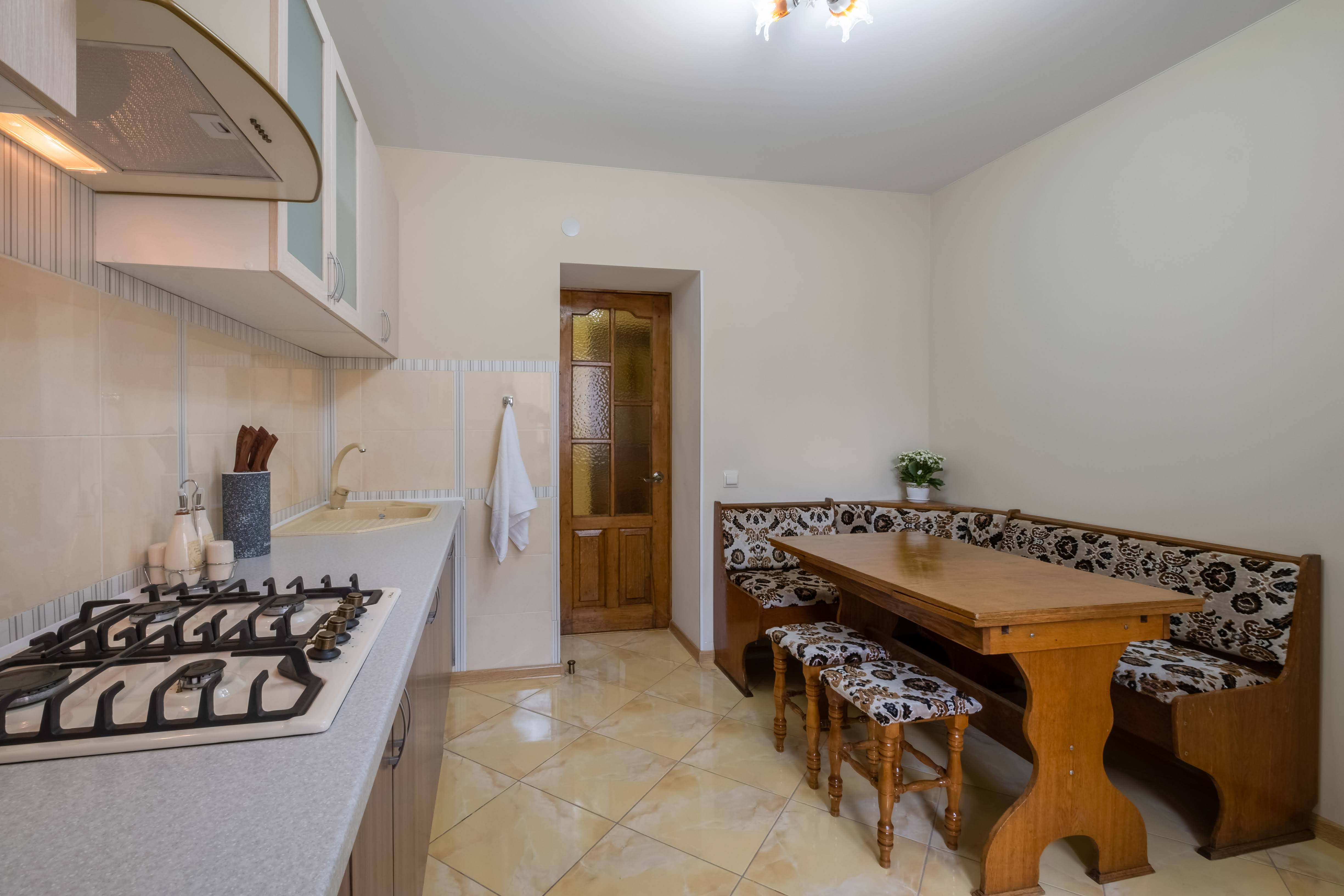 В номере: вешалка, диван, зеркало, кровать двуспальная, кухонная мебель, прикроватные тумбочки, стол, стулья, тумба, шкаф, кондиционер, микроволновая печь, набор посуды, плита газовая, телевизор, холодильник, чайный набор посуды, электрочайник