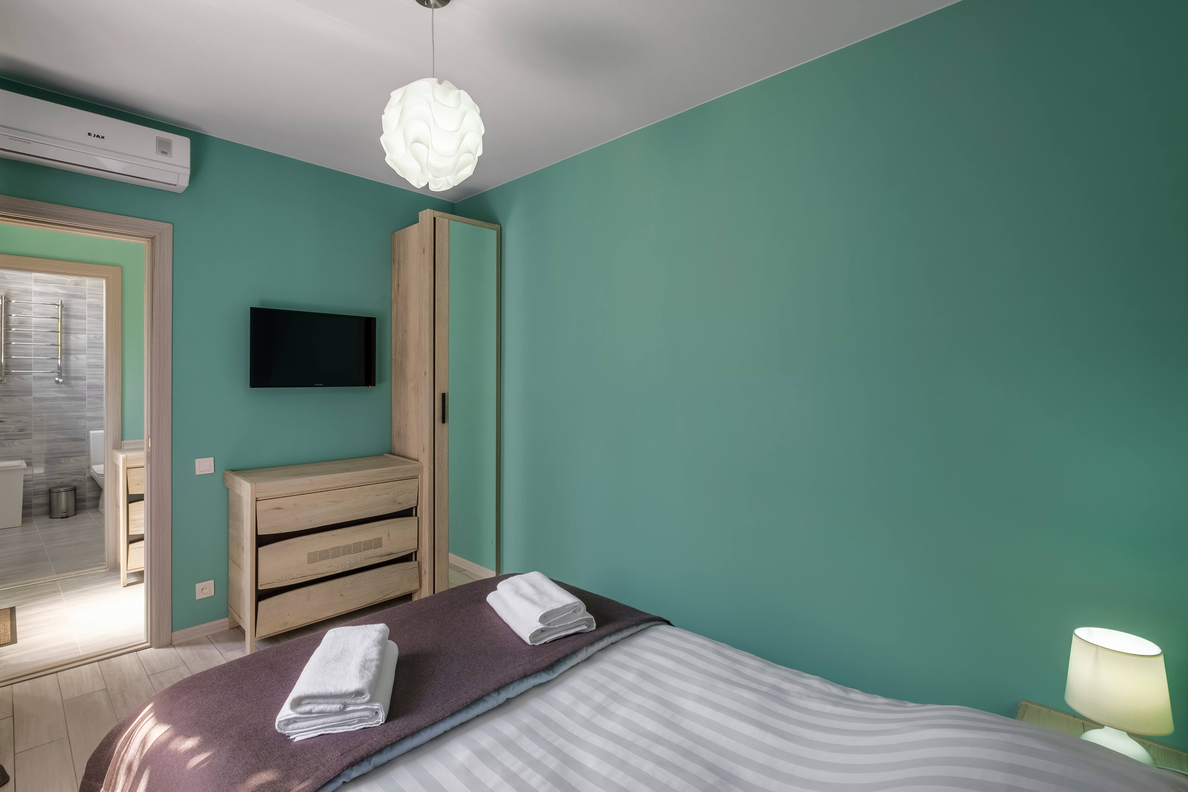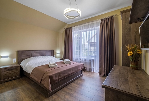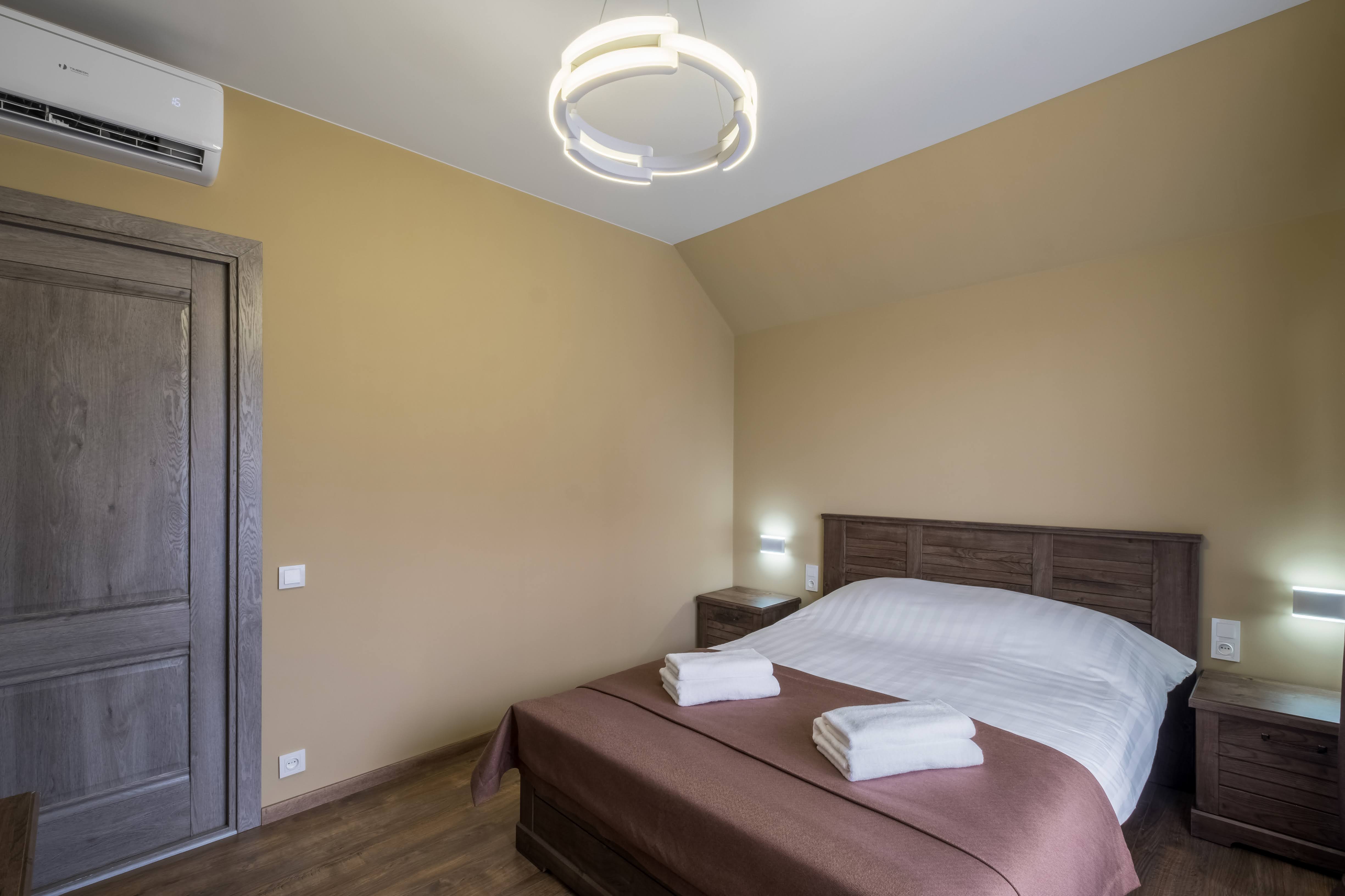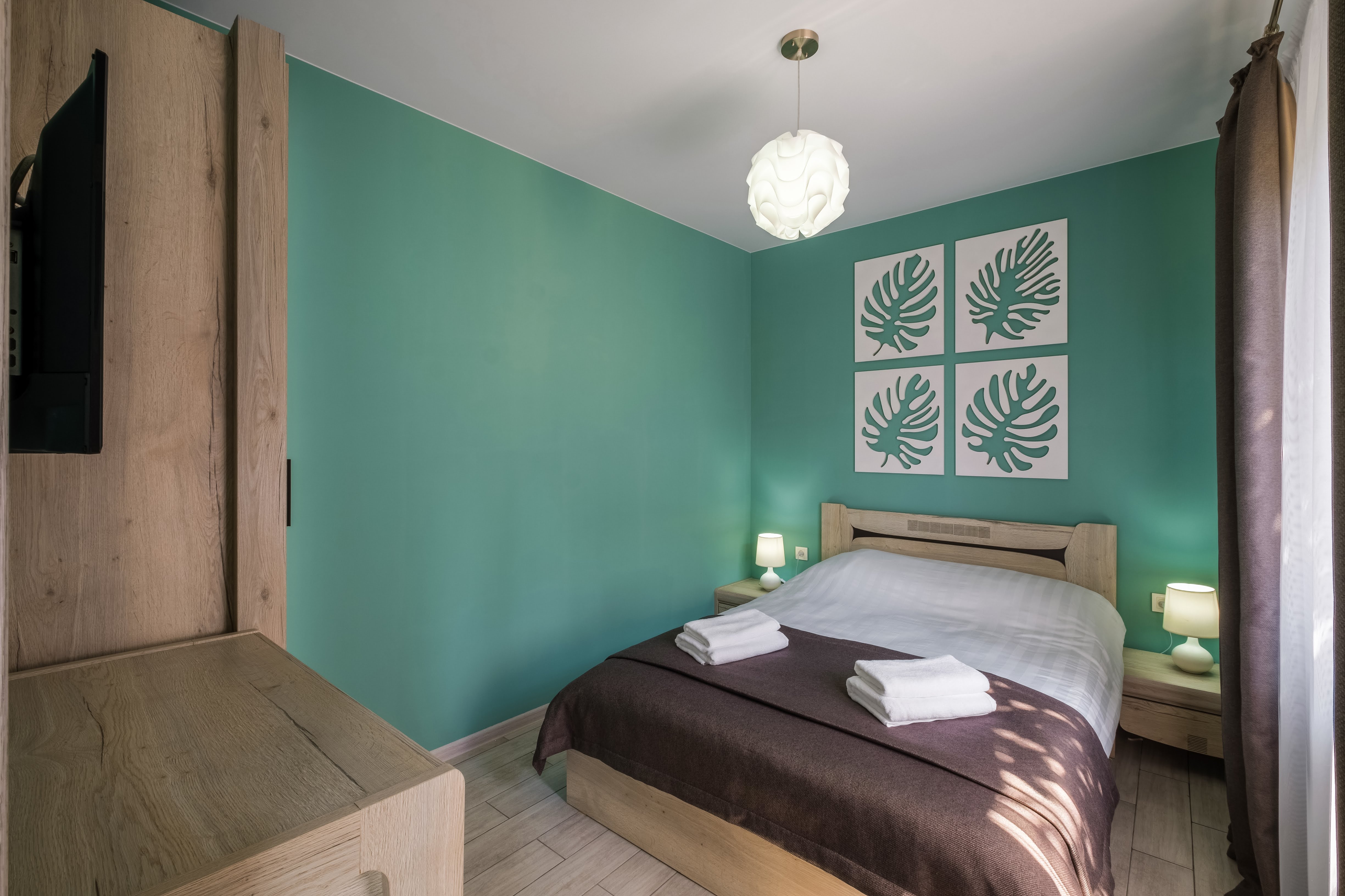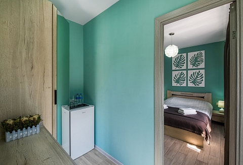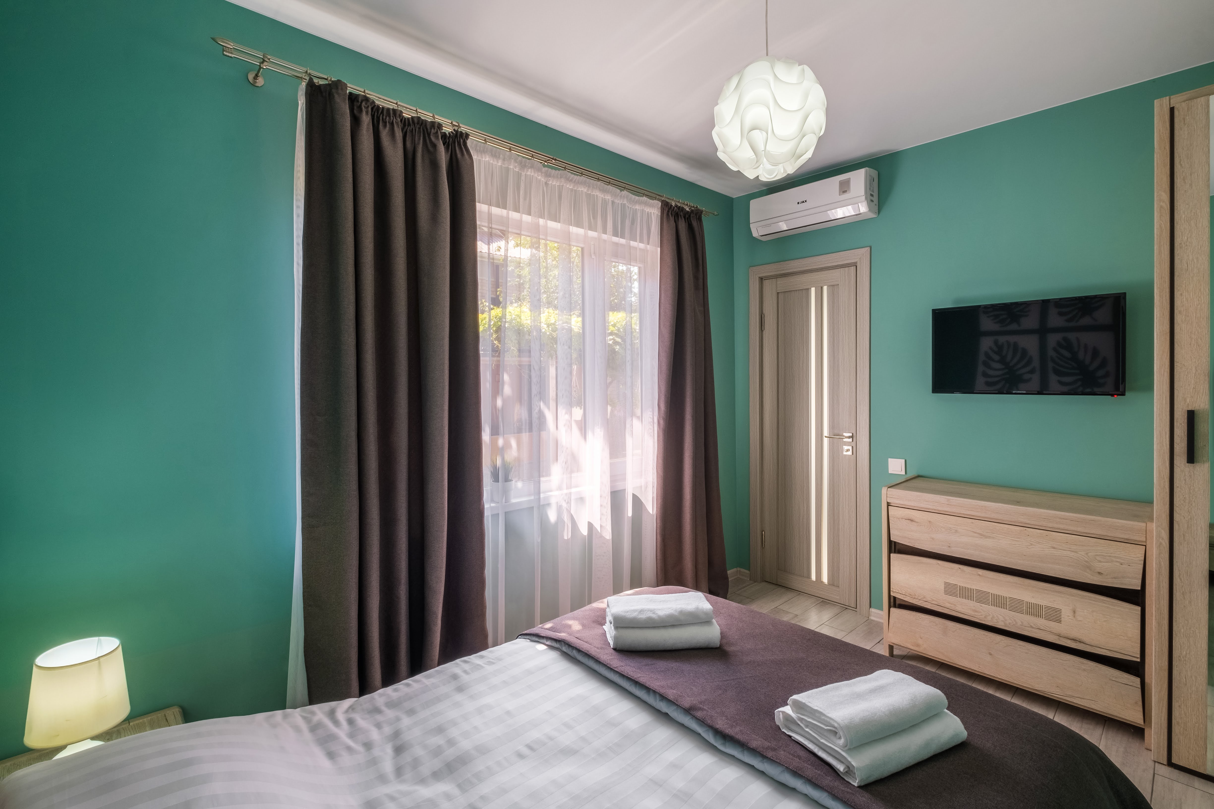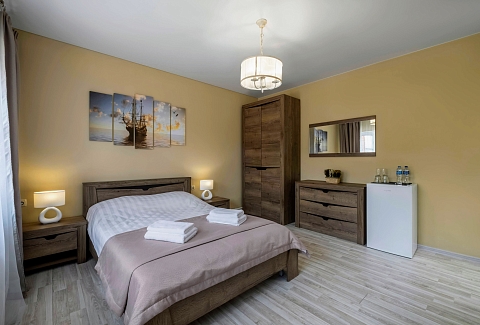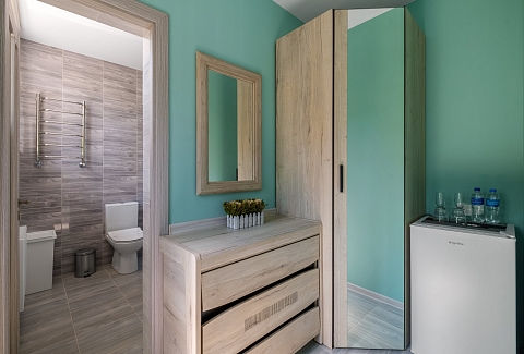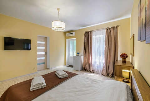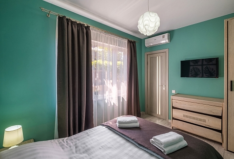 В номере: вешалка, зеркало, кровать двуспальная, прикроватные тумбочки, тумба, шкаф, кондиционер, мини-холодильник, телевизор, электрочайник