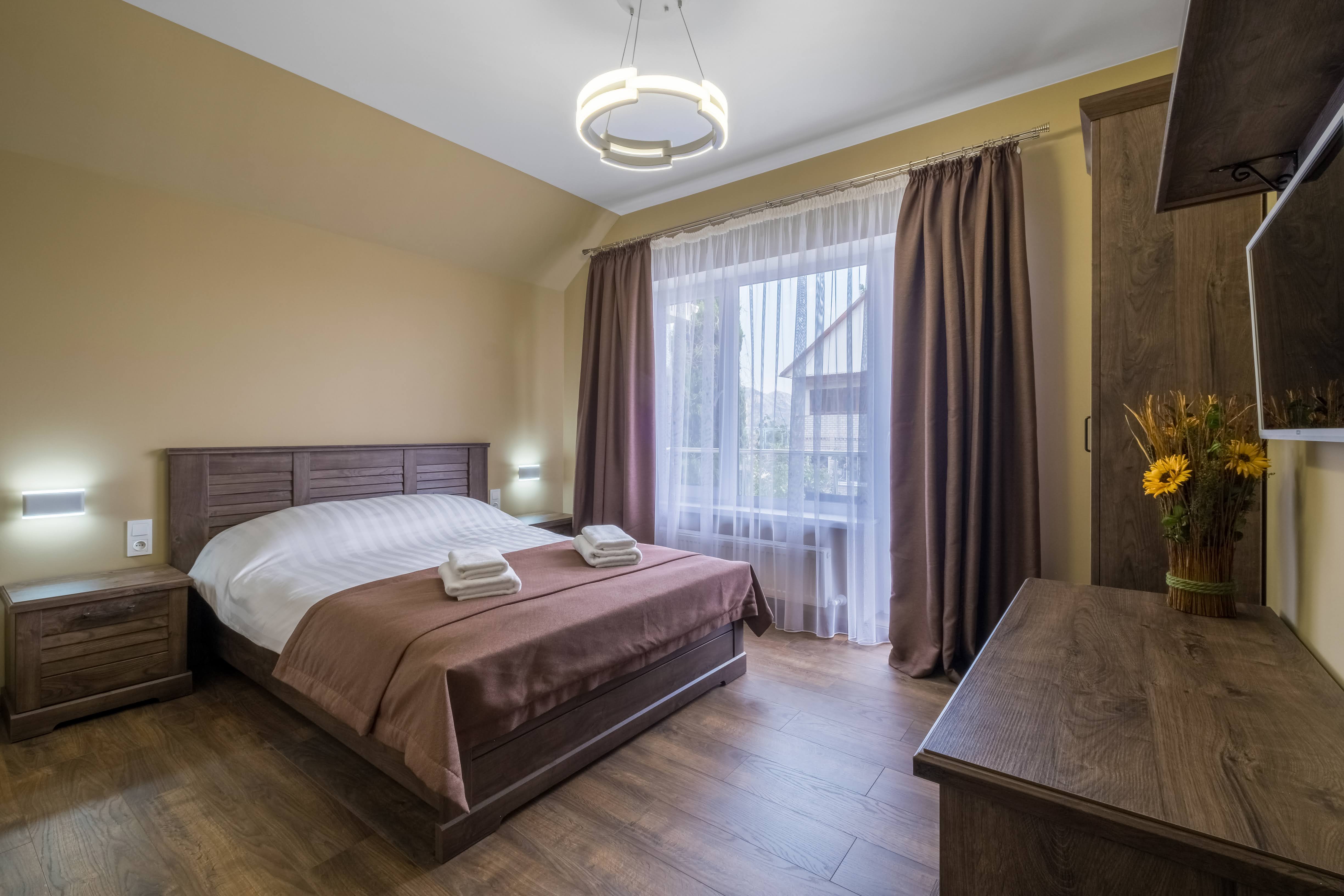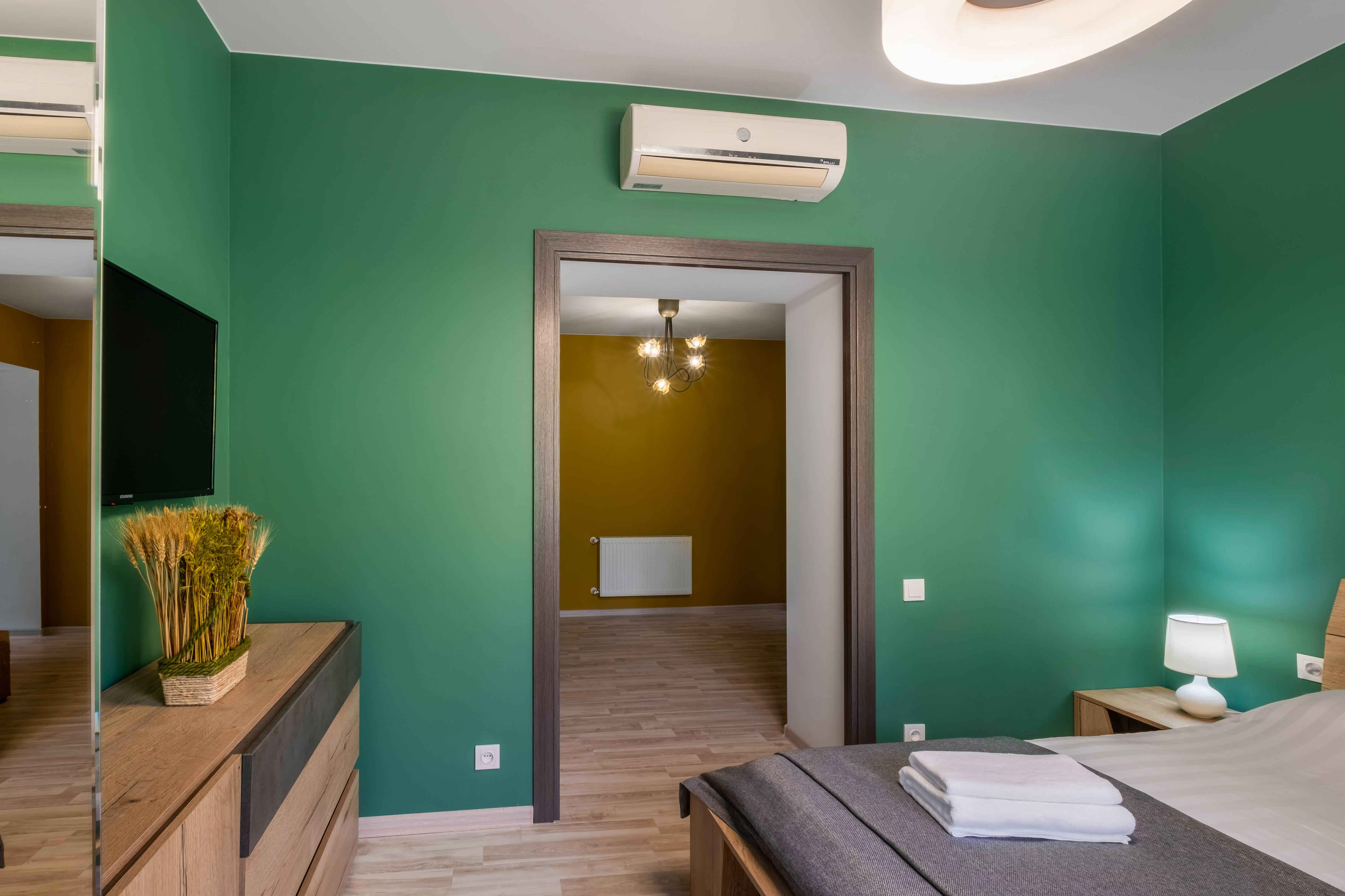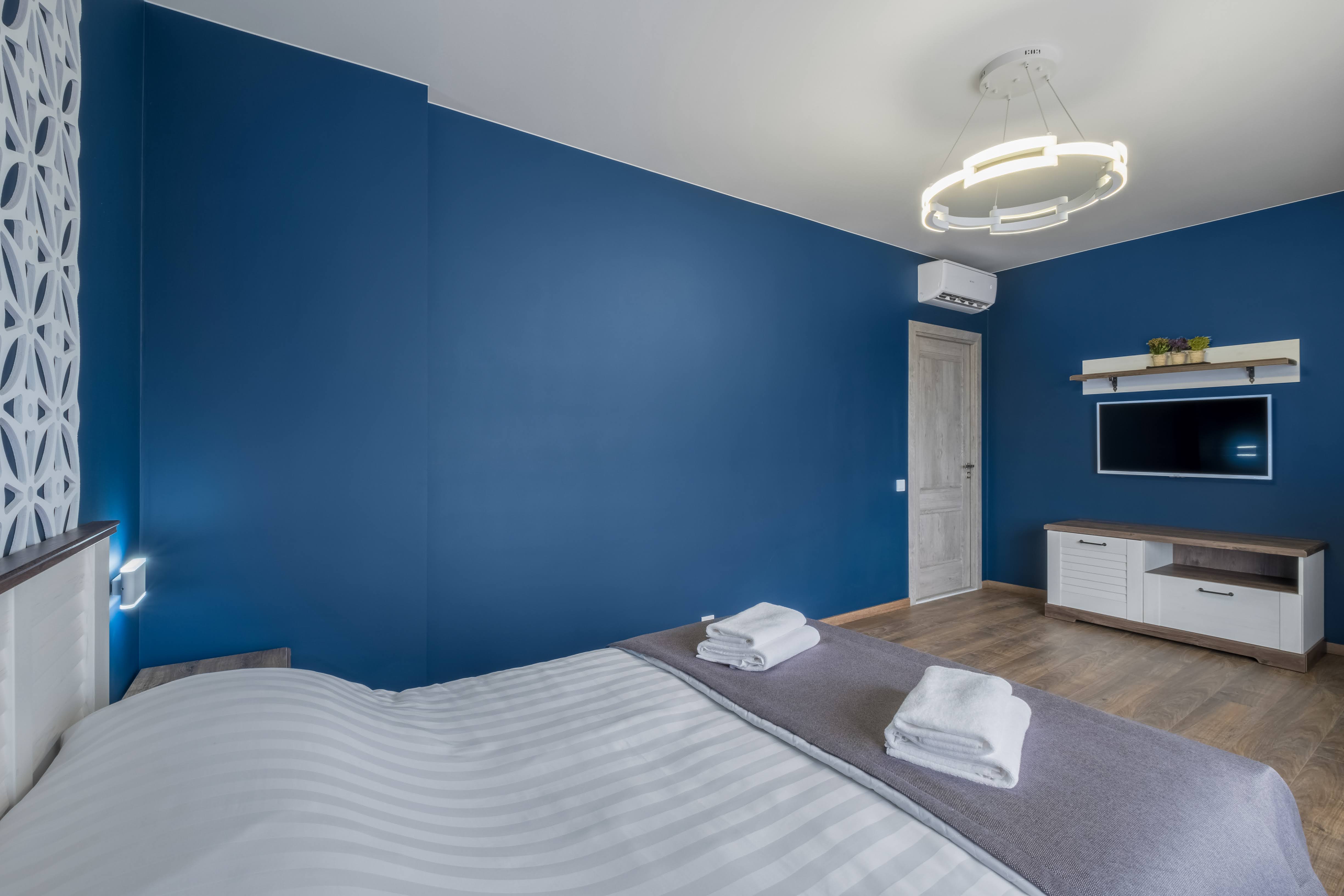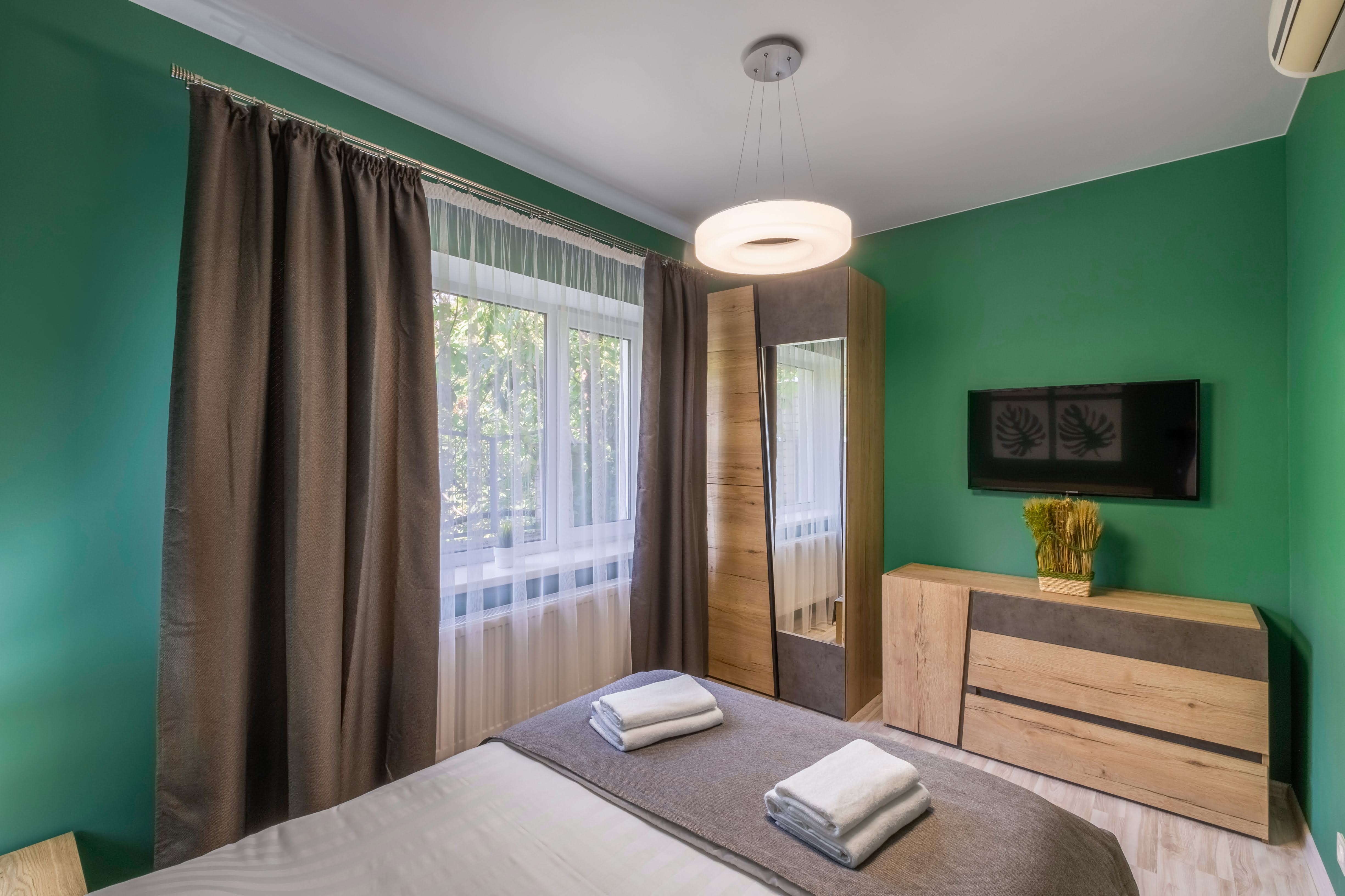 В номере: вешалка, зеркало, кровать двуспальная, прикроватные тумбочки, тумба, шкаф, кондиционер, мини-холодильник, телевизор, электрочайник