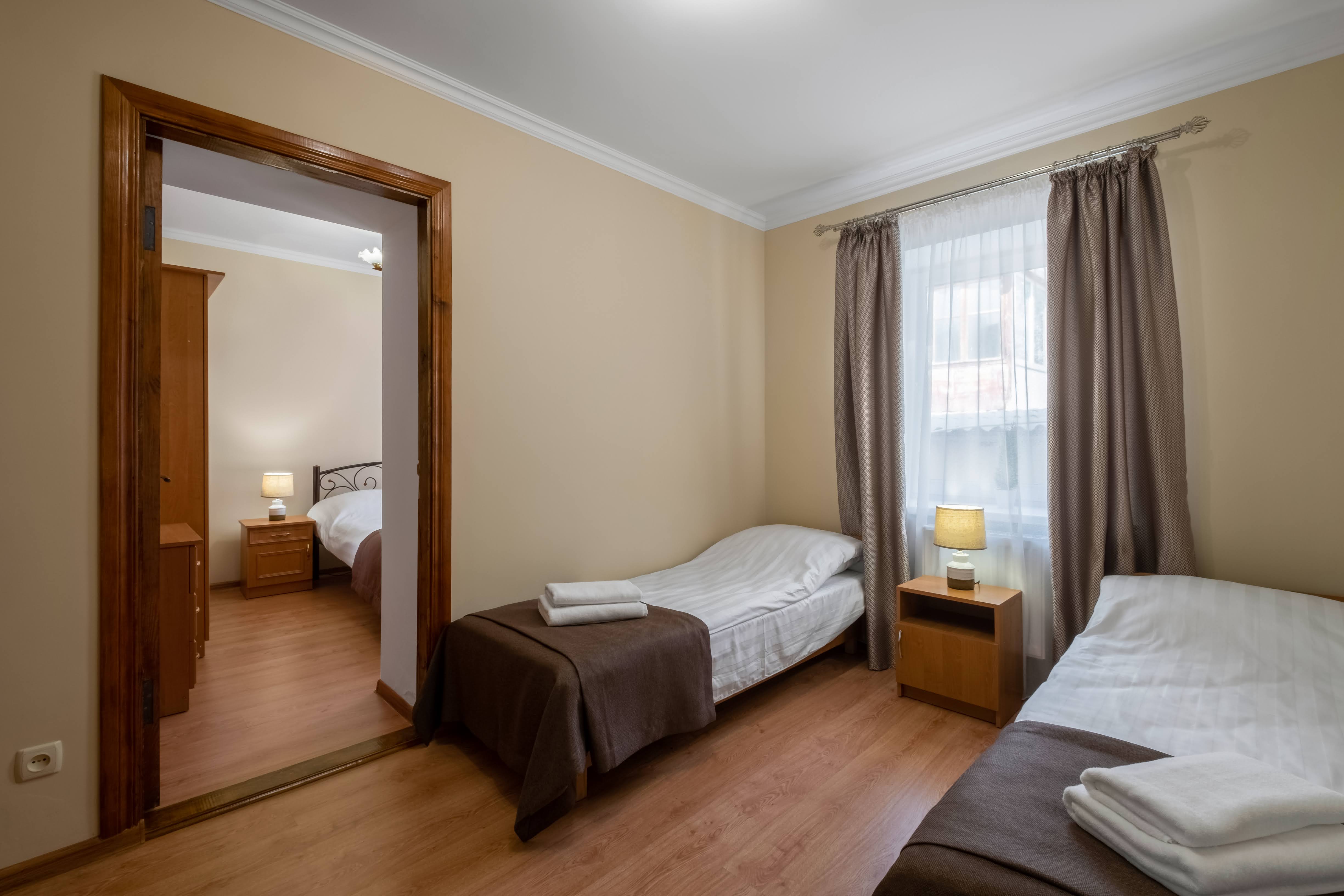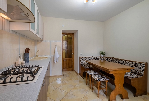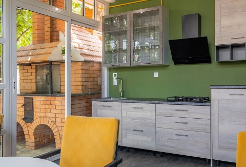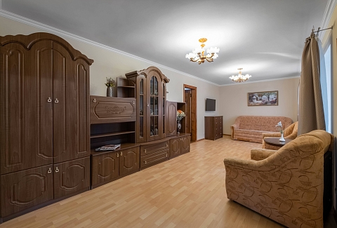 В номере: вешалка, диван раскладной, зеркало, комод, кресла, кровати односпальные, кровать двуспальная, кухонная мебель, прикроватные тумбочки, столик журнальный, стол обеденный, стулья, тумба, шкаф, кондиционер, микроволновая печь, набор посуды, плита газовая, стиральная машина, телевизор, холодильник, чайный набор посуды, электрочайник