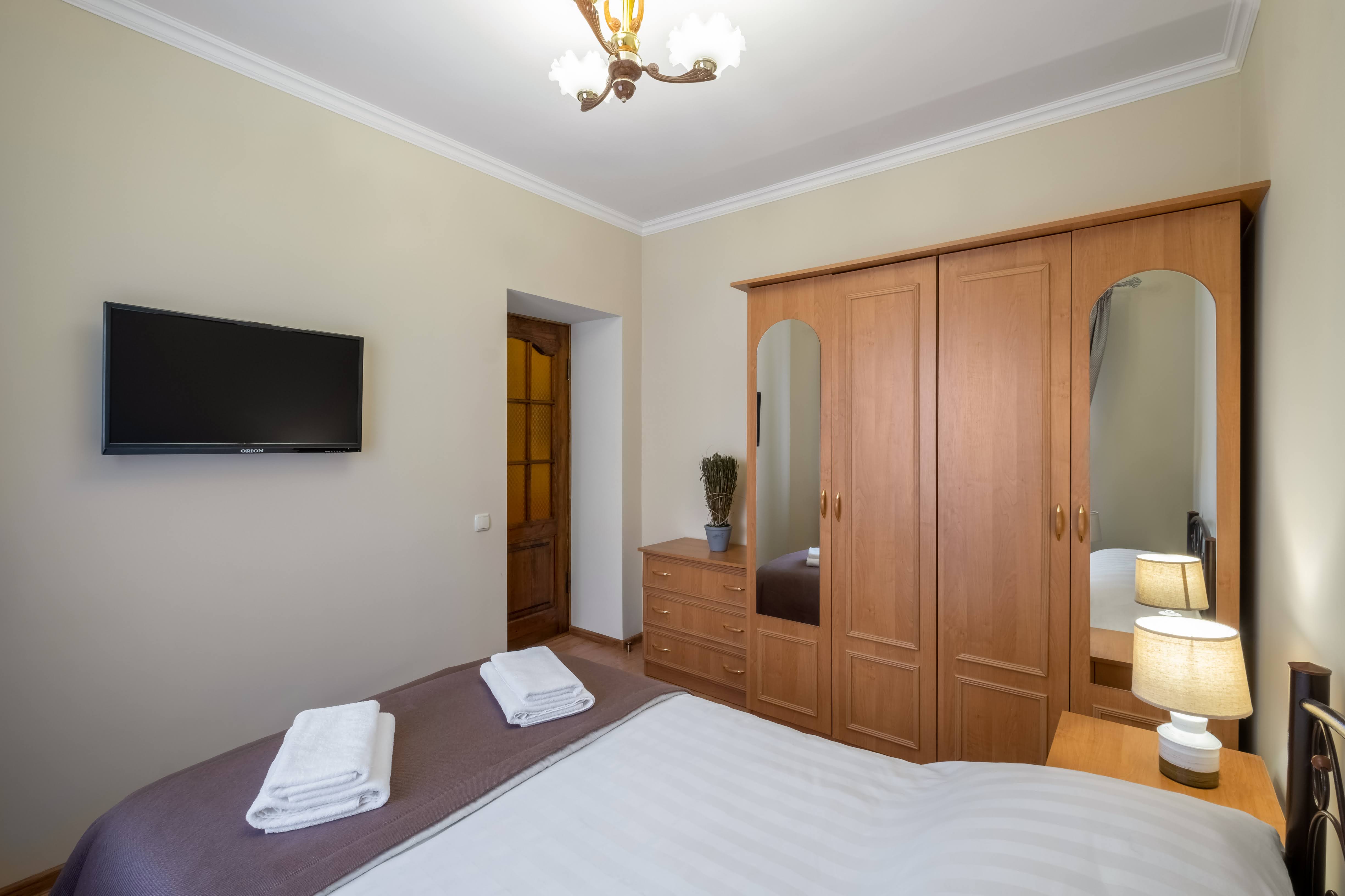В номере: гардеробная, зеркало, комод, кровать двуспальная, прикроватные тумбочки, тумба, шкаф, кондиционер, мини-холодильник, телевизор, электрочайник