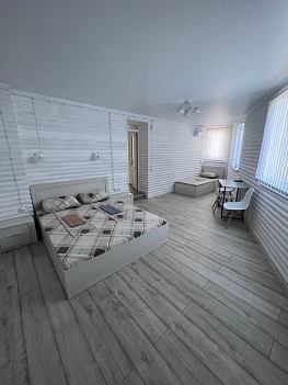 В номере: вешалка, диван, зеркало, кровать двуспальная, прикроватные тумбочки, стол, стулья, шкаф, кондиционер, телевизор, холодильник
