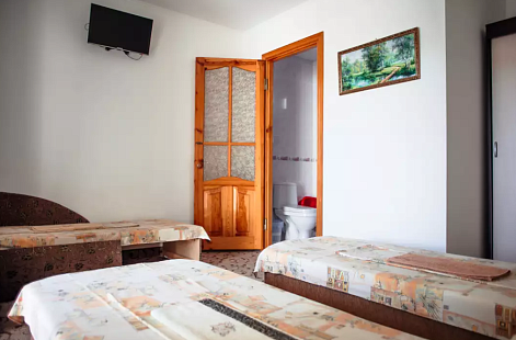 В номере: вешалка, зеркало, кровати односпальные, кровать двуспальная, прикроватные тумбочки, стол, стулья, шкаф, кондиционер, телевизор, холодильник