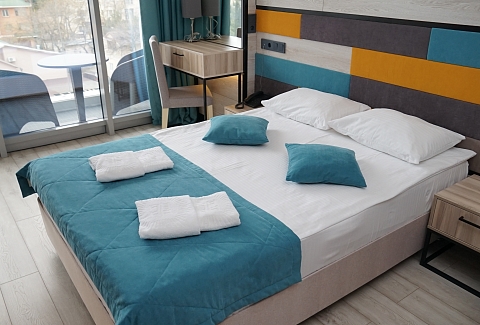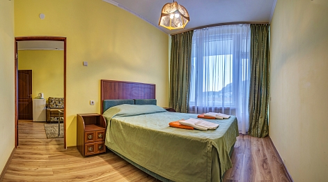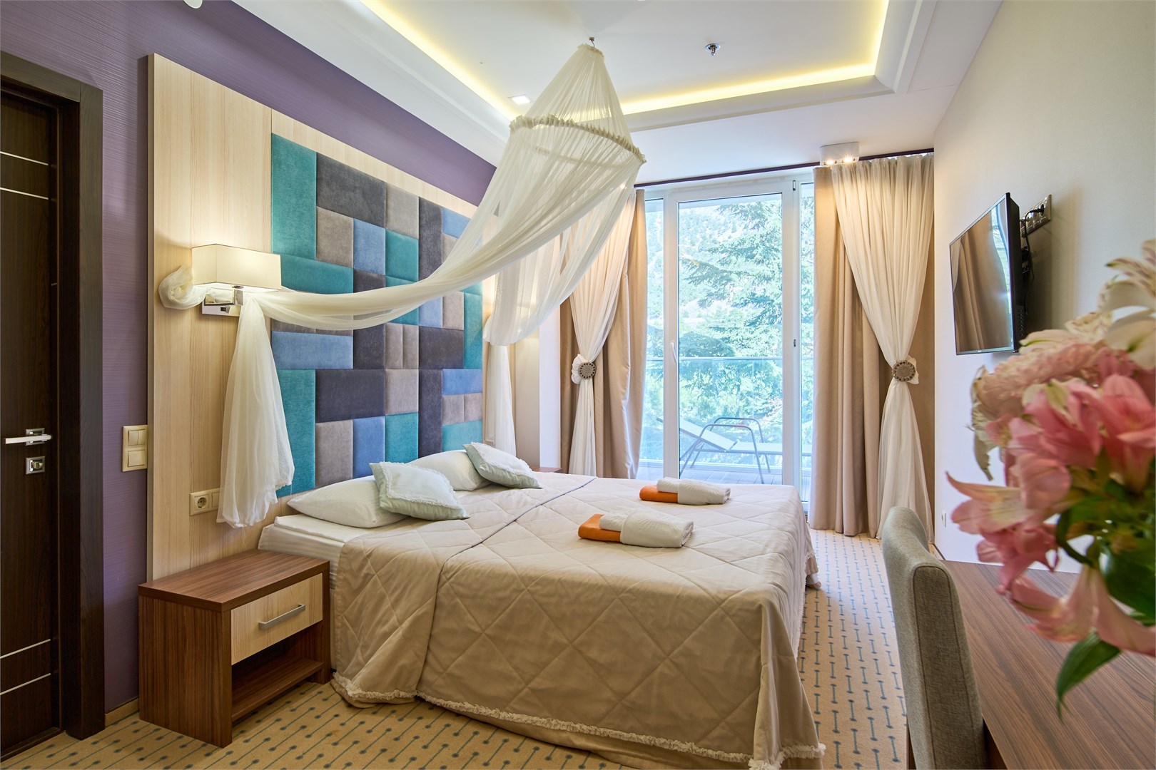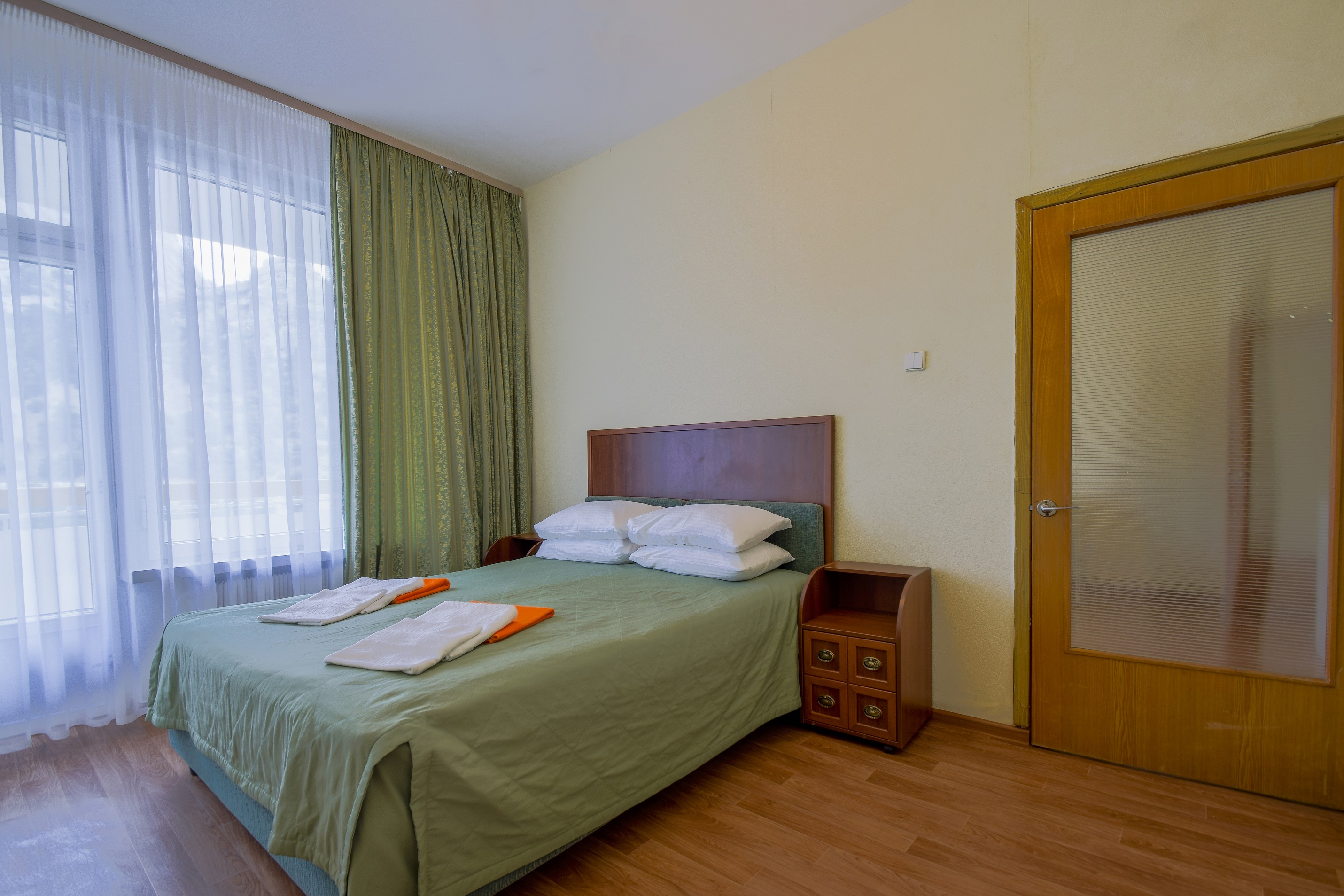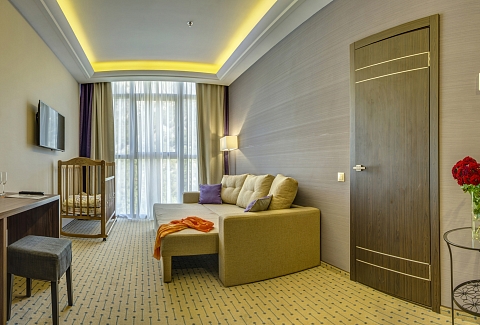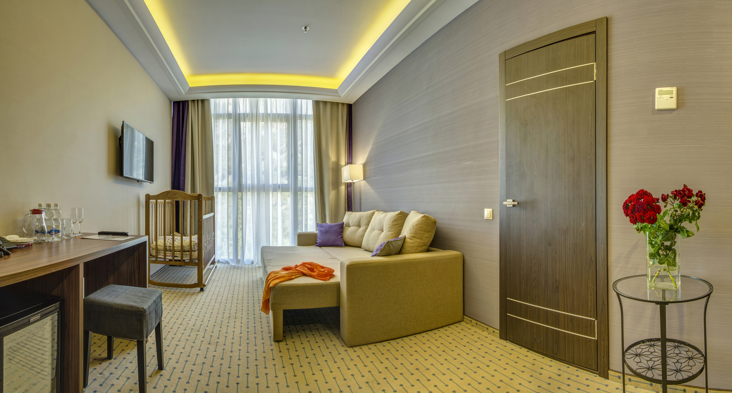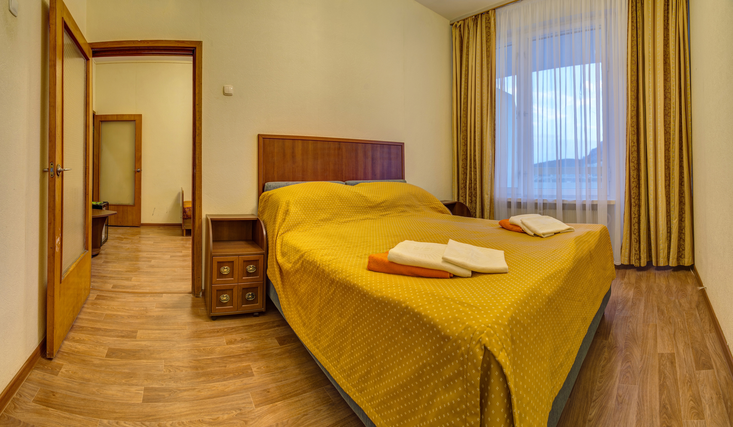 В номере: вешалка, диван раскладной, зеркало, кровать двуспальная, прикроватные тумбочки, стол, стулья, шкаф встроенный, гладильная доска, кондиционер, сейф, телевизор, телефон, холодильник, чайный набор посуды, электрочайник