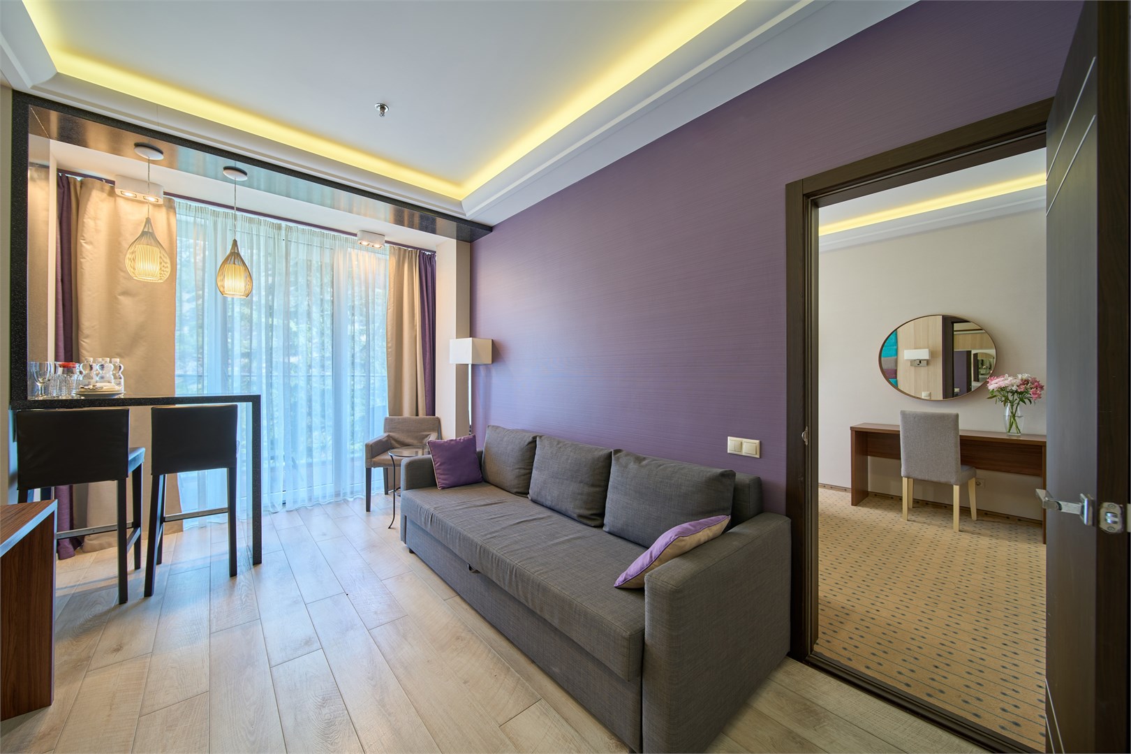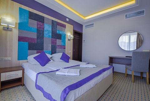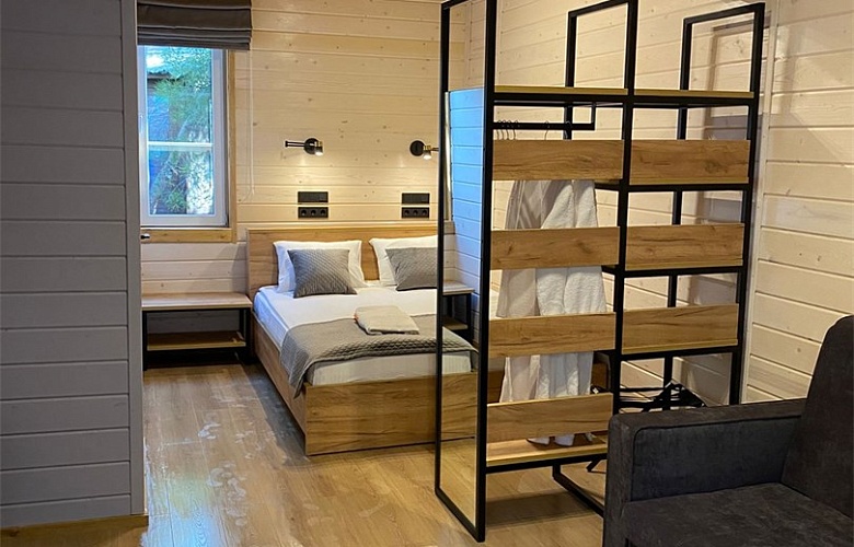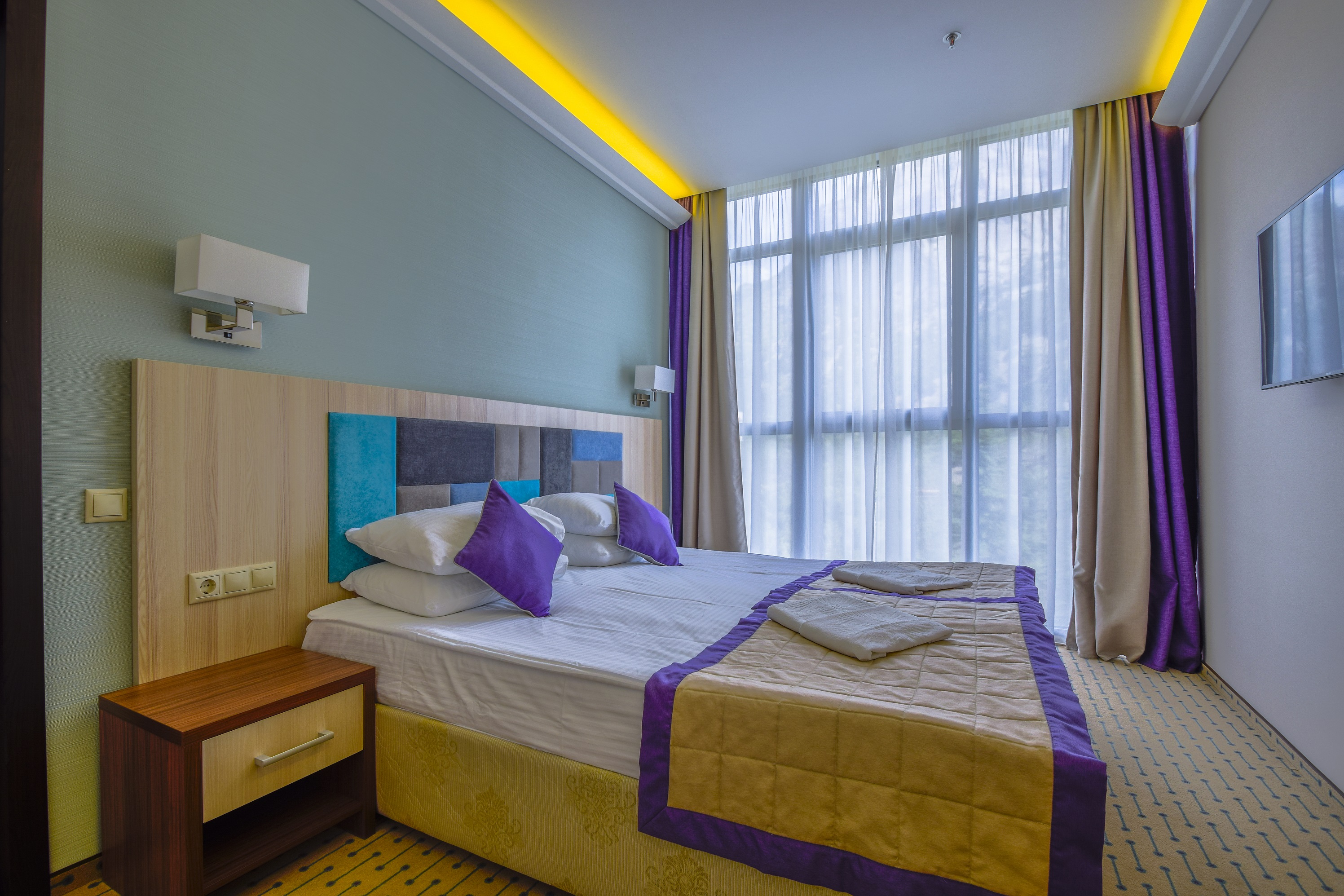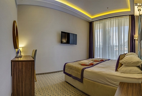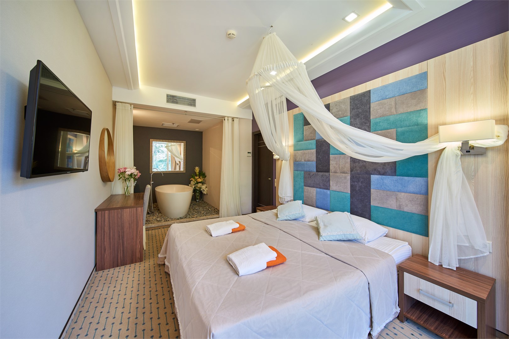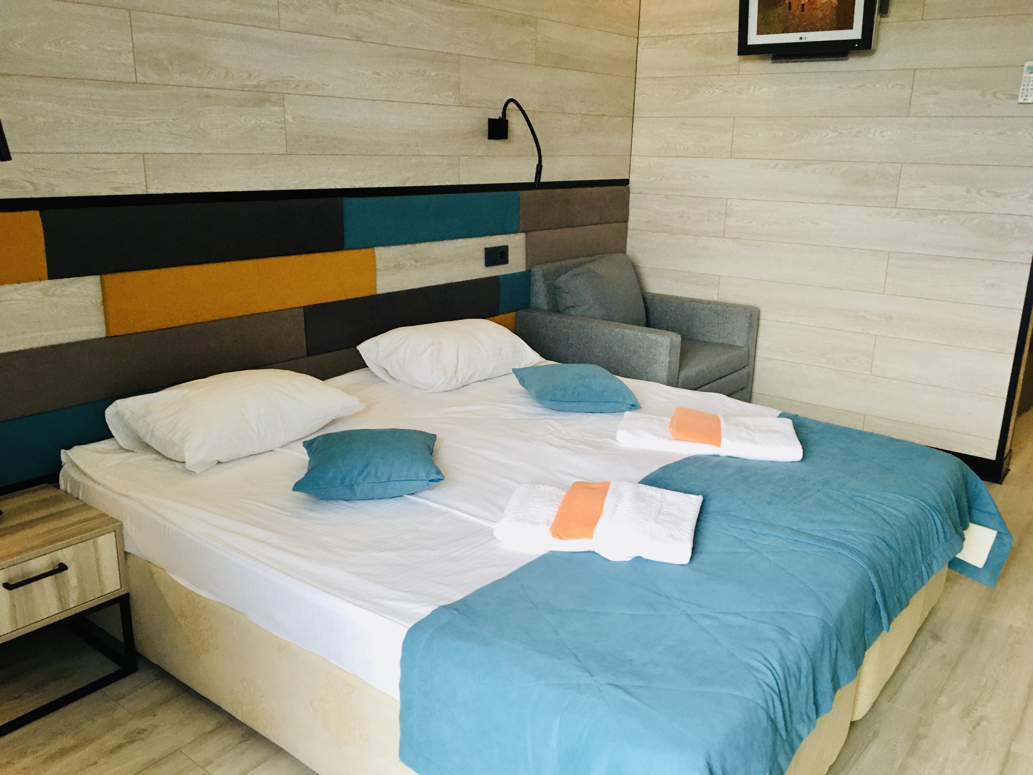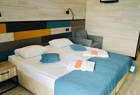 В номере: вешалка, диван раскладной, зеркало, кровать двуспальная, прикроватные тумбочки, стол, стулья, шкаф встроенный, гладильная доска, кондиционер, сейф, телевизор, телефон, холодильник, чайный набор посуды, электрочайник
