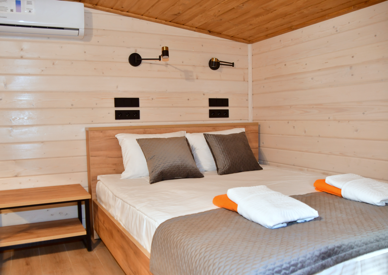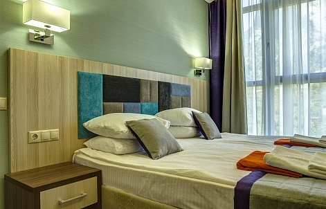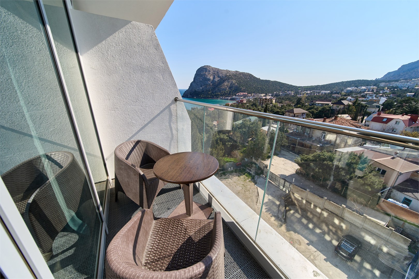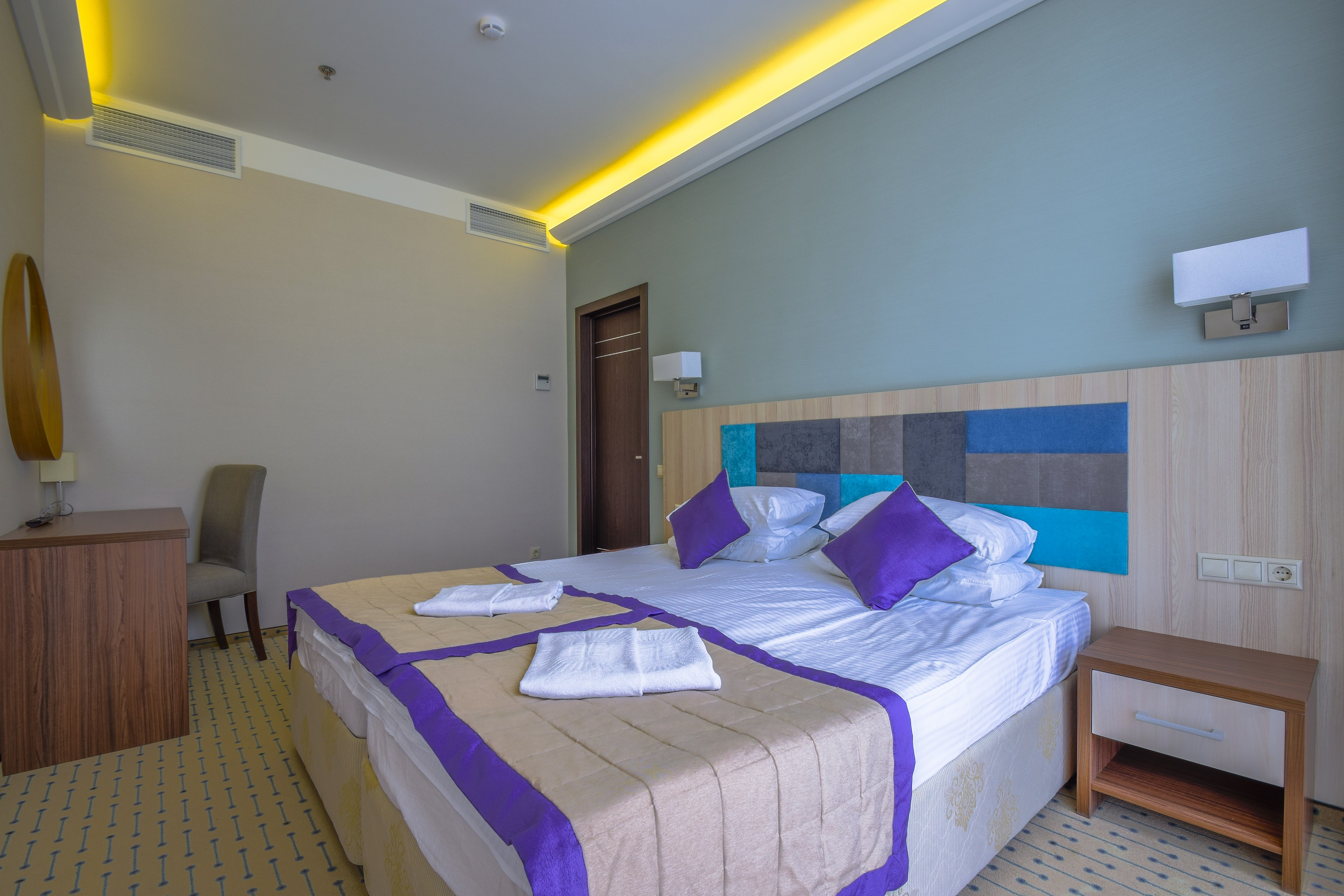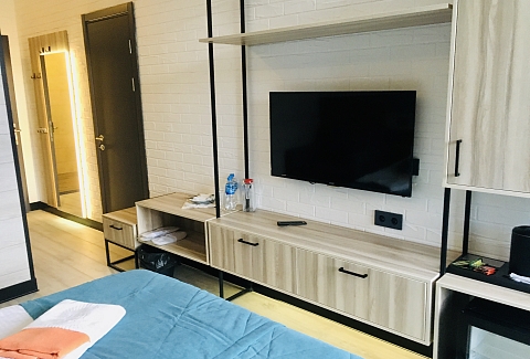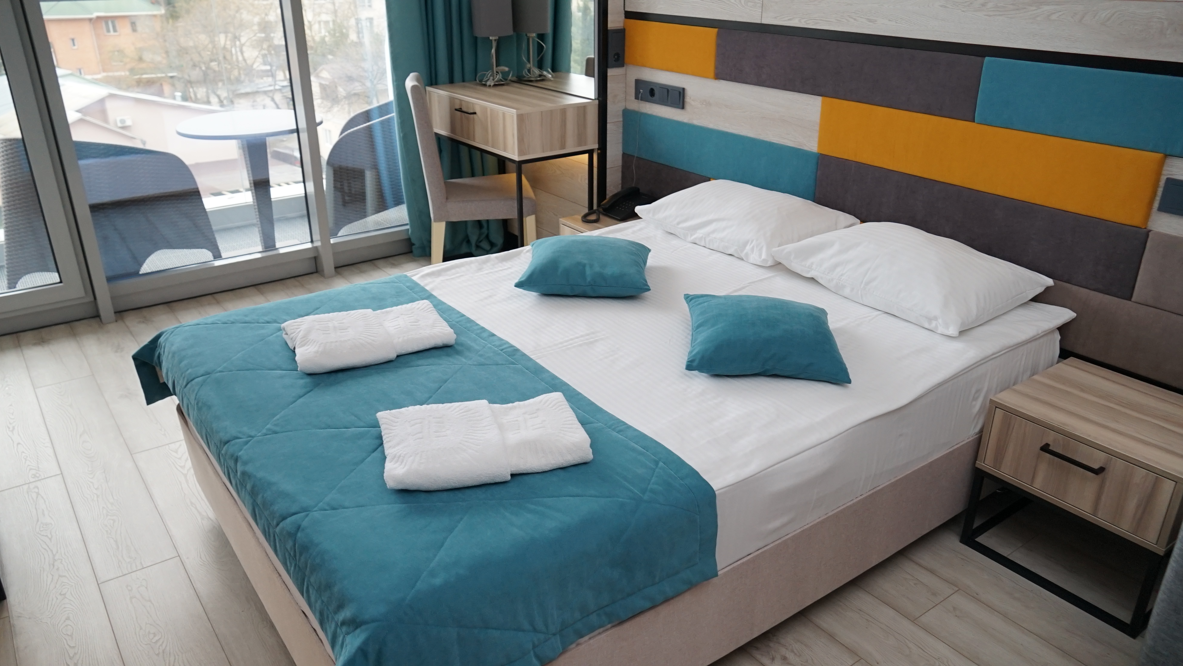 В номере: вешалка, диван раскладной, зеркало, кровать двуспальная, прикроватные тумбочки, стол, стулья, шкаф встроенный, гладильная доска, кондиционер, сейф, телевизор, телефон, холодильник, чайный набор посуды, электрочайник