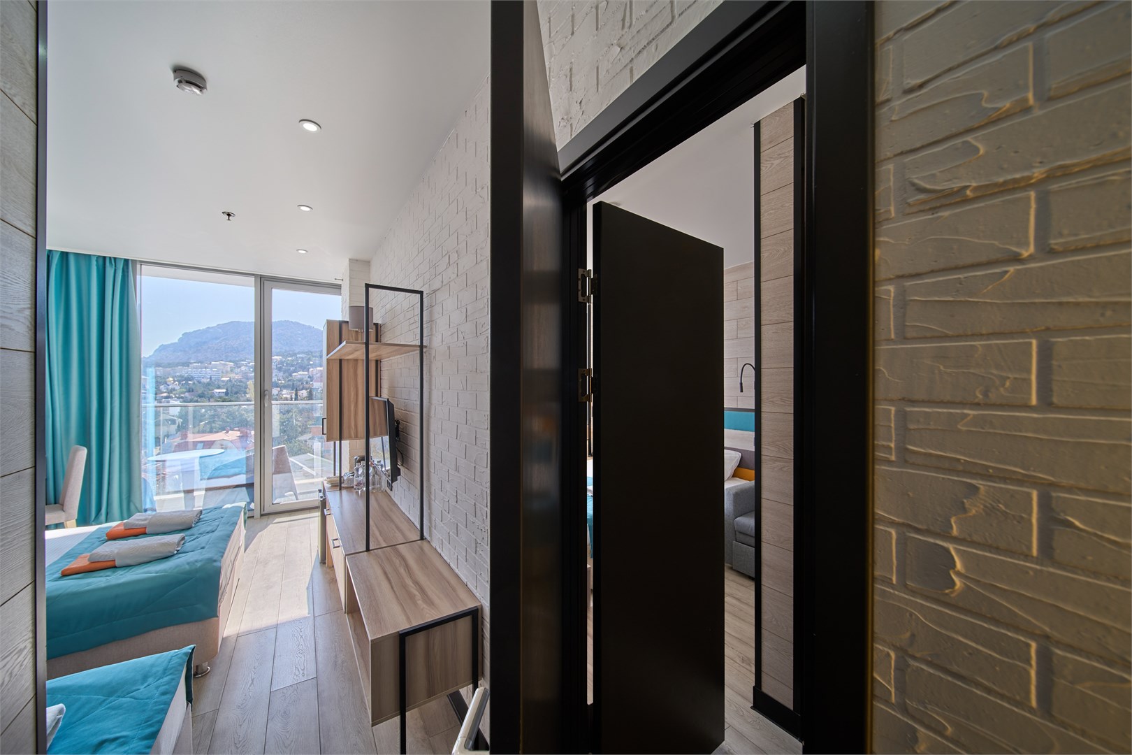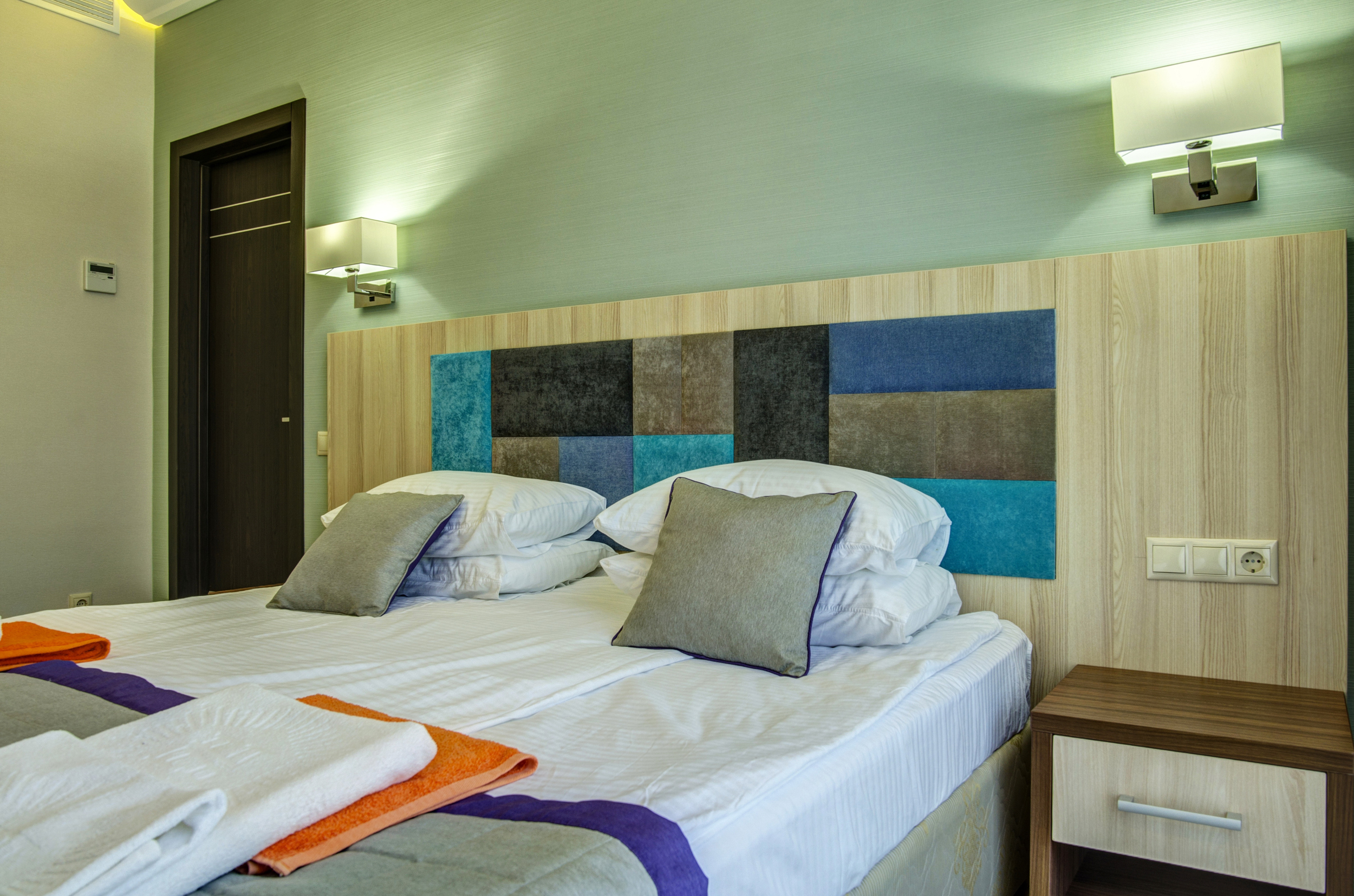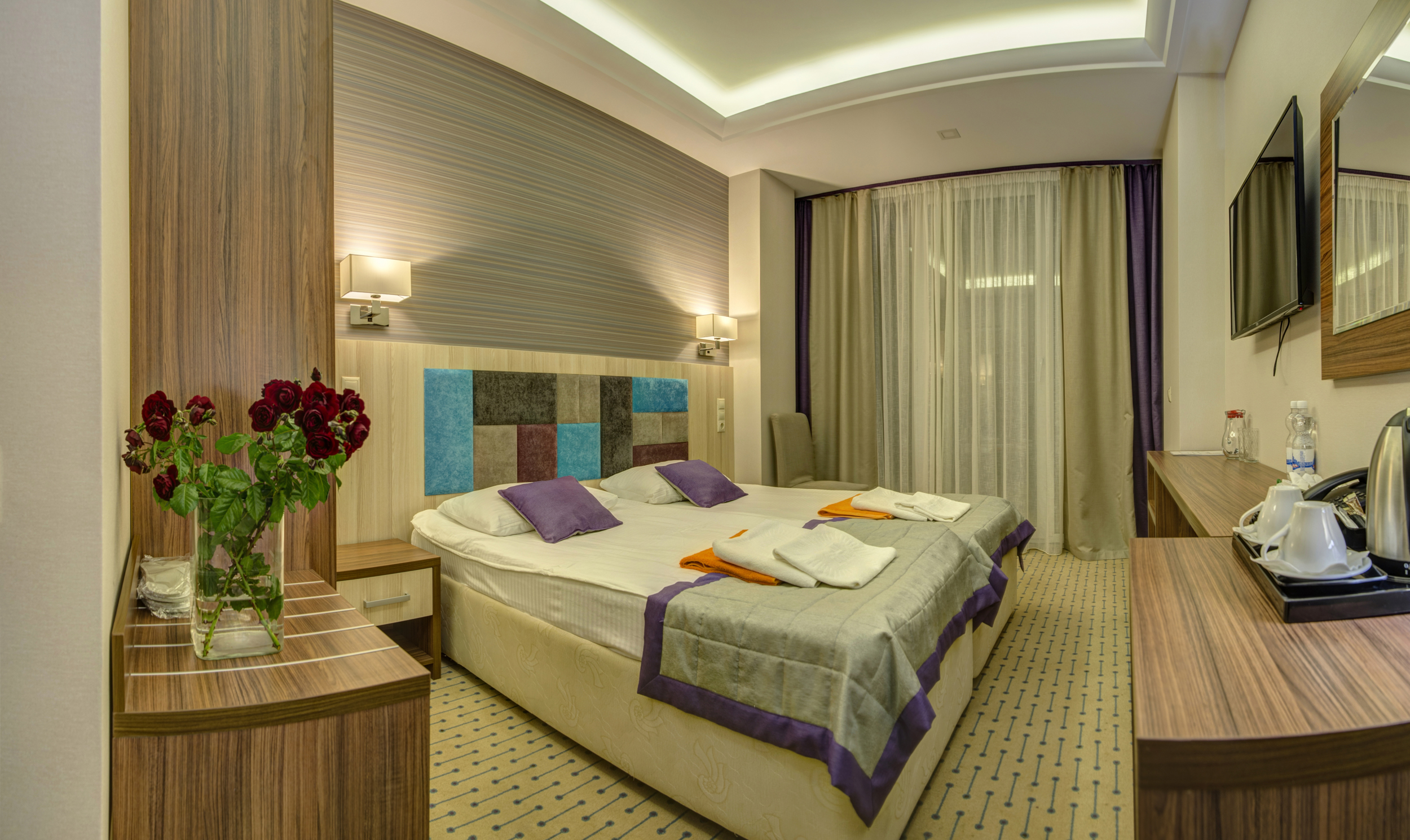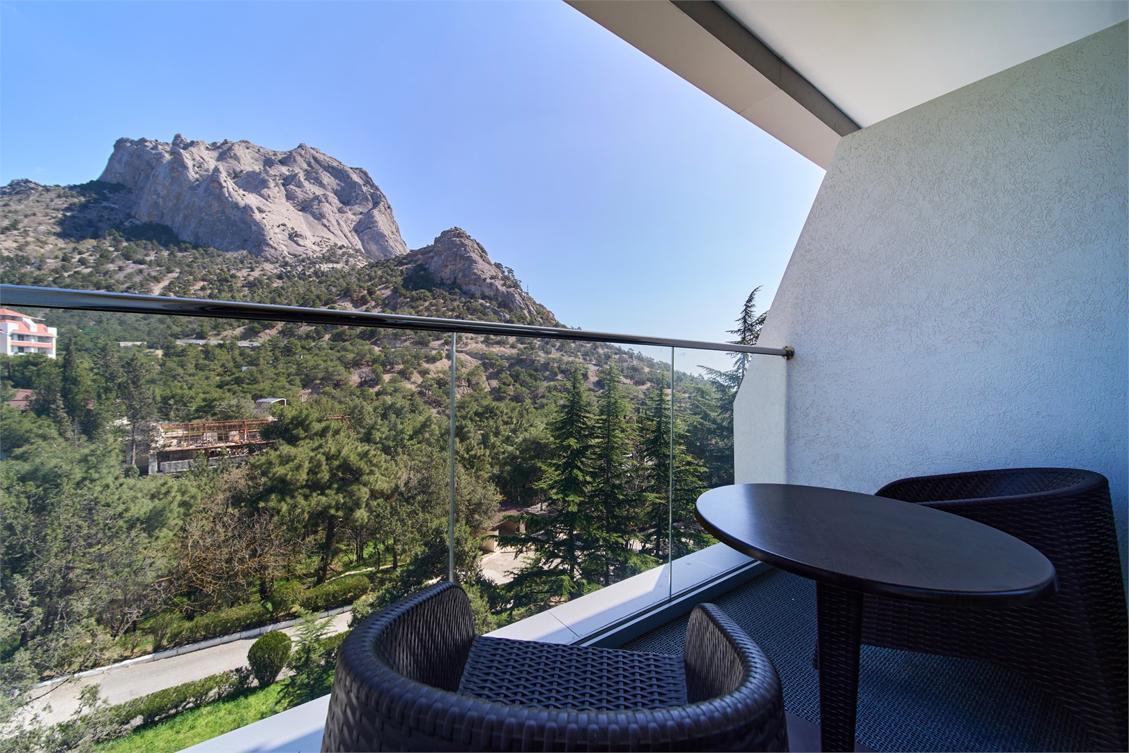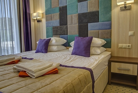 В номере: вешалка, диван раскладной, зеркало, кровать двуспальная, прикроватные тумбочки, стол, стулья, шкаф встроенный, гладильная доска, кондиционер, сейф, телевизор, телефон, холодильник, чайный набор посуды, электрочайник