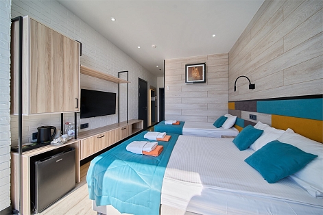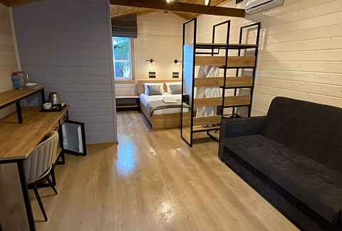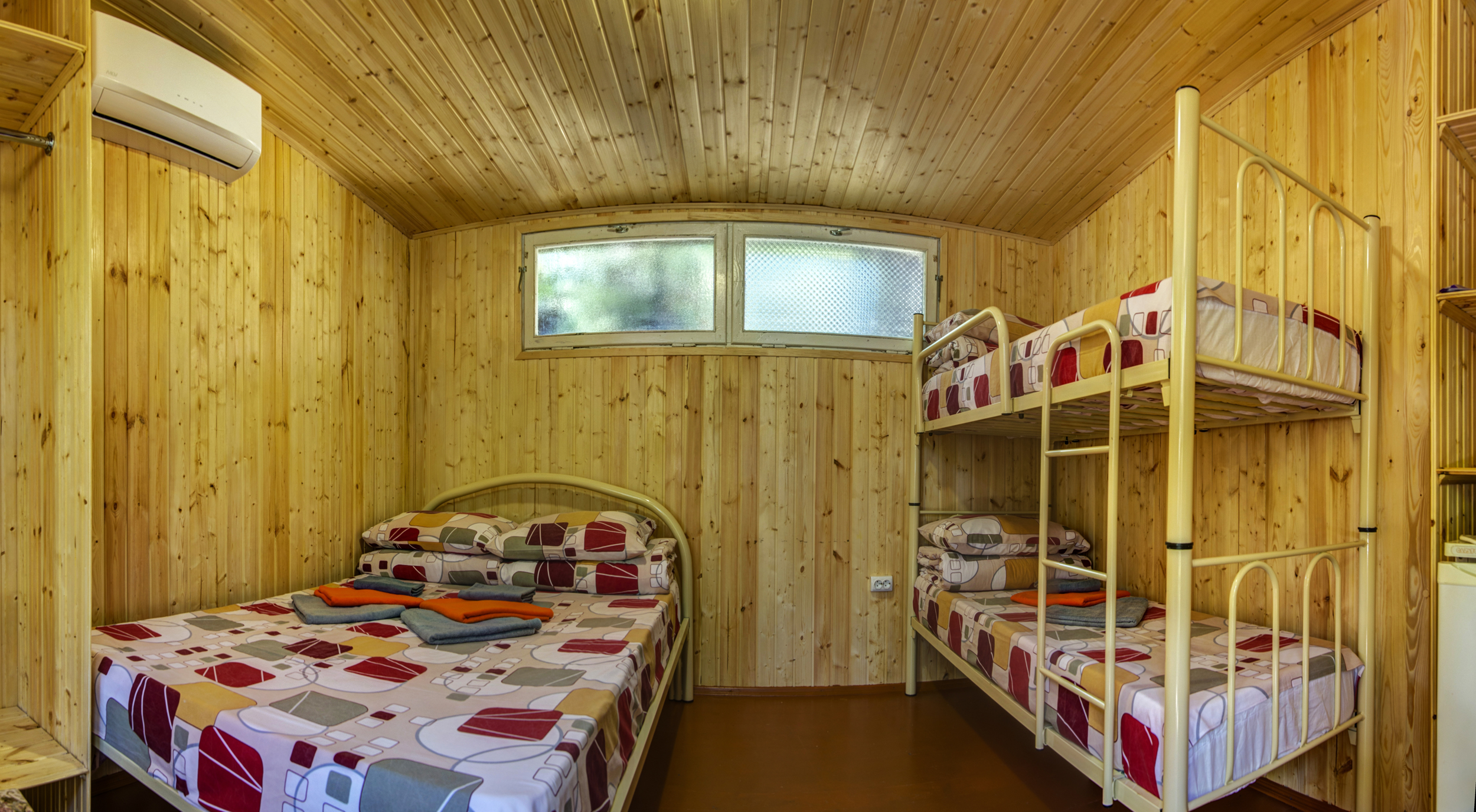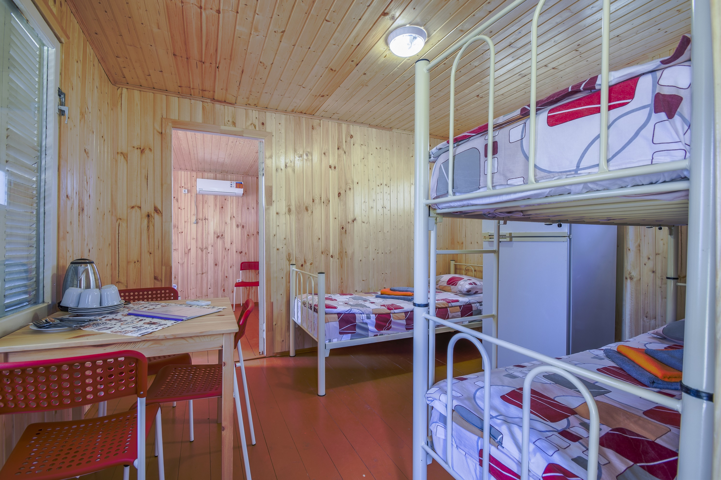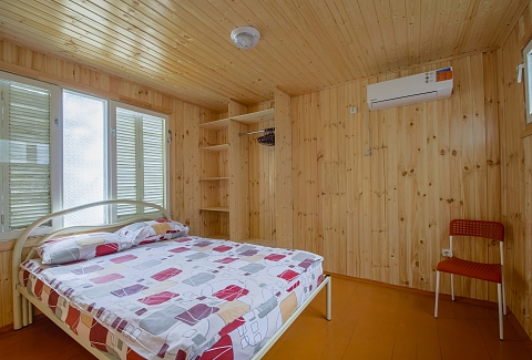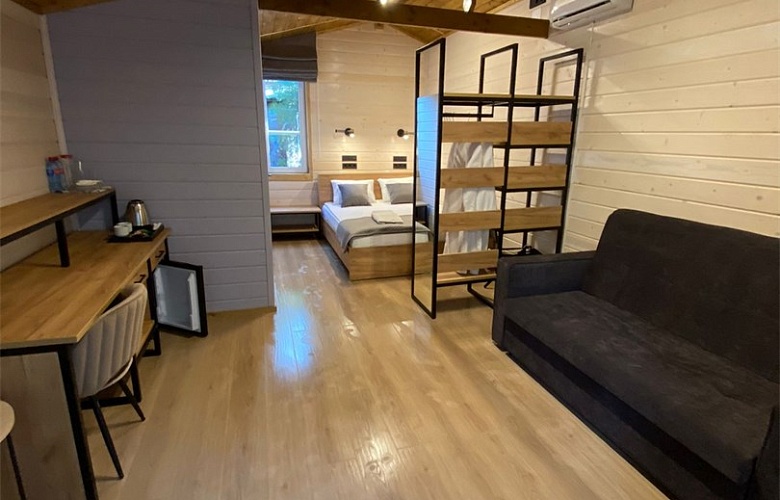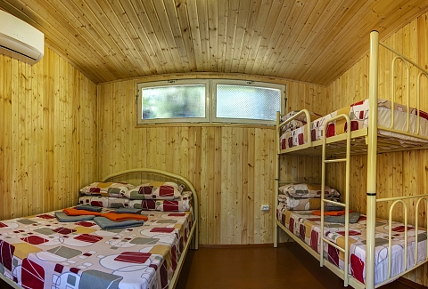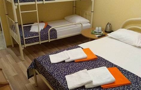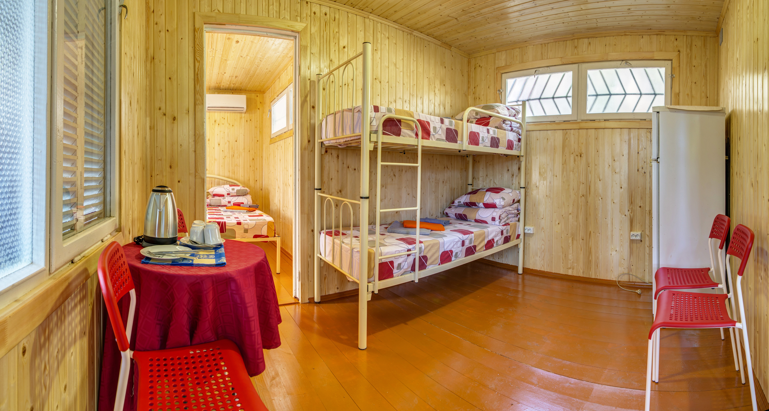 В номере: вешалка, зеркало, кровать двуспальная, кровать двухъярусная, прикроватные тумбочки, стулья, шкаф, кондиционер, мини-холодильник, набор посуды, телевизор ЖК, электрочайник