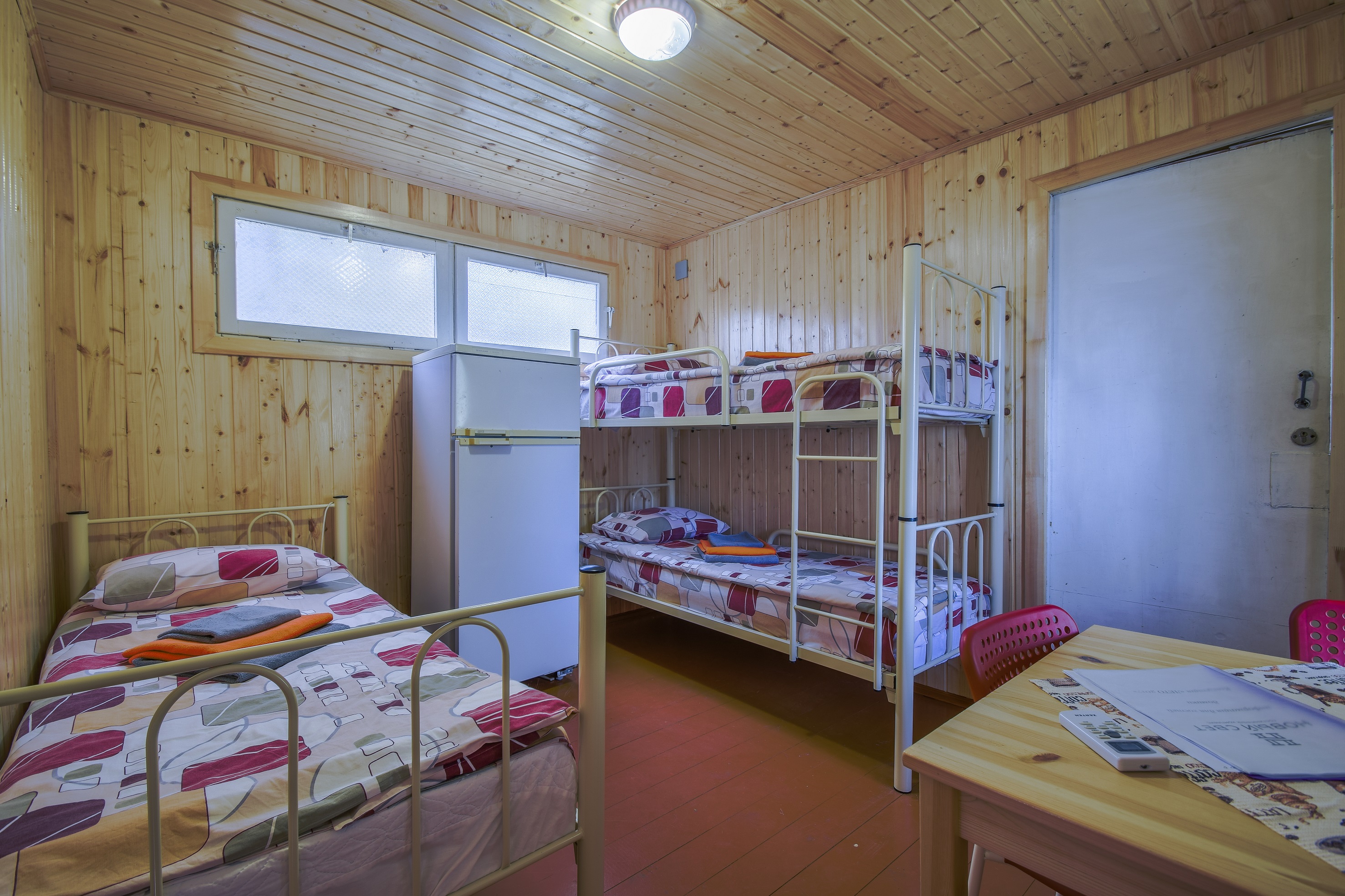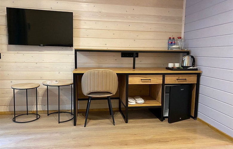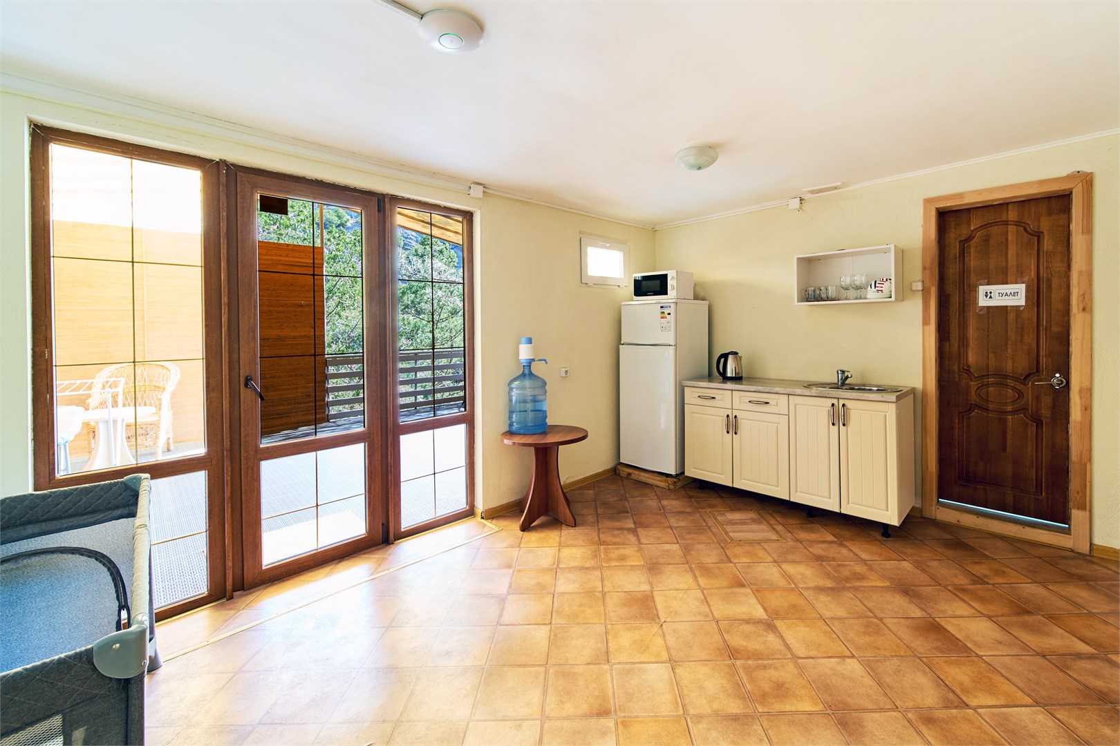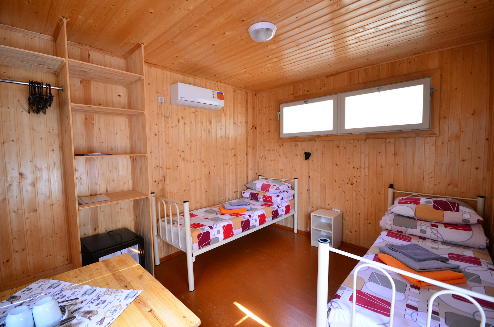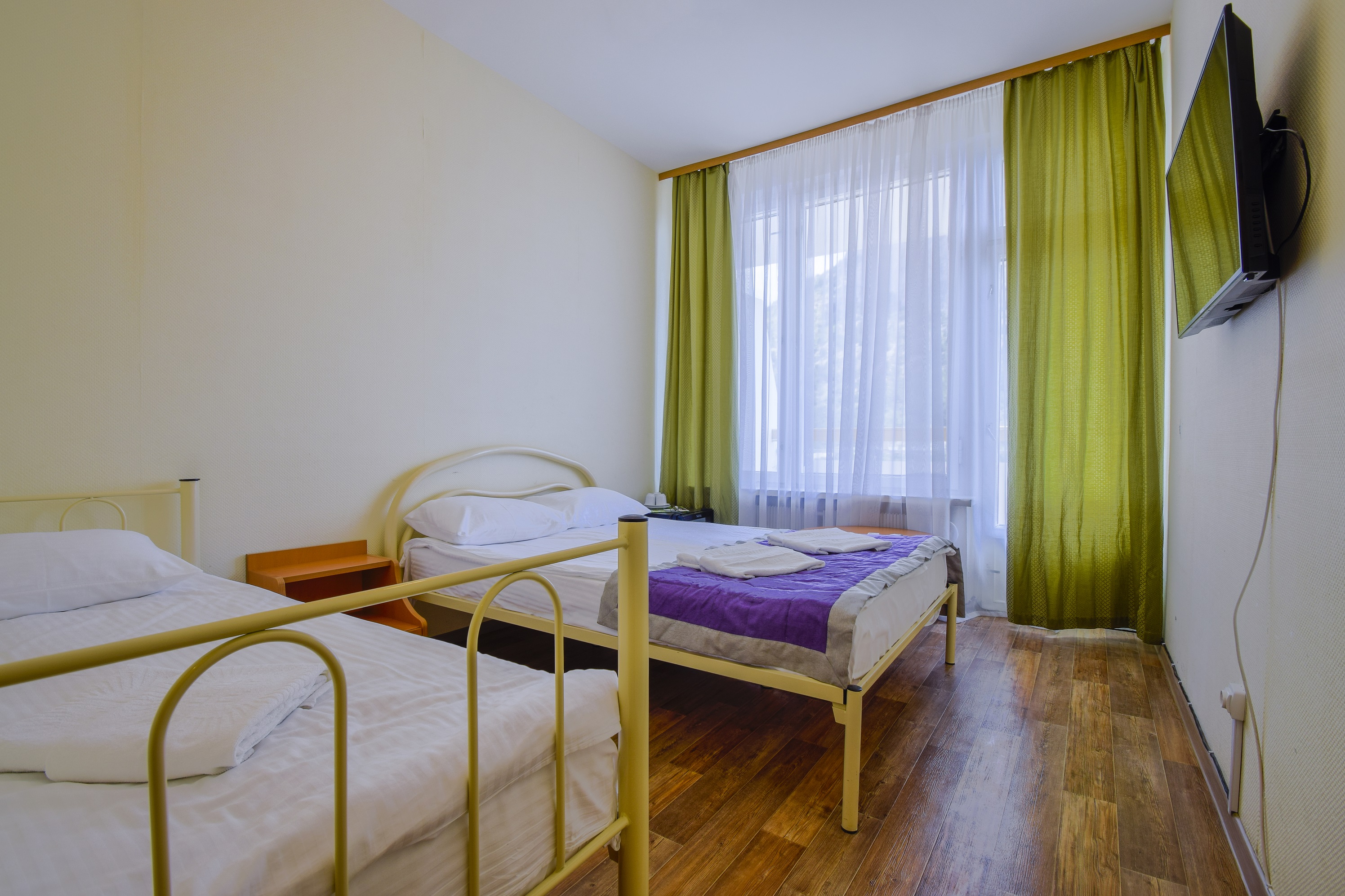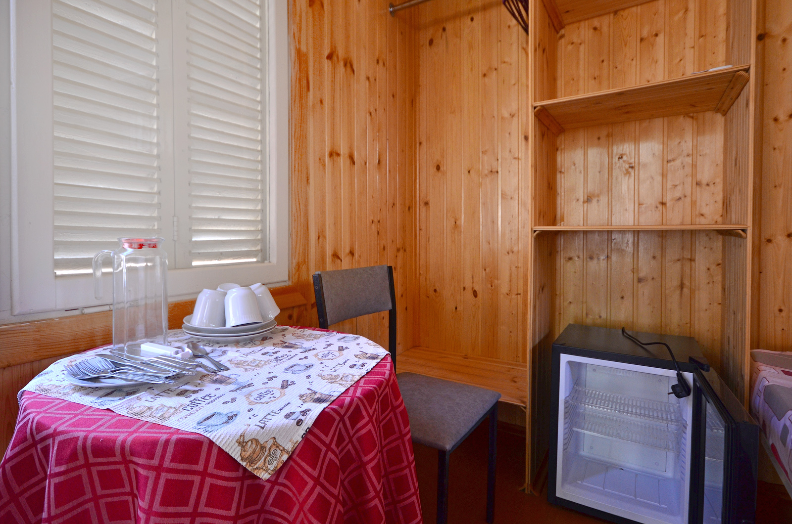В номере: вешалка, зеркало, кровать двуспальная, кровать двухъярусная, прикроватные тумбочки, стулья, шкаф, кондиционер, мини-холодильник, набор посуды, телевизор ЖК, электрочайник